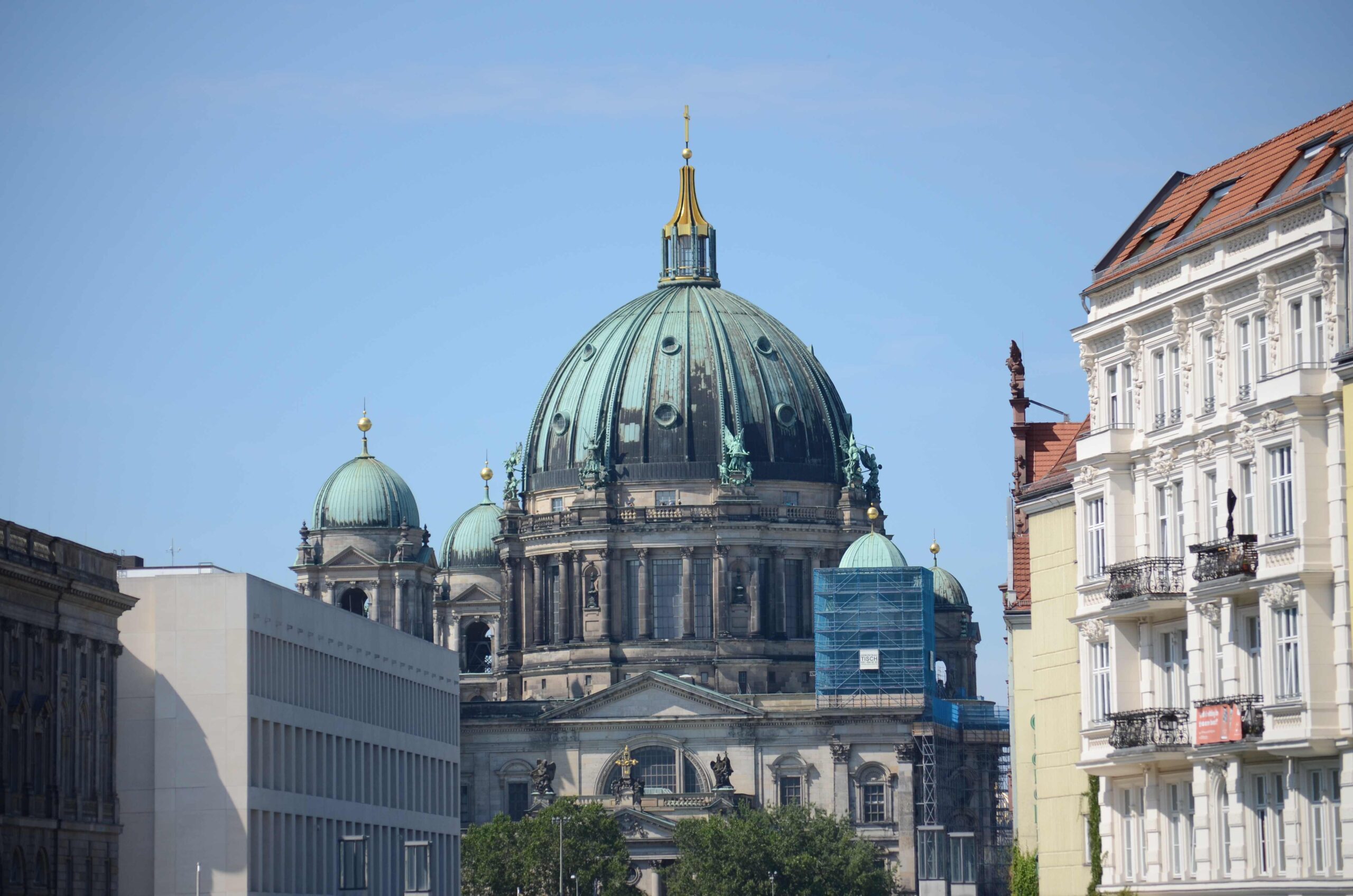 An der östlichen Seite des Lustgartens erhebt sich die Hauptfassade des Berliner Doms mit der zum Lustgarten geöffneten großen Vorhalle. In dem Zentralbau befindet sich unter der großen Mittelkuppel die Predigerkirche, an den Ecken umgeben vier Türme die Hauptkuppel. Stilistisch orientiert sich die Fassadengestaltung des Doms an den Formen der Hochrenaissance und des Barock (Nicola Vösgen).