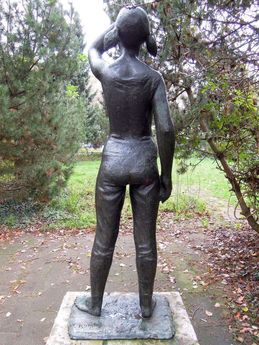 Die lebensgroße Mädchenfigur von Rommel steht auf einer flachen Plinthe. Das Standbild ist auf einem würfelförmigen, mit bossierten Steinen gemauerten Sockel aufgestellt. Auf der Rückseite der Plinthe die steht die Künstlerbezeichnung. Die schlanke junge Frau ist mit dünnstoffigem Hemd und Hose bekleidet, die den jugendlichen weiblichen Körper, besonders ihre Brüste, deutlich betonen. Aufrechtstehend, den Kopf etwas angehoben, die Beine offen im leichten Kontrapost, die Haare zu zwei buschigen Zöpfen gebunden, die seitlich vom Kopf steif abstehen, die rechte Hand lässig in der Hosentasche, linke Hand am Kopf, schaut sie jugendlich forsch über den Betrachter hinweg (Jürgen Tomisch).