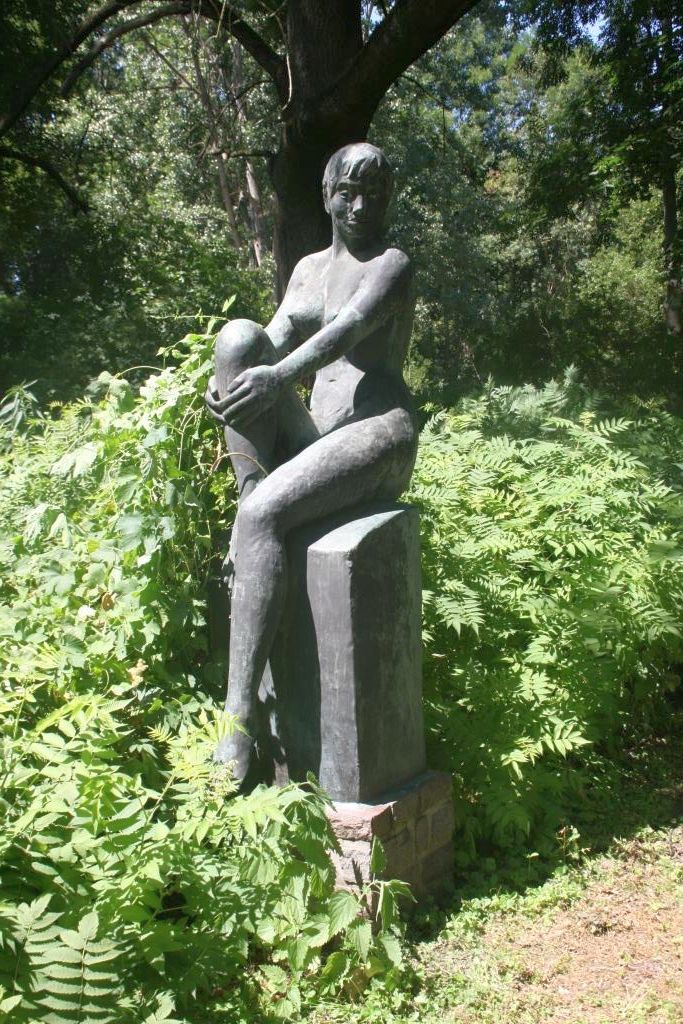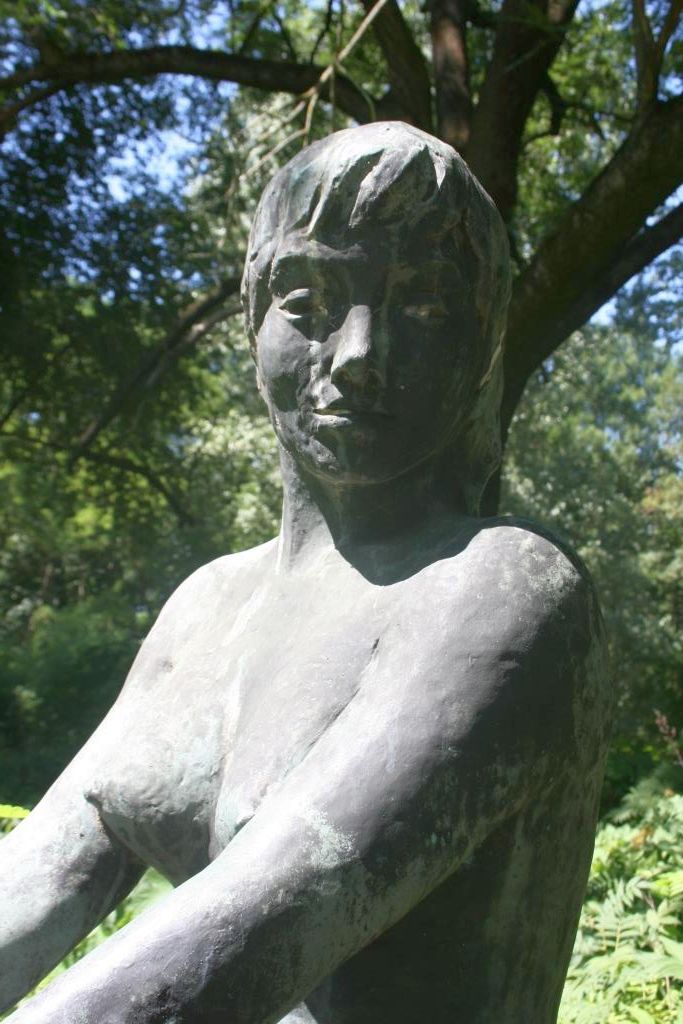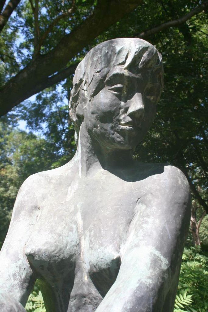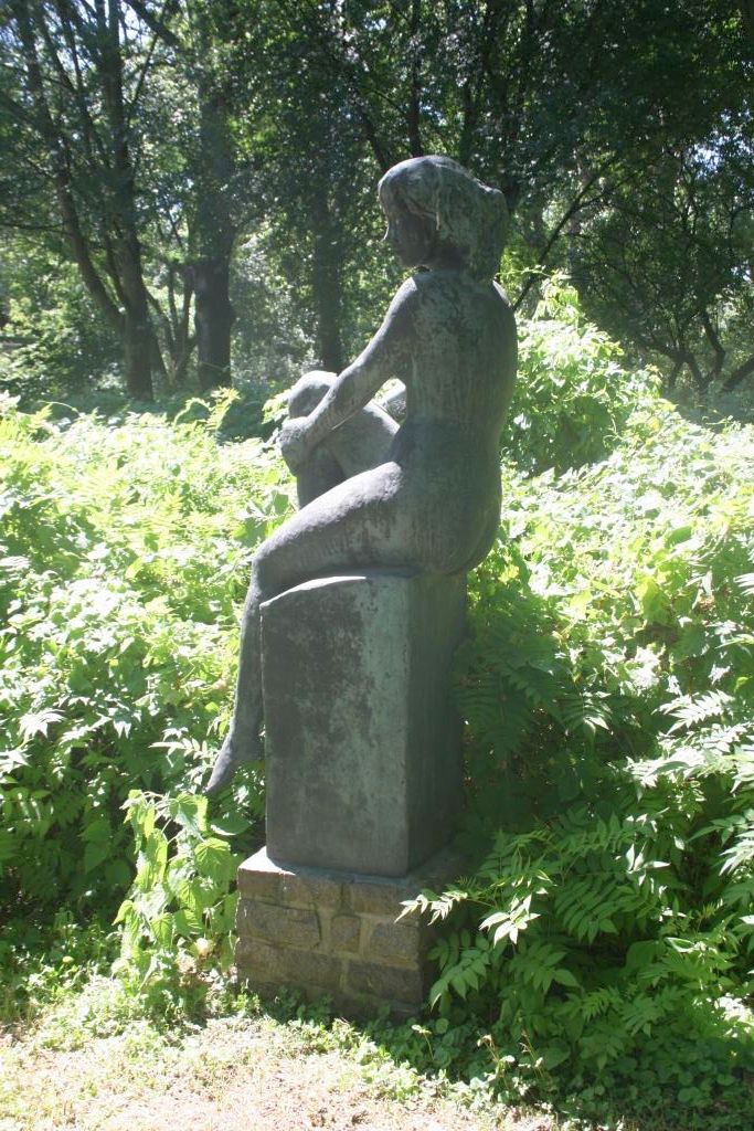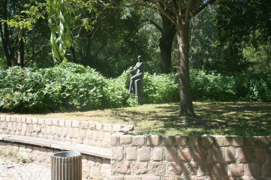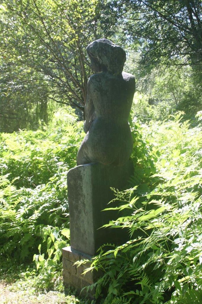 In einem durch eine Substruktionsmauer stabilisierten, höher gelegenen Grünbereich sitzt auf einem hohen, am oberen Ende unterhalb der Oberschenkel abfallen formulierten Sitzblock, eine nackte junge Frau in versonnener Haltung. Das linke Bein läßt sie herabhängen, das rechte Bein ist angewinkelt und setzt mit dem Fuß auf der Sitzblockkante auf. Die Hände sind unterhalb des rechten Kniees zusammengeführt und stabilieren den aufgesetzten Stand. Der Kopf ist entgegen dem durch das aufgesetzte Bein markierten Schwerpunkt der Plastik zur Seite gewendet. Der Blick unter kurzem Haar ist freundlich unbestimmt. Die Frau ist ideal gestaltet, wobei das Gesicht gegenüber dem naturalistisch und sorgfältig gebildeten Busen gestalterisch weniger differenziert erscheint und ein sinnliches Moment weitgehend ausschließt. Der bronzene Sitzblock steht auf einem niedrigen gemauerten, rechteckigen Sockel (Jörg Kuhn).