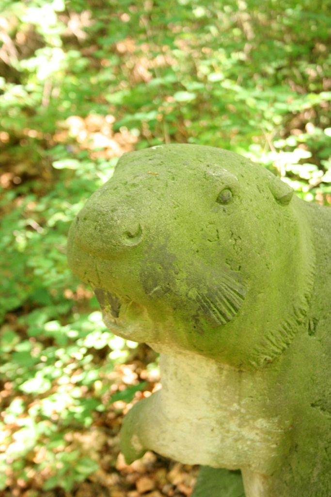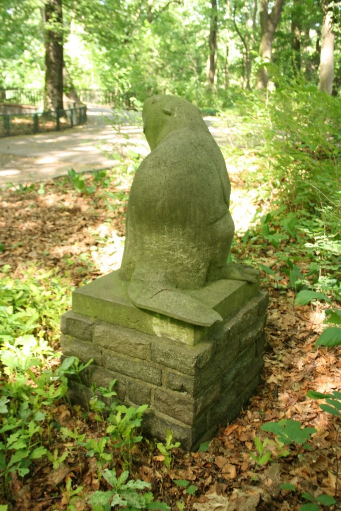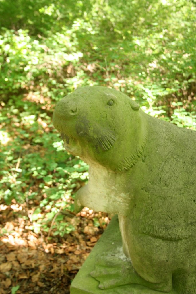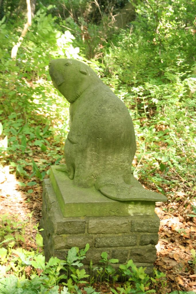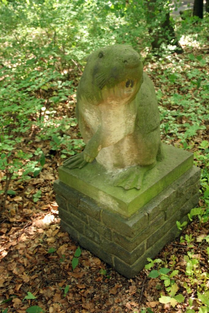 Dargestellt ist über quadratischer Plinthe ein aufrechtsitzender Biber. Die Figur überschneidet den gemauerten rechteckigen Sockel und die Plinthe sowohl im Bereich des Schwanzes als auch des Oberkörpers mit dem leicht gewendeten, wie witternd angehobenen Kopf.