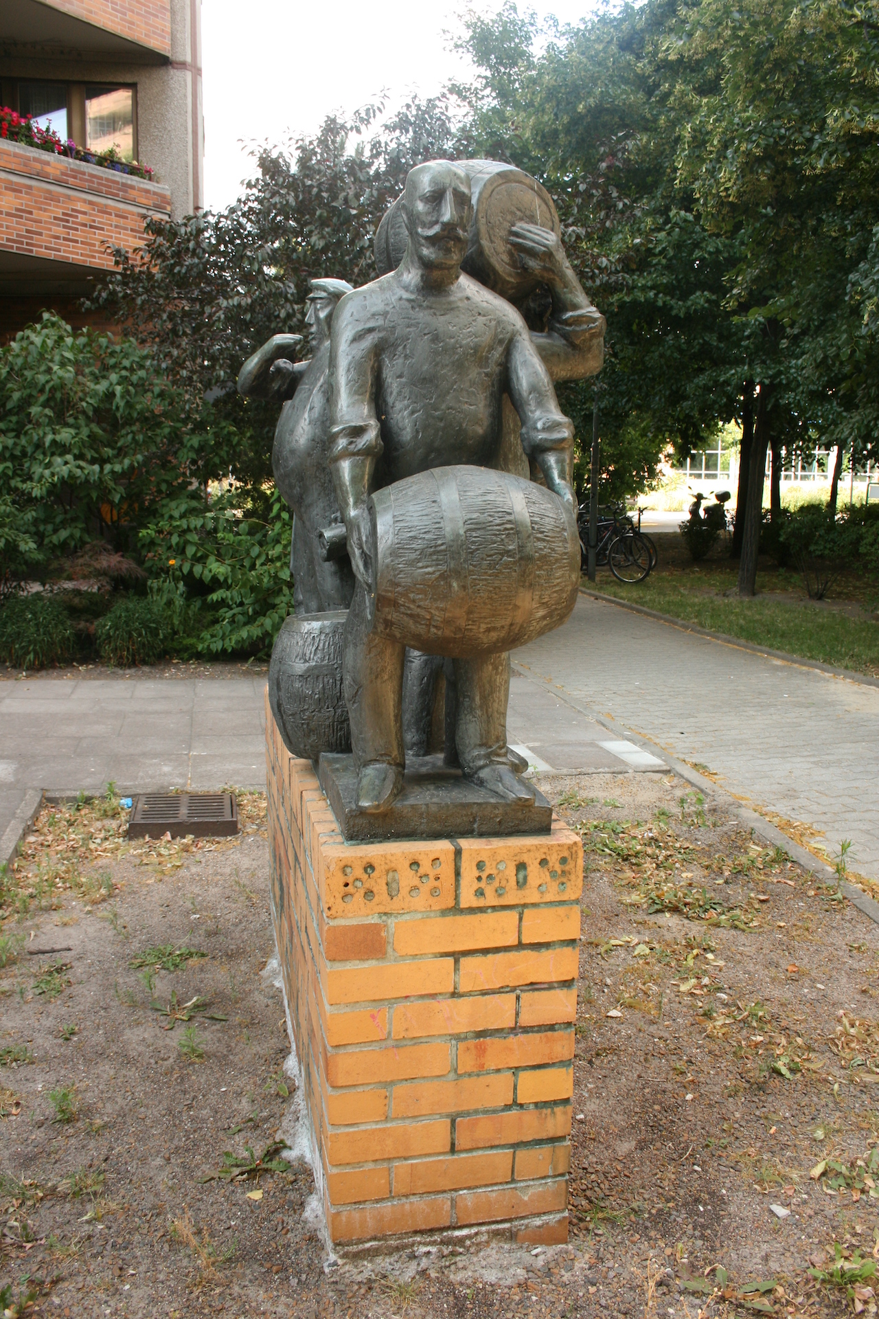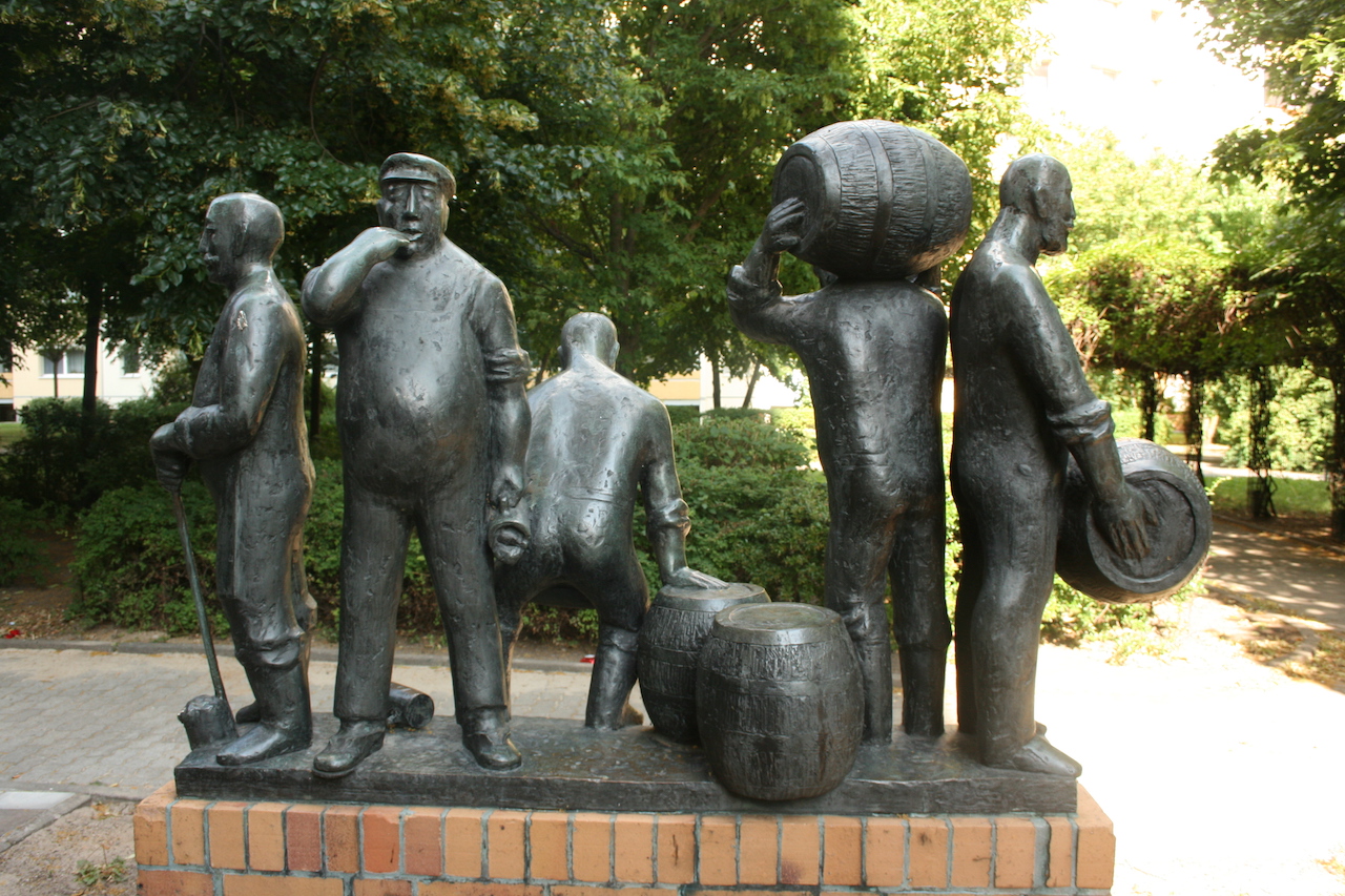 Auf einem schmalen, rechteckigen Sockel aus gelben Klinkerformsteinen steht auf längsrechteckiger Plinthe die mehrfigurige Gruppe von Mitarbeitern einer Brauerei bzw. eines auf den Transport von Bierfässern spezialisierten Transportunternehmens. Die fünf Figuren sind, trotz summarischer, geglätteter Formulierung deutlich aus Menschen aus einer historischen Epoche gekennzeichnet. Besonders auffällig wird dies bei der Barttracht. Die vier sichtbaren Bierfässer sind Holzdaubenfässer mit Stahlbändern. Die fünf Figuren zeigen unterschiedliche Stellungen und Tätigkeiten, darunter das Bierfass schleppen und den Bierkonsum und seine möglichen Folgen. Es ist eine Genregruppe, die die Arbeit des Bierfass-Ausfahrens im 19. und frühen 20. Jahrhundert darstellen soll (Jörg Kuhn).