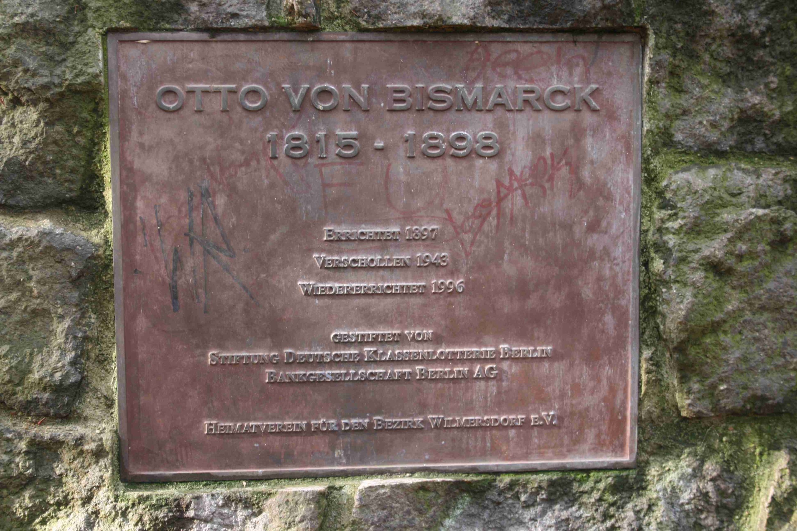»OTTO VON BISMARCK / 1815-1898 / ERRICHTET 1897 / VERSCHOLLEN 1943 / WIEDERERRICHTET 1996 / GESTIFTET VON STIFTUNG DEUTSCHE KLASSENLOTTERIE BERLIN / BANKGESELLSCHAFT BERLIN AG / HEIMATVEREIN FÜR DEN BEZIRK WILMERSDORF E. V.«