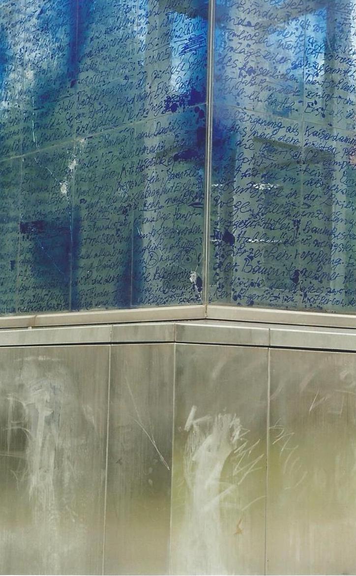 Der 15 Meter hohe Brunnen besteht aus übereinander gestapelten Kuben aus mundgeblasenem blauem Antikglas. Das Brunnenwasser wird mit einer Pumpe von oben über die Skulptur geleitet. Es handelt sich bei dem von Hella Santarossa gestalteten Kunstobjekt um eine Brunnenanlage mit zentralem Monument, einem Obelisken aus bläulich schimmernden Glas. Der Obelisk, bestehend aus sieben unterschiedlich großen, nach oben kleiner werdend aufeinander gestapelten Glasquadern, steht auf einem quadratischen Sockel, der mit Edelstahlplatten verkleidet wurde. Die Glasquader sind aus einzelnen kleinformatigen Scheiben mundgeblasenen Antikglases zusammengesetzt. Darauf stehen in blauer Farbe von der Künstlerin handschriftlich geschriebene Texte „Zur Geschichte und zu Fragmenten zu unserer Zeit“ (Geschichte des Theodor-Heuss-Platzes bis hin zur Entstehung des Denkmals). Der Untergrund ist im unteren Bereich des Obelisken klar, nach oben hin wurde er immer stärker blau eingefärbt. Die handschriftliche Signatur steht an der Westseite. Im Inneren befindet sich ein Stahlskelett, das von außen sichtbar ist. Der Obelisk wird nachts beleuchtet. Die Brunnenanlage hat eine niedrige, als Sitzbank zu nutzende quadratische Einfassung, aus hellgrauen Granitplatten. Das Brunnenbecken ist mit Edelstahlplatten ausgekleidet (Susanne Kähler).