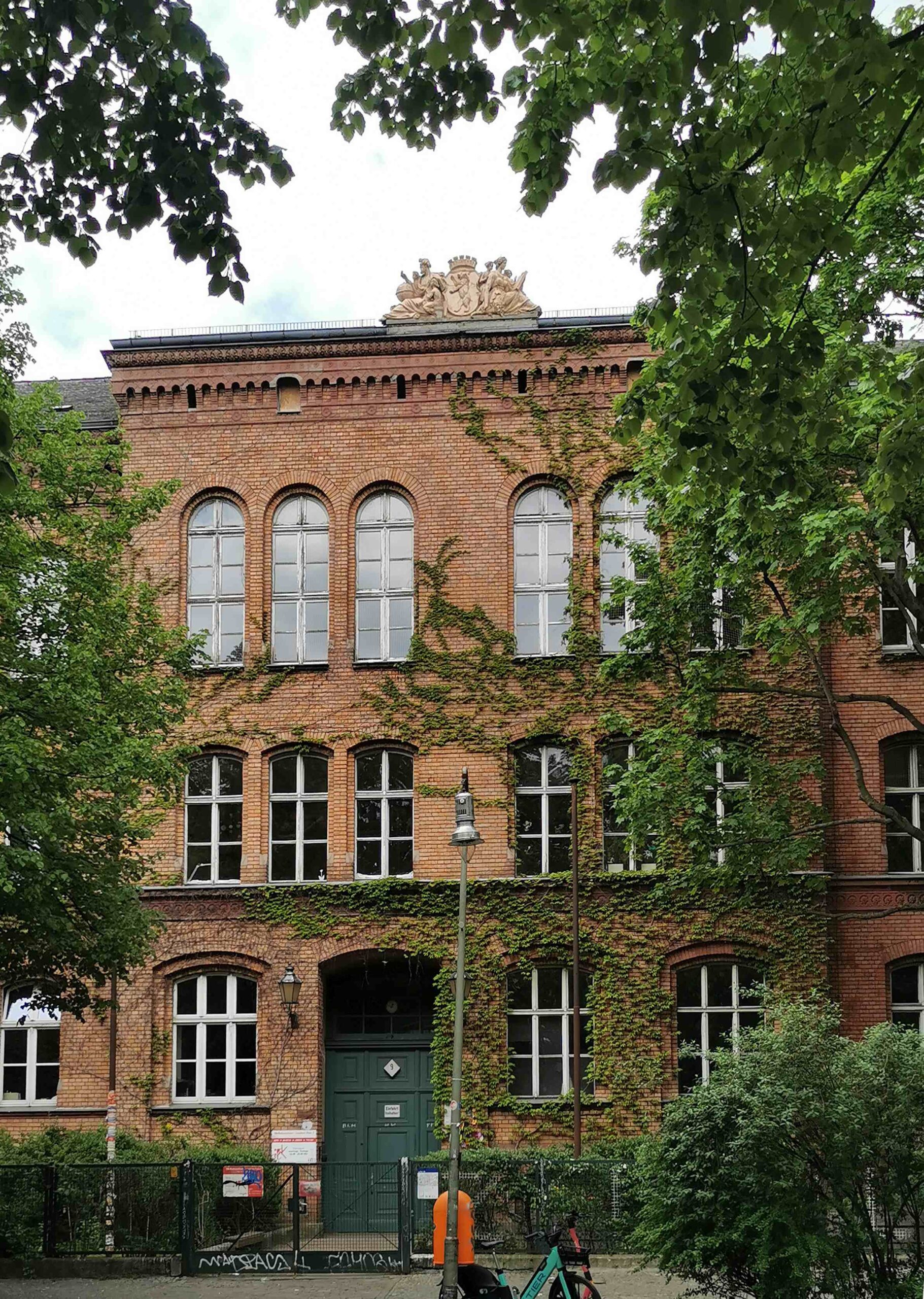Der dreigeschossige Schulbau ist als schlichter Ziegelrohbau ausgeführt. Die straßenseitige Fassade, die durch Bänder und Gesimse aus Terrakotta-Formsteinen gegliedert ist, zeigt einen symmetrischen Aufriss über 12 Achsen, die mittleren sechs Achsen sind als Risalit vor die Fassade gezogen. Das Obergeschoss des Mittelrisalits ist mit hoch aufragenden Rundbogenfenstern betont. Das Gebäude ist um einige Meter hinter die Bauflucht gesetzt und mit einem eingezäunten Vorgarten versehen (Nicola Vösgen).