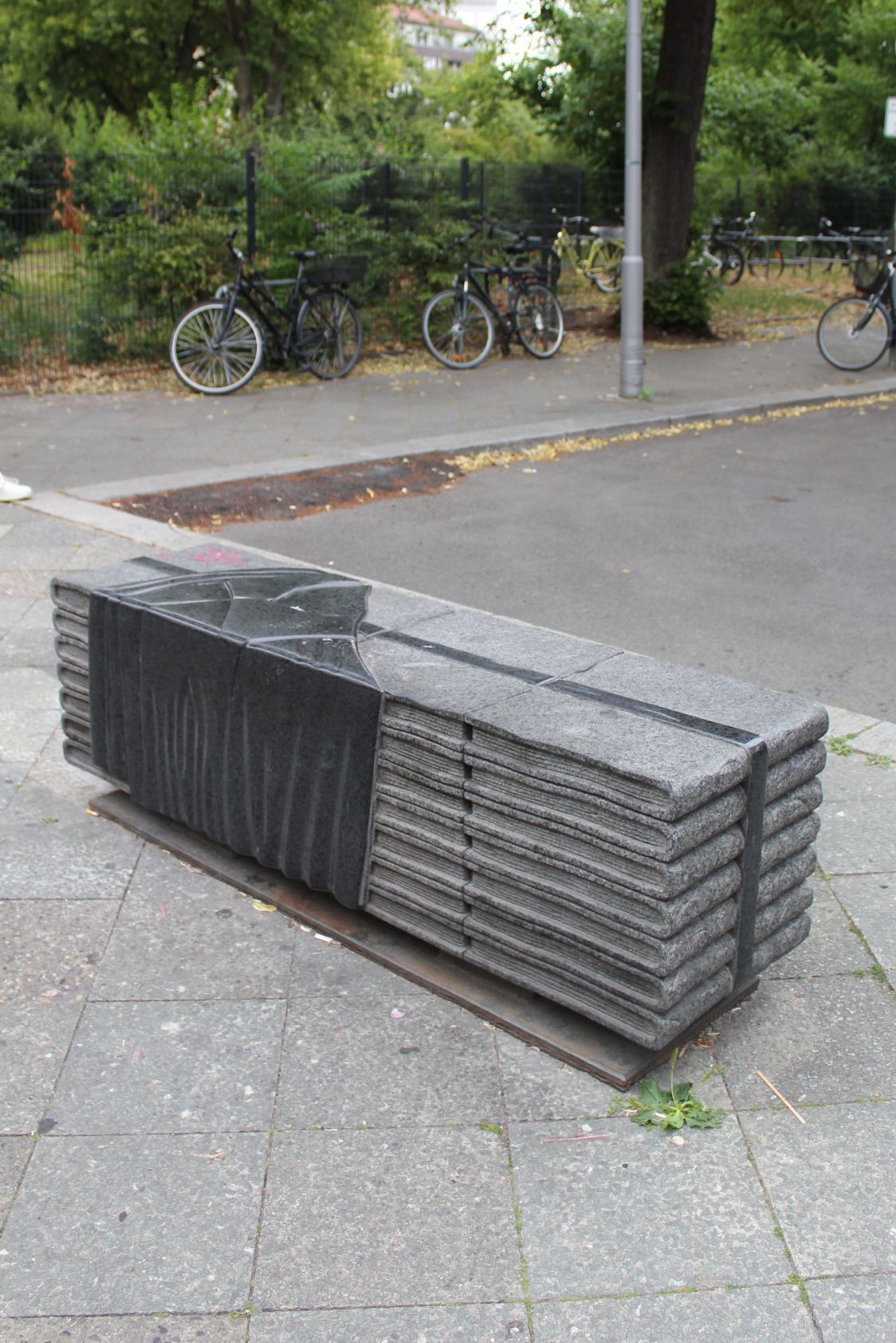 Die Gerichtsbank vor dem Arbeitsgericht Berlin stellt vier Stapel, bestehend aus sieben übereinander liegenden Büchern dar. Um diese Stapel ist ein durchgehendes schwarzes Band gelegt. Auf den Stapeln befindet sich das Gewand ein*er Richter*in. Alle Bänke sind aus beständigem Granit gefertigt und befinden sich auf Stahlfüßen. (Rieke Fender)
