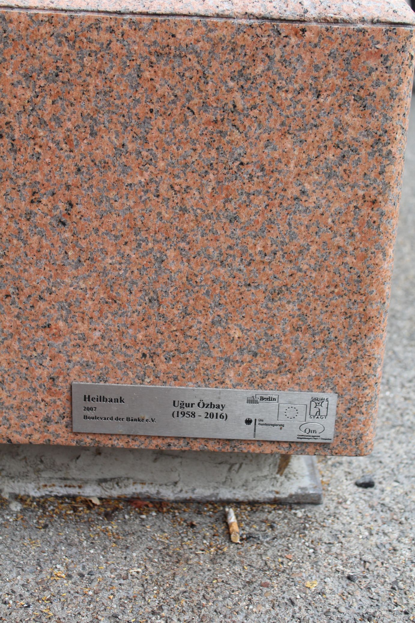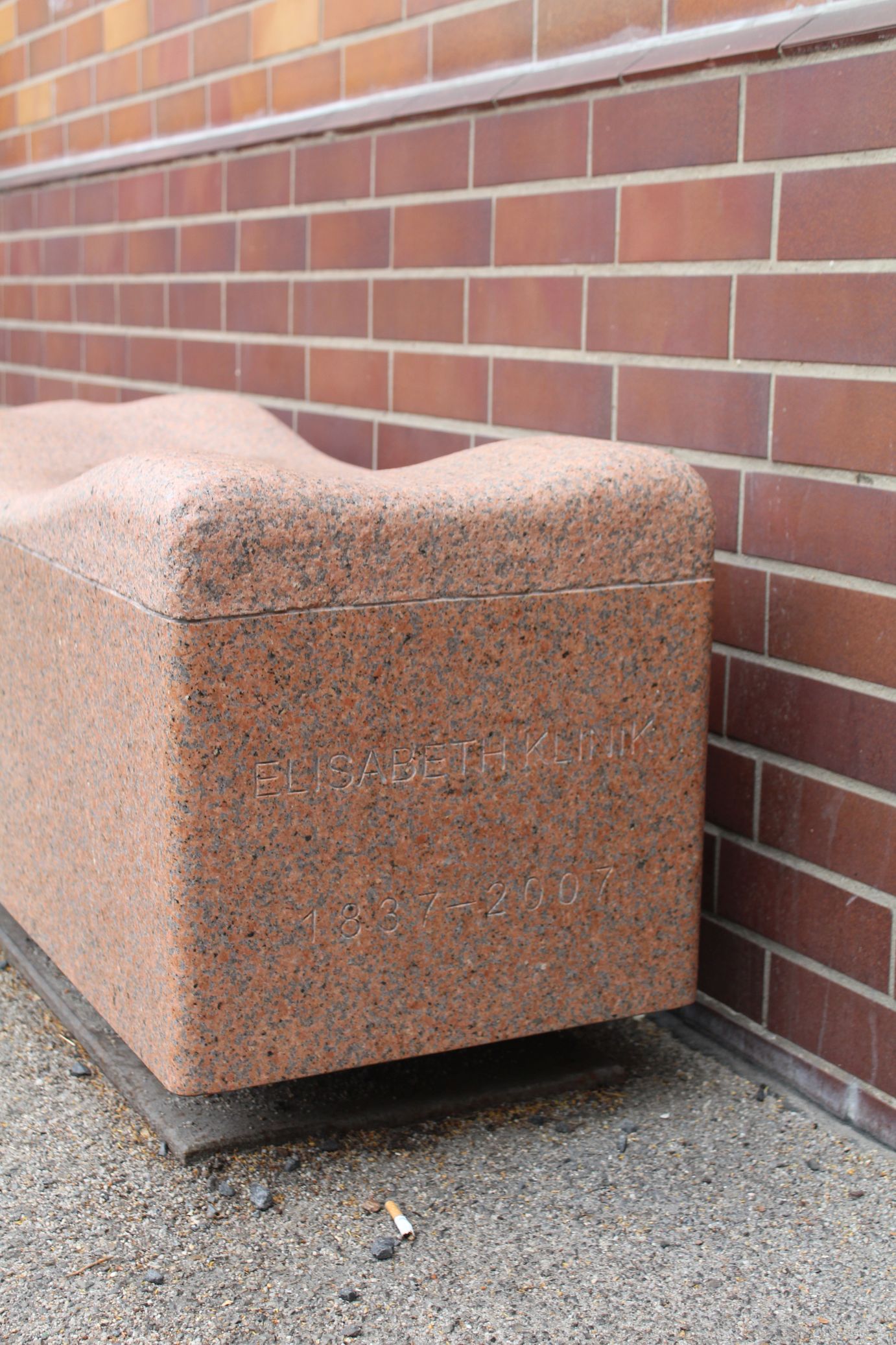 Die Heilbank neben dem Eingang zum Elisabeth-Krankenhaus stellt einen Quader dar, wobei dessen obere Seite Erhebungen und Vertiefungen aufweist. Alle Bänke sind aus beständigem Granit gefertigt und befinden sich auf Stahlfüßen. (Rieke Fender)