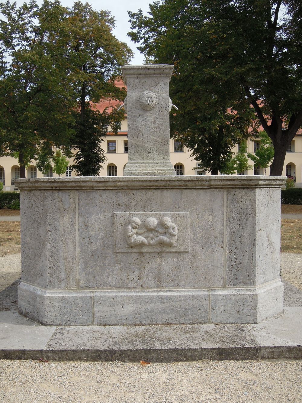 Zwei freistehende skulpturengeschmückte Schöpfbrunnen, die jeweils vor den Hausseiten (Haus 14 und 15) aufgestellt sind. Die gleichgestalteten achteckigen Brunnen haben einen mittleren Springpfeiler, auf dem ursprünglich eine Knabenfigur stand. Ihr gemauerter Brunnenkern ist mit Muschelkalksteinplatten verblendet, während die Brunnenböden in Terrazzo ausgeführt sind. Auf den vier Längsseiten der Brunnentröge ist Reliefschmuck aufgesetzt. Er zeigt Motive, die der Wasserwelt entnommen sind: Wasserfa-belwesen, Meeresgetier, Schildkröten und Meerjungfrauen (Jürgen Tomisch).