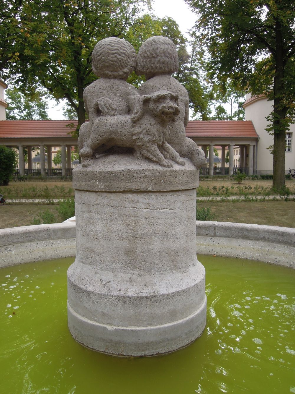 Der Brunnen ist ein freistehender skulpturengeschmückter ovaler Brunnen in Muschelkalkstein. Er zeigt auf einer Mittelsäule die Skulptur eines Kinderpaares (Mädchen) mit Buch, Taube und einem Hund im Rücken. Der Brunnentrog trägt außen Schmuckreliefs mit Darstellungen von Meeresungeheuern, Krabben, Löwen u.a. Seegetier (Jürgen Tomisch).