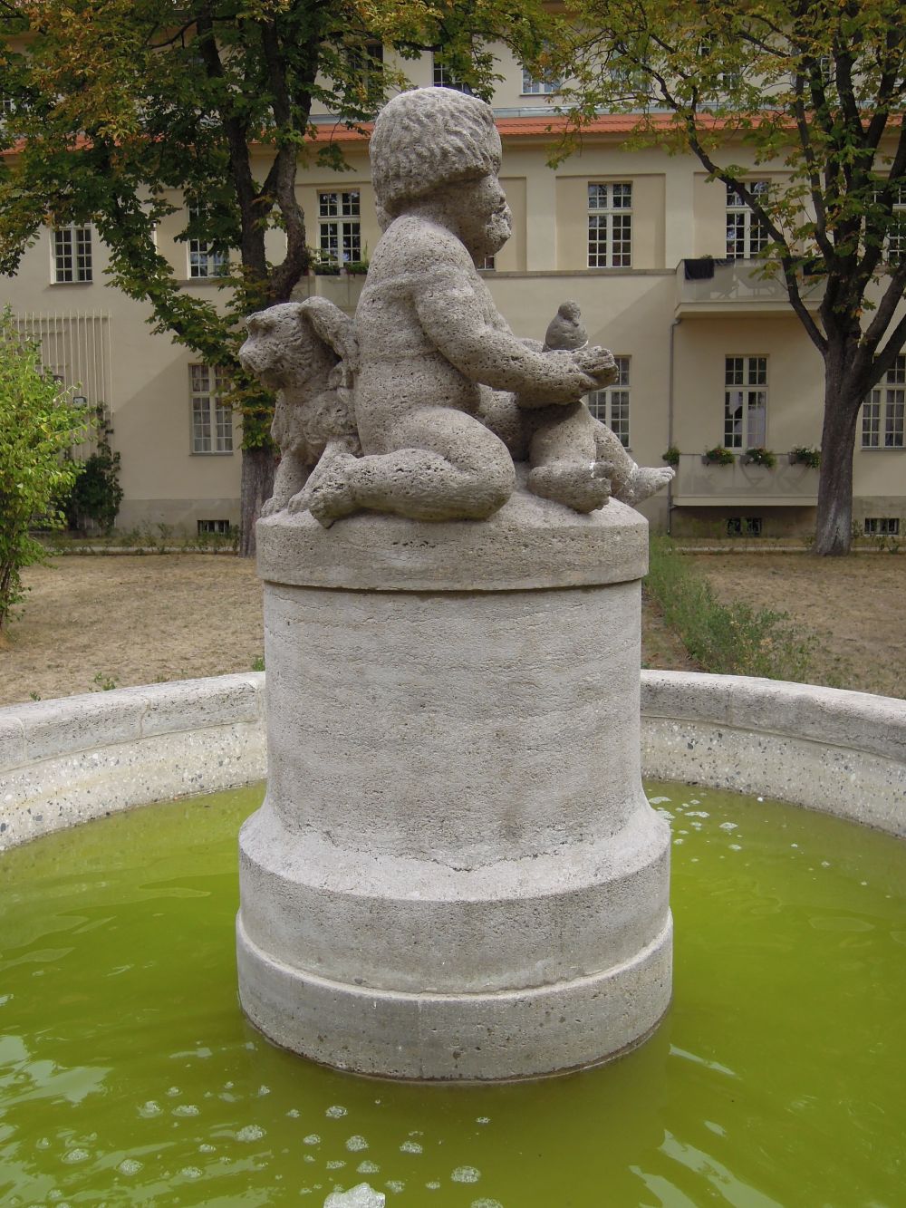 Der Brunnen wurde als Schmuckbrunnen in die Mitteachse des gärtnerisch gestalteten Innenhofs des Hauses 19 gesetzt. Er steht repräsentativ vor der Säulenloggia. Der Brunnen geht auf einen Entwurf von Ignatius Taschner zurück. Die Reliefs von Löwenköpfen und Wassergetier am Brunnentrog stammen vermutlich von Josef Rauch. Die Kindergruppe auf der Mittelsäule ist eine Replik einer Skulptur, die Taschner für den Schulkomplex Zeppelinplatz/Lütticher Straße (1907/1909) von Ludwig Hoffmann modellierte. Im Innenhof des Hauses 21 befindet sich ein gleichgestalteter Schmuckbrunnen. Um 1980 wurden der Mittelpfeiler und die Wassersprudler zusätzlich erhöht. Für den Pfeiler wurde dieser Zustand 2015 bei der Brunnensanierung beibehalten. Einige Schäden an der Skulpturengruppe wurden bereits zu DDR-Zeiten behoben oder ausgebessert (u.a. Zehen, ein Fuß, ein Vogelkopf und Kindernasen). Dabei wurden die abgebrochenen Teile unsachgemäß mit Kleber befestigt, der sich gegenwärtig hell abzeichnet. Am Mädchenkopf sind die Lippen und Teile vom Kinn nicht mehr erhalten. Eine Wieder-herstellung nach Vorbild ist wünschenswert. Die Klebestellen sollten fachgerecht behandelt werden. Der Brunnen ist Teil der 1909-1916 nach einem Entwurf von Stadtbaurat Ludwig Hoffmann ausgeführten IV. Städtischen Irrenanstalt (Genesungsheim) in Berlin-Buch, Wiltbergstraße 50/92. Zur Gesamtanlage gehörten bildhauerisch gestaltete Brunnen, mehrere Skulpturen sowie vielfältiger Reliefschmuck an den Gebäuden. Der weiträumige Baukomplex war zunächst als Nervenklinik geplant, diente ab 1919 als Kinder-genesungsheim und seit 1941 als Allgemein-Krankenhaus. Die trotz der Nutzungsänderungen weitgehend in ihrer bauzeitlichen Form erhaltene Klinikanlage war in Struktur und Gestaltung auf die ursprünglich geplante Funktion bezogen. Hoffmann schuf einen kompakten und nach außen abgeschlossenen Komplex mit mehr als 30 Bauten, für die er eine ungewöhnliche architektonische Vielfalt fand. 1963 kam es zur Gründung des Klinikums Berlin-Buch mit fünf medizinischen Bereichen. Hier wurde der Medizinische Bereich I eingerichtet. Ab 2012 vollzieht sich die Umwandlung des Areals in eine Wohnanlage mit Bildungs-, Sozial- und Gewerbebauten zum so genannten „Ludwig Hoffmann Quartier“ bei Erhaltung der denkmalgeschützten Gebäude und der Wiederherstellung der gärtnerischen Anlange mit ihrem Skulpturenschmuck (Klinikum Berlin Buch Medizinischer Bereich I, Wiltbergstraße 50, Gartendenkmalpflegerisches Gutachten des MB I. Büro Dr. Jacobs und Hübinger, August 1993, Abb. 90, 169, 170; Ludwig Hoffmann´s Genesungsheim in Berlin-Buch. Klinikum Buch-Medizinischer Bereich I, Gutachten angefertigt v. Dieter Leukert 1993/1994; Dieter Leukert, Brunnen, Skulpturen und bildhauerischer Schmuck der Gebäude im Ludwig Hoffmann Quartier, 2015/2016 (Manuskript), S. 90-92; Hoffmann, L., Aus Alt- und Neu-Berlin, Ausstellung der Akademie der Künste Berlin, Berlin 1922, Seite 2) (Jürgen Tomisch). .