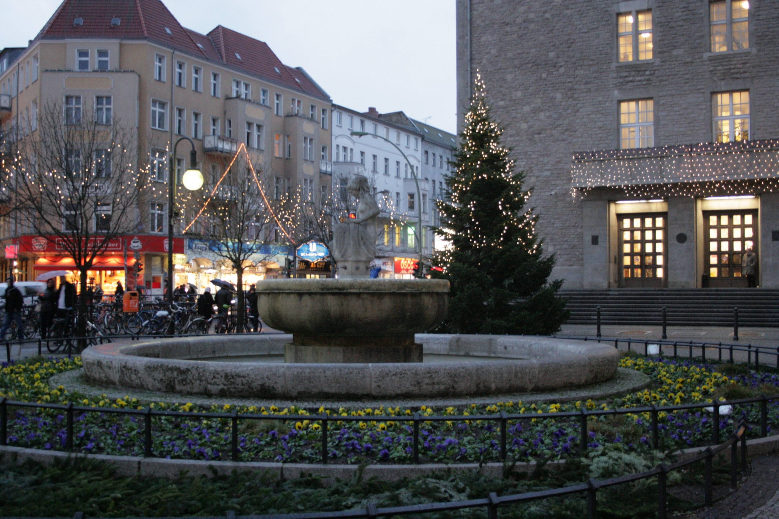 Nach 1913 wurde der Rathausplatz als möglicher Aufstellungsort des von Ernst Moritz Geyger bis 1918 geschaffenen Brunnen „Symbol des Waldesdoms“ vorgeschlagen. Zu einer Aufstellung kam es jedoch nicht. Der Brunnen erhielt 1935 einen Platz im Von-der-Schulenburg-Park an der Sonnenallee (so genannter „Märchenbrunnen“). Der 1954 von dem Landschaftsplaner Prof. Hans Schiller-Bütow (geb. 29.05.1919, lebte im Januar 2012 noch in Berlin) für den Rathausplatz an der Karl-Marx-Straße entworfenen Kunststeinbrunnen mit fünf recht flachen, rechteckigen Brunnenbecken wurde vor 1993 beseitigt (vgl. Erfassungsblatt der Gartendenkmalpflege des LDA Berlin, Nr. 366 mit Abbildung des Brunnens von 1954). An seine Stelle trat der 1993 errichtete Brunnen, der Spolien vom alten, zwischen 1913 und 1914 geschaffenen Fritz-Reuter-Brunnen vom gleichnamigen Fritz-Reuter-Platz sowie völlig neu geschaffene Teile beinhaltet. Die Brunnenskulptur ist ein Werk eines namentlich unbekannten Bildhauers / einer namentlich unbekannten Bildhauerin bzw. namentlich unbekannten Bildhauern / Bildhauerinnen aus der Fachhochschule für Bildhauerei und Steinmetze in Horice (Usti nad Orlici) in Tschechien (Jörg Kuhn).