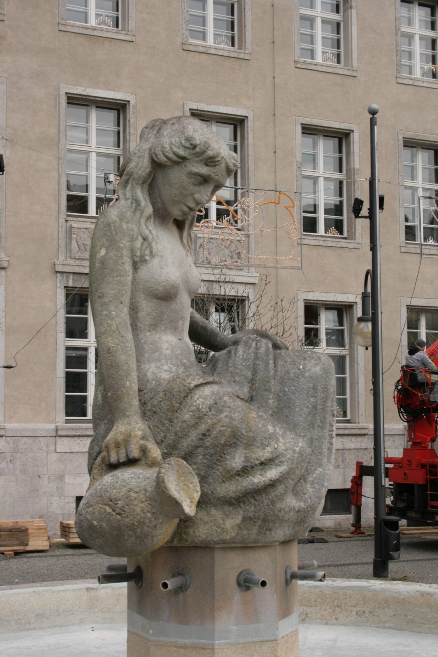 Der Brunnen steht inmitten eines runden Pflanzbeetes, das wiederum mit einem schmalen ovalen Pflanzbeet unterschnitten ist. Die ganze Anlage wird durch einen niedrigen schmiedeeisernen Zaun und granitene Kantensteine eingefasst. Zwischen rund angelegtem Bepflanzungsbeet und Brunnenbecken ist ein Streifen mit Mosaiksteingranitpflasterung gelegt. Der eigentliche Brunnen zeigt unten ein rundes Becken mit Muschelkalksteineinfassung und Betonboden. Im Becken steht zentriert in der Mitte ein polygoner Sockel, der eine runde Brunnenschale aus Muschelkalkstein trägt. In der Schale steht in Fortführung des unteren Sockels der Brunnenstock, der die Ausflussrohre birgt. Der Brunnenstock trägt die Skulptur einer hockenden jungen Frau. In der rechten Hand hält sie einen Schöpfkrug, mit der Linken hält sie das herab rutschende Gewand. Der Kopf mit dem langen, oben geknoteten Haar ist leicht nach vorne geneigt. Das genrehafte Motiv lässt erkennen, dass die junge Frau mit ihrer Körperpflege befasst ist und dass sie im Begriff steht, Waschwasser aus dem Brunnen zu schöpfen. Außerhalb des Pflanzbeets in südöstlicher Richtung ist in das Platzpflaster eine rechteckige Bronzetafel eingetieft, die eine Inschrift enthält (Jörg Kuhn).