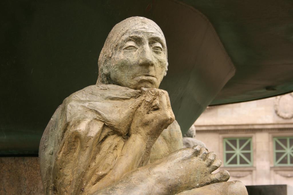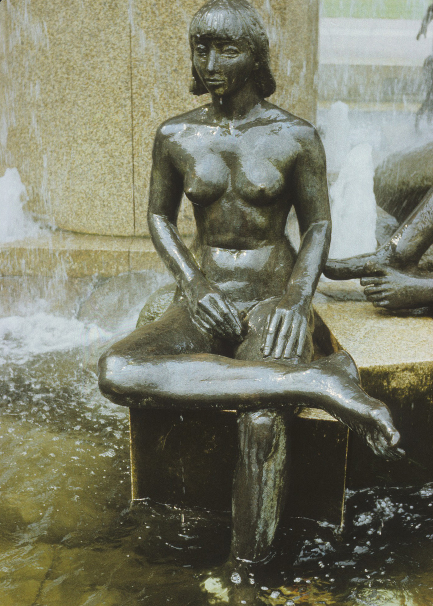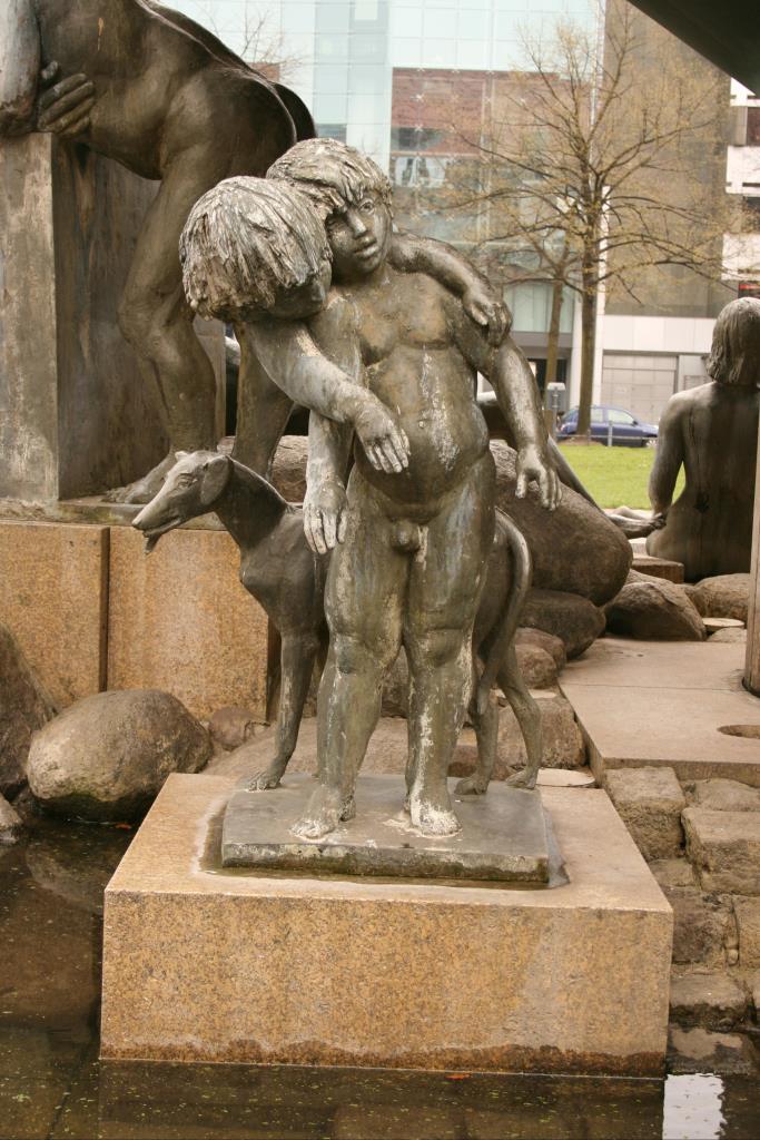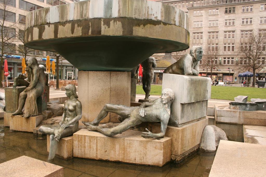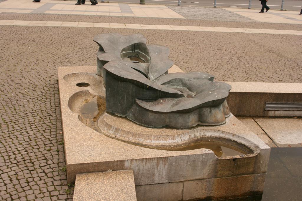 „Ein ovaler Pilz, umgeben von 12 (es sind 14, Jörg Kuhn) Plastiken, steht in einem Becken, das nur unscharf zum Umfeld abgegrenzt und mit rohbehauenen oder natürlichen Steinen ausgelegt ist. Das Wasser tritt an der Spitze des Pilzes als kleine Fontäne aus, fällt schleierförmig über die Ränder der Deckschale und setzt die einzelnen Figuren zueinander in Beziehung: der ‚Berliner Fenstergucker’, der die Passanten in Richtung U-Bahnhof mustert, einen liegenden Jüngling, ein sitzendes und ein liegendes Mädchen, eine hinter dem Wasserschleier fast verborgene alte Frau, eine sitzende Frau und eine Puttengruppe mit Windspiel, als humorvolle Anspielung auf den Neptunbrunnen (gemeint ist der Schlossbrunnen von Reinhold Begas, 1891, JKuhn) und der (1826, JKuhn) von (Johann Gottfried, JKuhn) Schadow gestalteten Hunde Friedrichs II.“ (Zitiert nach: Internetauftritt http://www.stadtentwicklung.berlin.de/bauen/brunnen/de/tem_sch/11; Ergänzungen durch Jörg Kuhn).