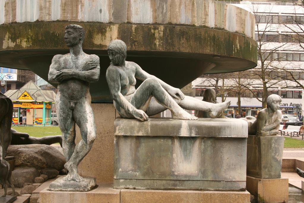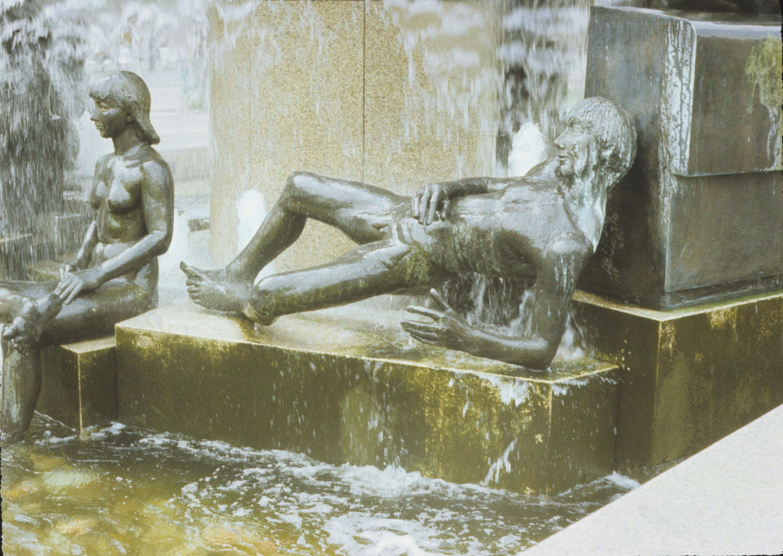 Realisiert nach einem begrenzter Wettbewerb vom Berliner Senat 1980/1981. Ausgeführt zusammen mit dem Architekten Wolfgang Schuster, nach dem Tod Grzimeks (am 26. Mai 1984) durch dessen langjährigen Darmstädter Assistenten Christian Höpfner vollendet. Auf der Nordseite der Platzes ein weiterer Brunnen nach Entwürfen Grzimeks, jedoch ohne Figurenschmuck. 1980/1981 wurde vom Land Berlin, Senator für Bau- und Wohnungswesen, ein eingeschränkter Wettbewerb zu zwei Brunnen für den wiederherzustellenden Wittenbergplatz ausgelobt. Eingeladen waren acht Künstler, nämlich: Waldemar Grzimek, Berlin; Ansgar Nierhoff, Köln; Paul Pfarr, Berlin; Emil Cimiotti, Braunschweig; Michael Schoenholtz, Berlin; Peter de Longueville mit Barna von Sartory, Berlin; Rolf Szymanski, Berlin; Klaus Noculak mit Auke Schuurmans, Berlin. „Das 14-köpfige Preisgericht unter Vorsitz von Siegfried Salzmann schied nach Diskussion der Aspekte Platzraum, Proportion, Wassertechnik, Denkmalschutz eine Spitzengruppe mit Grzimek, Nierhoff, Pfarr, Cimiotto und Szymanski aus. (…) Die Jury sprach sich eindeutig dafür aus, beide Brunnen von einem Künstler ausführen zu lassen. Im 2. Durchgang ging es um die Funktion der Brunnen als Ordnungselemente auf dem Platz, ihre Erscheinung ohne Wasser und den Maßstab zum U-Bahnhof. Schließlich spitzte sich die Entscheidung auf Grzimek und Nierhoff zu. Grzimeks Entwurf wurde mit 9:5 Stimmen zur Ausführung empfohlen“ („Neptuns Reich an der Spree. Berliner Brunnen von Begas bis Bonk 1886-1986“, Berlin 1986, S. 75). Die BPU zum Umbau des Wittenbergplatzes wurde am 27. Mai 1982 fertig gestellt. Geplant wurden zwei Brunnen, nach ihren Standorten auf den beiden Platzhälften „Nordbrunnen“ und „Südbrunnen“ genannt. Die Konzeption und der Grundentwurf zu beiden Brunnen stammen von Grzimek. Der Nordbrunnen wurde zuerst fertig gestellt und mit dem Wittenbergplatz am 10. April 1985 eingeweiht. Der Südbrunnen, ungleich größer und auch viel aufwändiger gestaltet, folgte erst später. Der Architekt Wolfgang Schuster legte am 21. August 1984 den mit Bruder des Bildhauers Prof. Günter Grzimek abgestimmten Entwurf für die Umfeldgestaltung des südlichen Brunnens vor. Der Entwurf sah eine Befestigung mit verschiedenfarbigen Mosaiksteinen vor. Die dadurch gestaltete Fläche beträgt rund 615 Quadratmeter. An die Ecken der Platzfläche wurden Granitblöcke gesetzt. Als der Bildhauer Waldemar Grzimek während des Entstehungsprozesses von Platz und Brunnen starb, musste auf drei Figuren Grzimeks, die noch nicht angelegt waren, verzichtet werden. An ihre Stelle traten die Werke anderer Bildhauer. Christian Höpfner schuf gemeinsam mit Hartmut Bonk das sitzende Paar und den stehenden Jüngling. Von Fee Franck stammen die beiden ungegenständlichen Plastiken, die die Frontseite des Brunnens links und rechts begrenzen und allegorisch für das weibliche und das männliche Prinzip stehen. Bei der Einweihung am Freitag, den 12.7.1985 sprachen der Bezirksbürgermeister Erik Jakesch, der Kunsthistoriker, Museumsdirektor und Freund Waldemar Grzimeks, Prof. Dr. Peter H. Bloch (1925-1994) sowie der Landschaftsarchitekt und Bruder des verstorbenen Bildhauers, Prof. Günter Grzimek. Die Kosten betrugen knapp 2 Millionen D-Mark (Jörg Kuhn).