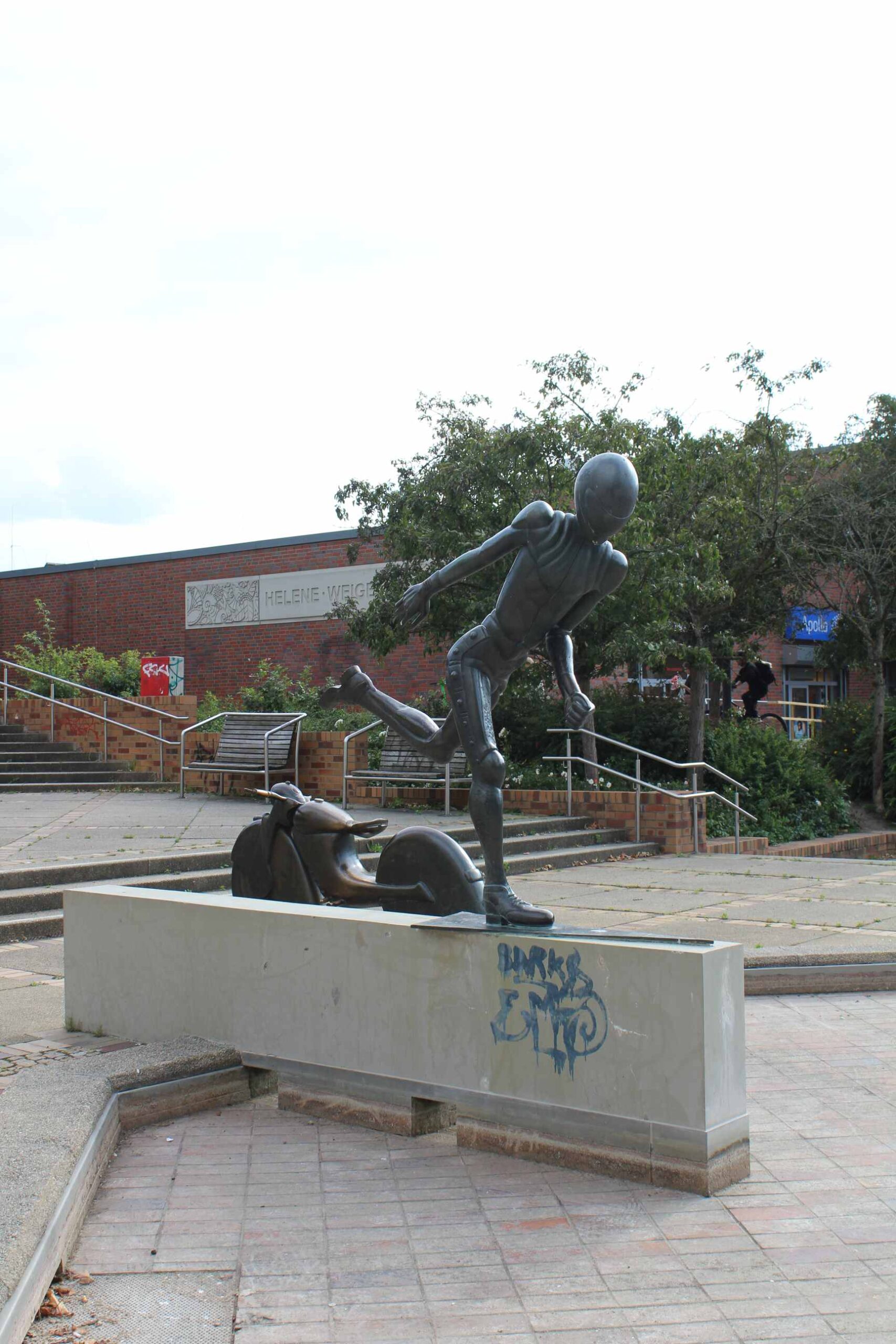 Das Zentrum des Helene-Weigel-Platzes wird von der Brunnenanlage „Brunnen der Generationen“ dominiert. Der Brunnen besteht aus drei Figurengruppen (insgesamt 5 Figuren) aus Bronze und drei unterschiedlich großen Brunnenbecken, von denen das mittlere und das größte zum Teil abgetreppt sind, sodass das Wasser kaskadenförmig nach unten abfließt. Die Figuren sind auf verschiedenen Höhen der Treppe aufgestellt und stehen auf flachen Plinthen. Auf der niedrigsten Ebene, in einem achteckigen Brunnenbecken, befindet sich die Figur des „Sportlers“, welche auf einem quaderförmigen Sockel steht und das dazugehörige Motorrad, das sich etwas abseits davon befindet. Die Figur des „Sportlers“ stellt einen jungen Mann in Bewegung dar, der in seiner Schutzkleidung, bereit zum Sprung ins Becken zu sein scheint. Das mittlere Brunnenbecken, welches auch das kleinste ist, beinhaltet lediglich ein paar Treppenstufen.