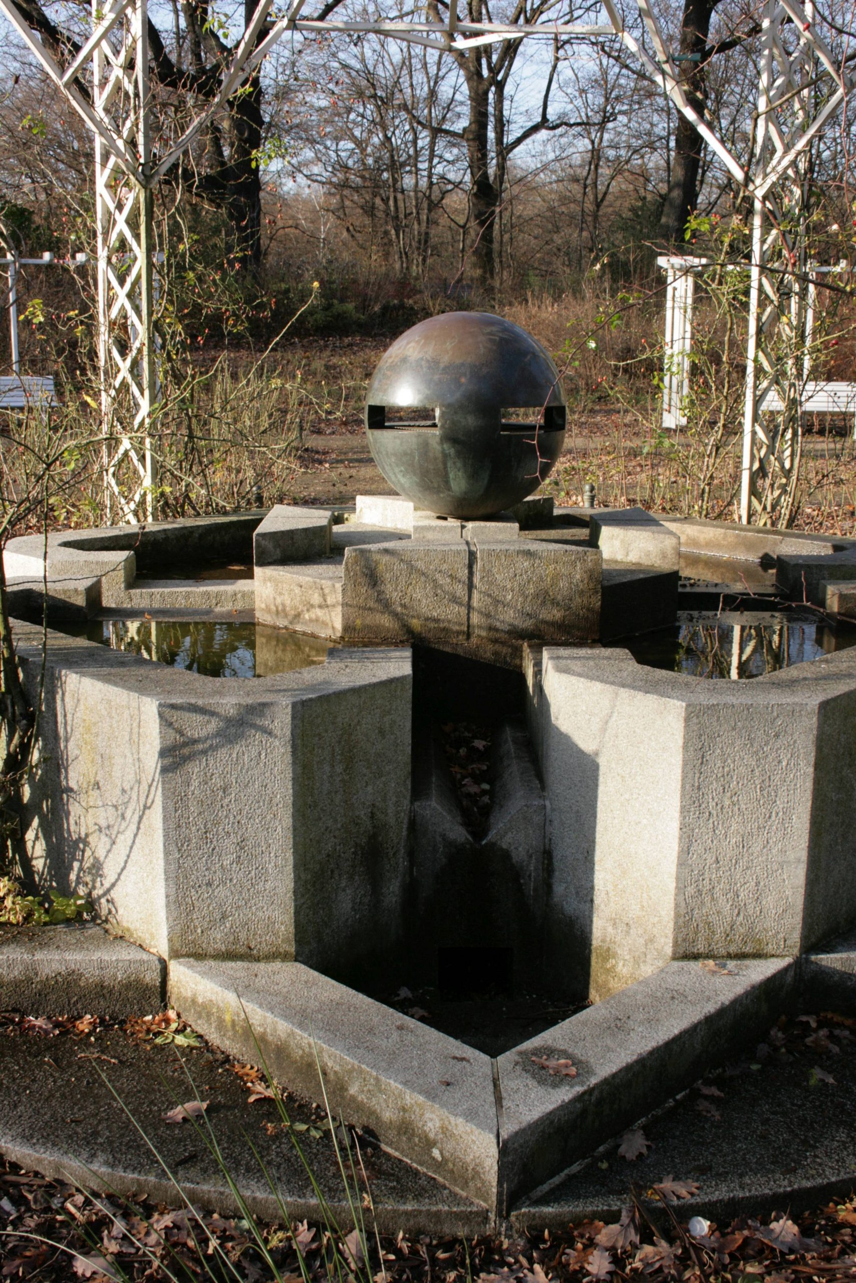 Unter einem schlichten, pavillonartigen und nach oben offenen Gitterspalier („Traillage“) mit vier Stützen aus weißgefasstem Stahl steht ein mehrstufig angelegter Brunnen aus Granit und Bronze. Den Mittelpunkt des Brunnens bildet eine Bronzekugel, die auf einem oktogonalen Sockel ruht. Aus vier Schlitzen tritt aus dieser Kugel Wasser aus, das über in den Sockel eingearbeitete Wasserrinnen in vier Beckensegmente und von dort weiter in die kleinen Auffangbecken in Bodenhöhe fließt. Die gesamte Brunnenanlage ist sternförmig mit Granitschwellen eingefasst. Die um den Brunnen herum angelegten Beete sind mit Rosen bepflanzt. Zusätzlich wachsen im Brunnenbereich in den Erdbecken Kletterrosen, die am Spalier hinauf ranken. Aufbau und Nutzung korrespondieren mit der Pergolenarchitektur, die am Rand der Gartenanlage die dort aufgestellten Parkbänke hinterfängt (Susanne Kähler, Jörg Kuhn).