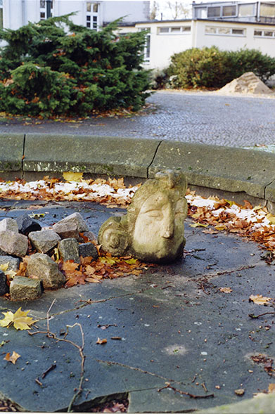 Teil der Ausstattung des zur westlichen Seite gelegenen, von Nebengebäuden eingefassten Schlosshofes des Jagdschlosses Glienicke ist ein schlichter, runder Bassinbrunnen. Die unmittelbare Umgebung des Brunnens ist gepflastert, hellgraue Granitschwellen umgrenzen das Bassin. Im Zentrum des Brunnenbeckens steht, neben einen Haufen verschiedenfarbiger Pflastersteine, eine moderne Sandsteinplastik, die nicht zu der Brunnenanlage selbst gehört. Es handelt sich um einen stilisierten Kopf, der aufgrund der Schlangendarstellungen am Hinterkopf, oben und an den Seiten als Medusenhaupt zu deuten ist. Stilistisch ist dieser Kopf als Skulptur in die 1970er oder auch noch in die frühen 1980er Jahren einzuordnen (Jörg Kuhn, Susanne Kähler).