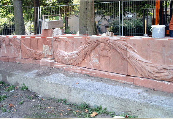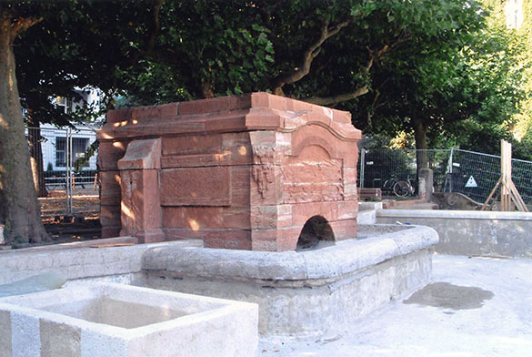 Die erste Parkanlage am Westufer des Lietzensees wurde 1823 von General Jakob Wilhelm Karl von Witzleben angelegt. Seit 1871 nutzte man das Areal nicht mehr als Park, 1901 begann man mit der Bebauung des Ostufers, wobei der heutige Kuno-Fischer-Platz, der heutige Dernburgplatz und der heutige Witzlebenplatz ausgespart wurden. Entwürfe für den Dernburgplatz mit der Kaskade zur Frischwasserzufuhr für den See und für den Kuno-Fischer-Platz legte der 1912 zum Gartendirektor berufenen Erwin Barth bereits kurze Zeit später vor. Nach 1918 – das Bauinteresse fehlte – wurde beschlossen, den Westteil als Park herzurichten. 1918-1920 erfolgte die Ausführung nach Plänen Barths mit möglichst kostengünstigen bereits vorhandenen Materialien im Rahmen der Notstandsprogramme durch Arbeitslose. In der Zeit nach dem Zweiten Weltkrieg, insbesondere in den 1950er Jahren erfolgte eine Neuausstattung des Parks. Die Große Kaskade wurde offensichtlich Ende der 1950er Jahre wieder in Betrieb genommen (Wirth 1961). Große Kaskade: Der Dernburgplatz am südlichen Ende des Lietzensees ist der Standort eines Vorplatzes, der den Beginn der „Großen Kaskade“ darstellt. Die Kaskade verläuft über eine Gesamtlänge von 35 Metern und hat seinen architektonischen Endpunkt in einer Pergolaanlage mit Aussichtsterrasse über den See und steinerner Balustrade. Im oberen Bereich bildet eine niedrige Mauer aus rötlichem Sandstein rechts und links des Brunnenbeckens einen Abschluss zur Straße. An ihrer Innenseite wird diese Mauer durch ein Relief verziert: Eine Girlande aus Schilf verläuft über die gesamte Mauerlänge, dazwischen befinden sich kleinere dekorative Reliefs mit Darstellungen von Wassertieren wie Fischotter oder Schildkröte. Der Ausgangspunkt des Wassers ist eine aus dem selben rötlichen Sandstein gefertigter „Quellstein“ mit rechteckigem Grundriss und Wellen- und Wassertropfenreliefs als Verzierung. Aus einer rundbogenförmigen Öffnung strömt bei Betrieb Wasser in ein rechteckiges Bassin aus Muschelkalk, das wiederum von einem weiteren Bassin umgeben wird. Die sieben Staustufen der Kaskade sind ebenfalls in Muschelkalk gefasst, sie werden rechts und links von Treppenanlagen gerahmt. Die Anlage der Großen Kaskade einschließlich der Pergolaanlage hat aufgrund des jüngeren Entstehungsdatums und den anderen wirtschaftlichen Gegebenheiten der Vorkriegszeit einen anderen Charakter als sie übrige Ausstattung des Parks. Quellstein und Mauer mit schmückenden Reliefs sind originelle Elemente, die noch Anklänge an den Historismus zeigen. Der rötliche Sandstein korrespondiert mit der Architektur der 1904 erbauten Lietzenseebrücke. Kleine Kaskade: In Nordteil des Parks, am Bürgersteig der Wundtstraße / Ecke Sophie-Charlotten-Straße befindet sich der Rundbrunnen als Ausgangspunkt für die von Erwin Barth und Stadtbaurat Heinrich Seelig entworfene kleine Kaskade, über die Frischwasser durch den tiefer liegenden Park und schließlich in den See läuft. Der Rundbrunnen, in dessen Mitte die Düse einer Springbrunnenanlage montiert ist, hat einen schmucklosen, oben abgerundeten Brunnenrand aus Sandstein, darauf wurde ein schlichter schmiedeeiserner Handlauf befestigt. Unterhalb des Rundbrunnens sammelt sich das Wasser in einem rechteckigen Bassin, Ausgangspunkt für die 75 cm schmale Kaskade in deren Verlauf sich runde und achteckige kleine Becken mit geraden Steineinfassungen abwechseln. Den Abschluss der Anlage bildet wiederum ein großes rechteckiges Becken. Barth begründete die Notwendigkeit dieser Anlage mit dem Bedarf an Frischwasser. Die Einfachheit der in der Nachkriegszeit bei der Ausstattung des Lietzenseeparks verwendeten Mittel kommen bei der Gestaltung der Kleinen Kaskade im Gegensatz zur vor dem Ersten Weltkrieg entstandenen Großen Kaskade zum Tragen. Die betont schlichte Architektur mit klaren geometrischen Beckenformen ordnet sich gestalterisch unter, bildet aber einen klaren Einschnitt mit Blickachse durch die Begrünung der Böschung. 2005 bis 2006 wurde die gesamte Anlage umfassend saniert (Susanne Kähler).