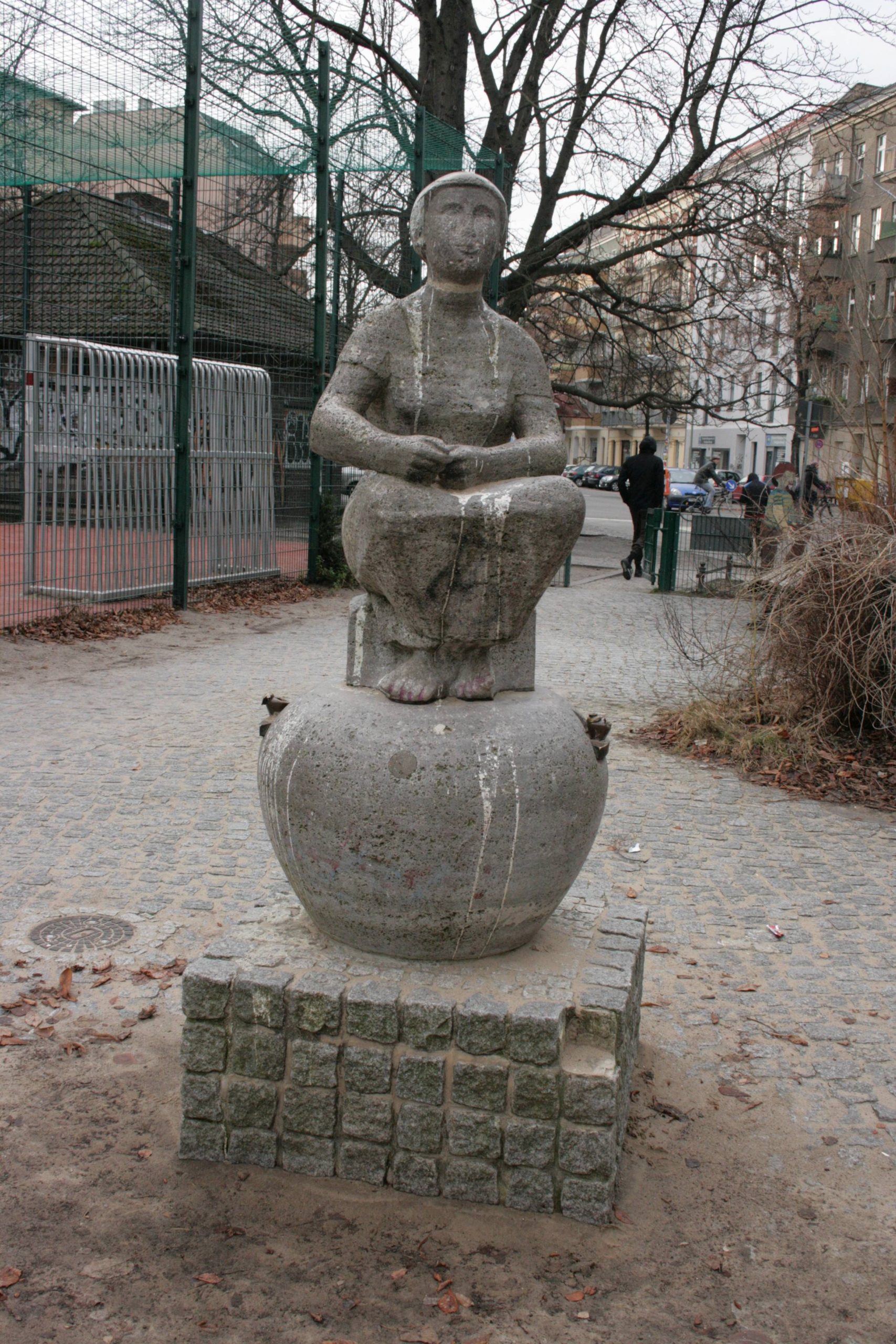 Der zu dieser Figur gehörige Brunnen wurde 1914 von Heinrich Missfeldt geschaffen und 1957 von Karl Wenke, nach einem Motiv von Fritz Reuter, umgestaltet (Marc Wellmann). Am 14. Juni 1914 wurde zur Erinnerung an den Schriftsteller und Mundartdichter Fritz Reuter (1810-1874) auf dem Fritz-Reuter-Platz für etwa 18.400,- Mark ein Brunnen aufgestellt. Der Bildhauer Heinrich Mißfeldt entwarf den Brunnen 1913 und schuf insbesondere hierfür die Figurengruppe „Liening“ und „Miening“, zwei Gestalten aus dem Werk Reuters. Im Zweiten Weltkrieg wurde der Brunnen weitgehend zerstört. Der Bildhauer Karl Wenke schuf zwischen 1949 und 1950 unter Verwendung der erhaltenen Brunnenschale von Mißfeldt einen neuen Brunnen. Dieser Brunnen wurde nun in einem runden Pflanzbeet aufgestellt und zwar ohne den „Brunnenstock“ und ohne figürlichen Schmuck. Karl Wenke wurde dann damit beauftragt, den Brunnen mit einer Figur zu schmücken. Als Bekrönung wählte er 1957-1958 eine sitzende Mädchenfigur aus Muschelkalkstein. Der durch Vandalismus in den 1970er und 1980er Jahren stark beschädigte Brunnen wurde um 1988 abgetragen und die Überreste in der Hasenheide gelagert. Die Mädchenfigur (Kopf neu angesetzt) wurde auf dem Kinderspielplatz des Fritz-Reuter-Platzes aufgestellt (Jörg Kuhn).