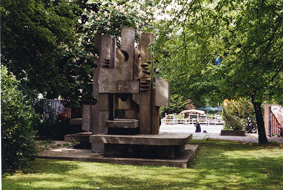 Die teilweise begehbare, aus Sichtbeton gegossene, im Bereich des Standpodestes mit Granitkieseln belegte, mehrschichtige und bei aller Kompaktheit der Komposition raumgreifende Brunnenskulptur weist eine Gesamthöhe von etwa 4 Metern auf. Die technizistische Gestaltung der Brunnenskulptur zitiert offensichtlich Industriemaschinen und das Innenleben von Automaten. Der „Motor“ des statischen, aber scheinbar beweglichen Konstrukts ist das Wasser (im Sommer: Wasserzufuhr mit Umwälzanlage, ansonsten: Regenwasser). Auf dem rechteckigen Standpodest erheben sich zwei große, parallel stehende Betonpfeiler und, ihnen zugeordnet, ein kleinerer Pfeiler auf der Westseite. Diese Pfeiler bilden das Grundgerüst der Komposition. Um sie herum sind über massiven Rundstützen nach der Art von Goldgräberfließbahnen oder Fließbändern flach eingetiefte Betonbahnen geführt, jedoch nicht zusammenhängend, sondern als Teilkompartimente. In der nächsten Ebene schafft eine weitere Fließbahn die Verbindung zwischen den beiden unteren Fließbandkompartimenten und zwar durch runde Öffnungen, die es dem Wasser erlauben, von der höheren Ebene auf die beiden unteren Ebenen und die Podestebene zu rinnen. Der verbleibende Raum zwischen den beiden nebeneinander stehenden Pfeilern ist mit Betonformen gefüllt, die an Walzen, Schwingräder, Zahnräder und ähnliches Maschinenzubehör erinnern. (Kähler/Kuhn)