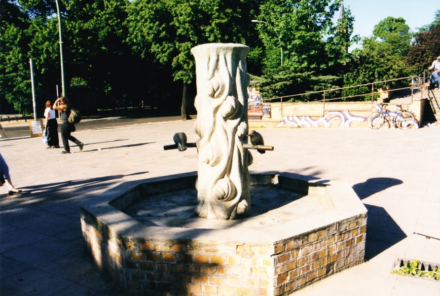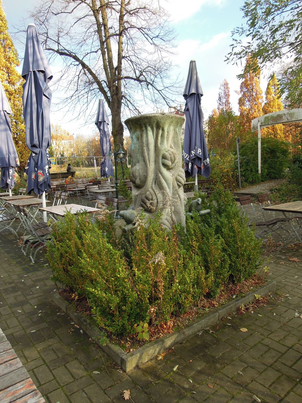 Die heute auf der Terrasse des Restaurants Olivenbaum in der Breite Straße 33 befindliche Skulptur entspricht nicht mehr der von Manfred Salow geschaffenen Brunnensäule. Die Brunnenplastik fand 1978 im südlich des Restaurants angrenzenden ehemaligen Jugendpark, dem heutigen Bleichröderpark, ihre Aufstellung. 1993 wurde der bereits außer Betrieb befindliche Brunnen folgendermaßen beschrieben: „Zwei Katzen (Bronze) sitzen auf einem floral-ornamental gestalteten Brunnenstock (Beton, Gesamthöhe 2,32 m). Drei Tauben sind auf Stangen und drei Taubenpaare (ebenfalls Bronze) im Becken und um den Brunnenstock gruppiert. Das oktogonale Brunnenbecken (Durchmesser 3 Meter) ist aus Klinkern gemauert, die Beckenkanten sind mit Terrazzoplatten abgedeckt“ (vgl.: Ugowski, Eberhard: Berliner Brunnen. Verzeichnis und Beschreibung gestalteter Brunnen im öffentlichen Raum. Berlin 1993, S. 58). Nach 1993 wurde die Plastik wohl teilzerstört und anschließend ohne Brunnenschale wiederaufgestellt. Nach 2015 kam es zur Versetzung an den heutigen Standort (Ankauf der Plastik durch den Besitzer des Restaurants). Von der ursprünglichen Brunnenplastik hat sich nur noch der Brunnenstock, die mittige Betonsäule, ohne Katzen und Brunnenschale sowie den Tauben darauf erhalten. Er zeigt das floral-ornamentale Dekor mit Bronzetauben auf Stangen (Jürgen Tomisch).