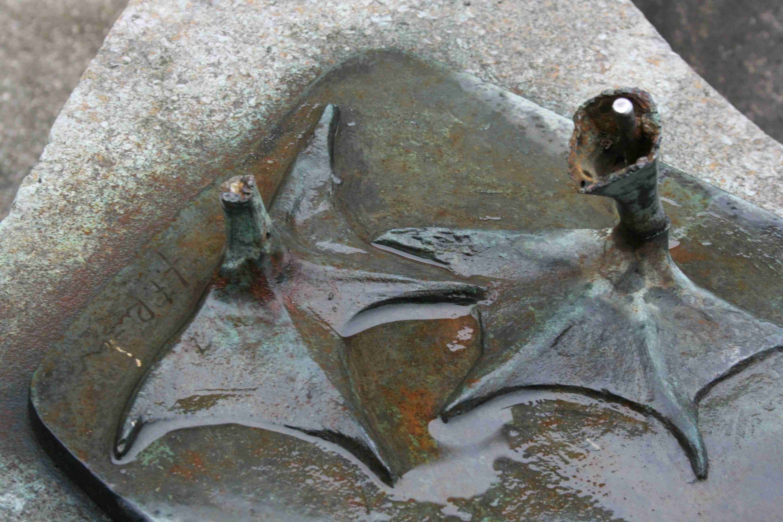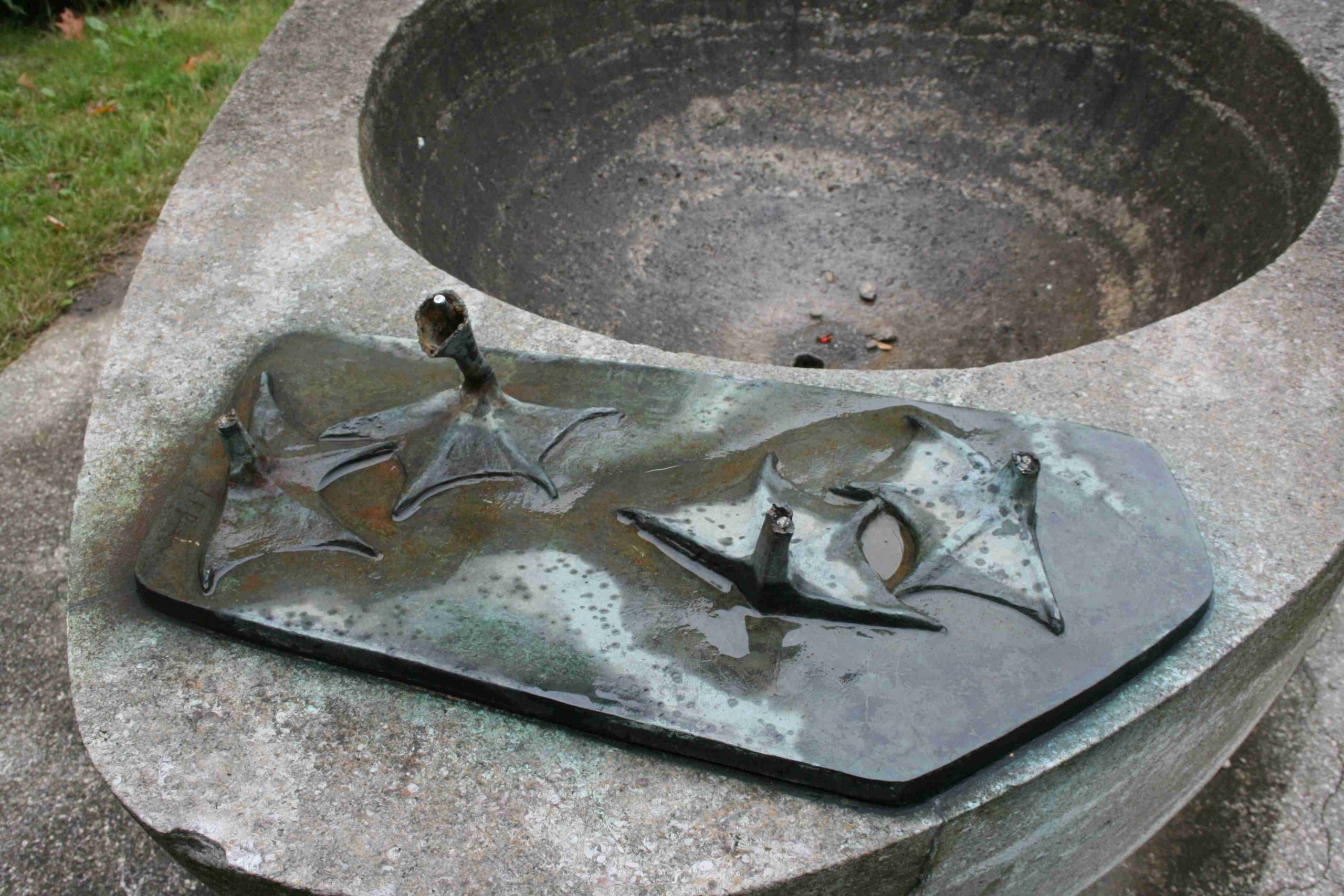 Auf der Rasenfläche vor dem Gebäude des Finanzamts Steglitz Unter dem Eichen befindet sich auf einer Betonstandfläche mit abgerundeten Ecken ein nierenförmiger Schalenbrunnen aus Muschelkalkstein mit einem runden Becken, in das ein Metallwasserablauf eingearbeitet ist. Auf dem Brunnenrand stand ursprünglich eine Bronzeplastik, eine Darstellung zweier Pelikane, die die Hälse aneinandergelegt hatten. Die beiden leicht stilisiert dargestellten Vögel standen auf einer flachen irregulär geformten Plinthe. Die Vögel wurden vermutlich um 1995 entfernt. Die Bronzefüße mit den Bruchkanten sind noch vor Ort (Susanne Kähler).