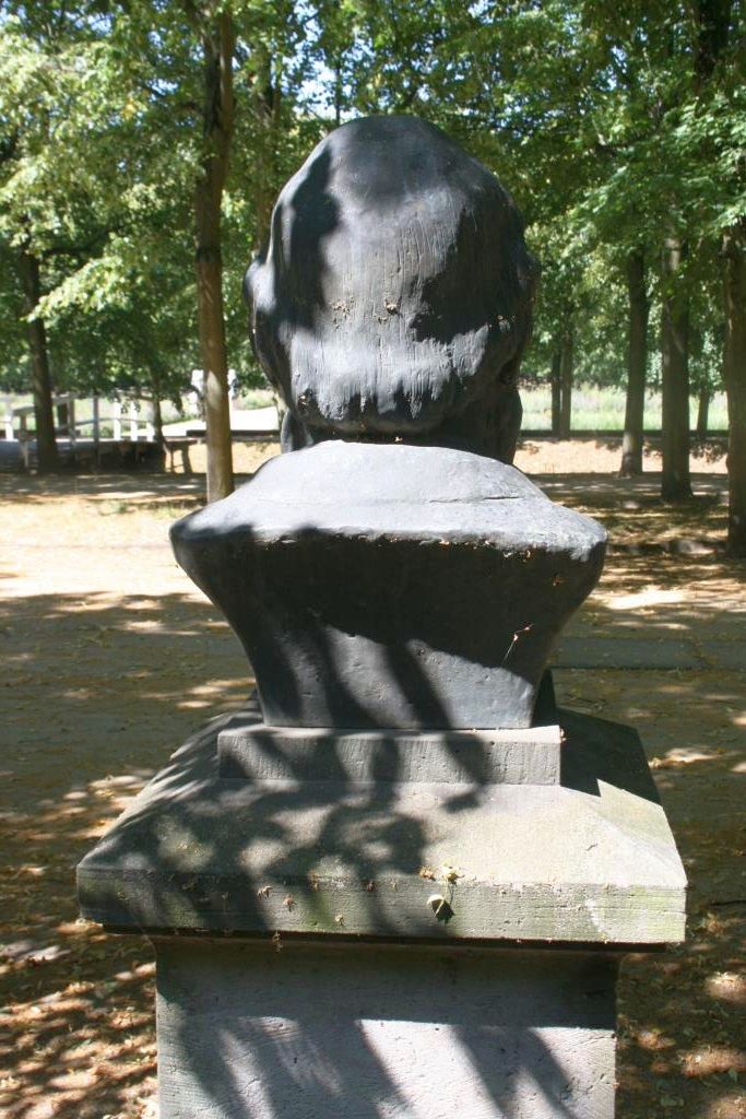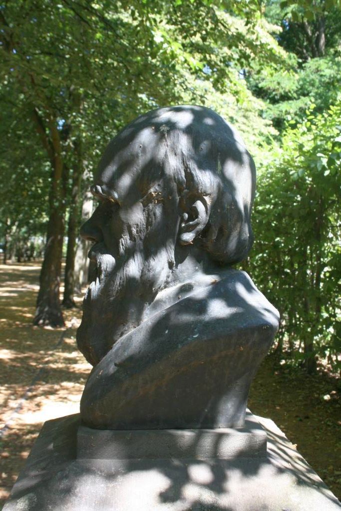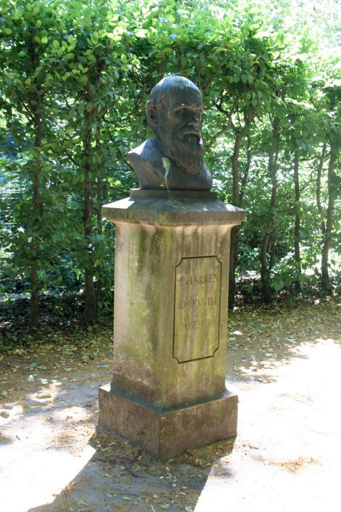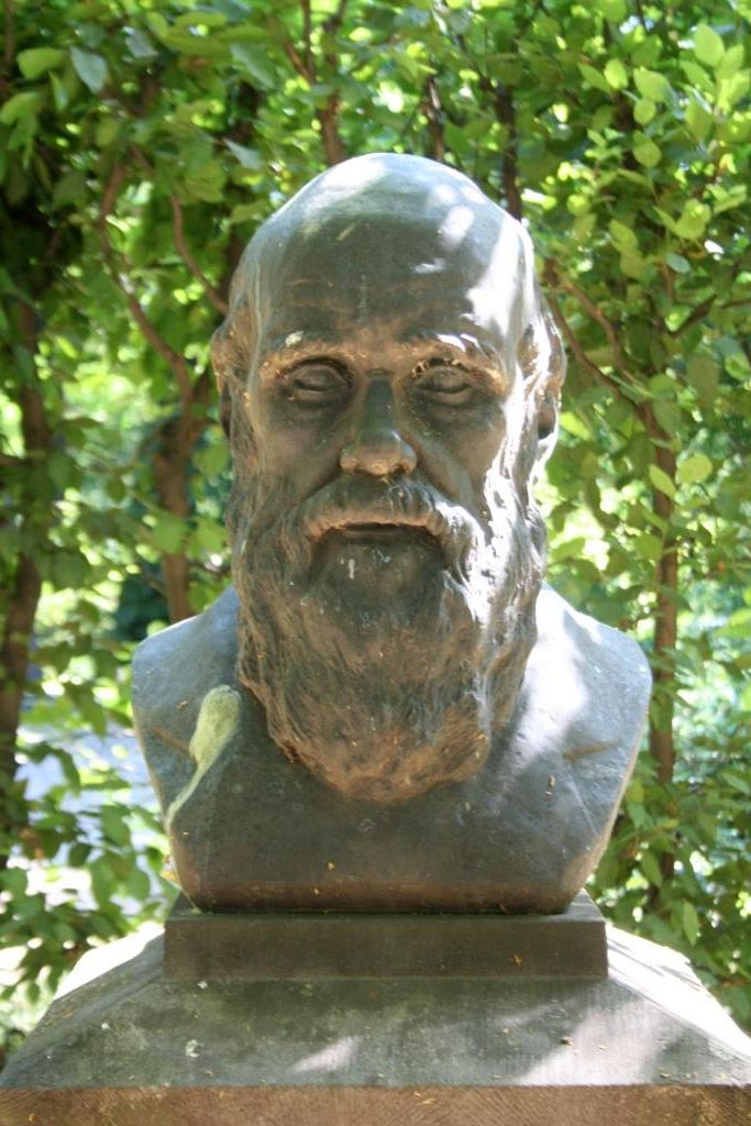 Auf einem Sandsteinpidestal sitzt die Porträtbüste des Naturforschers Charles Darwin auf, dem Namensgeber der Darwin’schen Evolutionstheorie und des sogenannten Darwinismus.