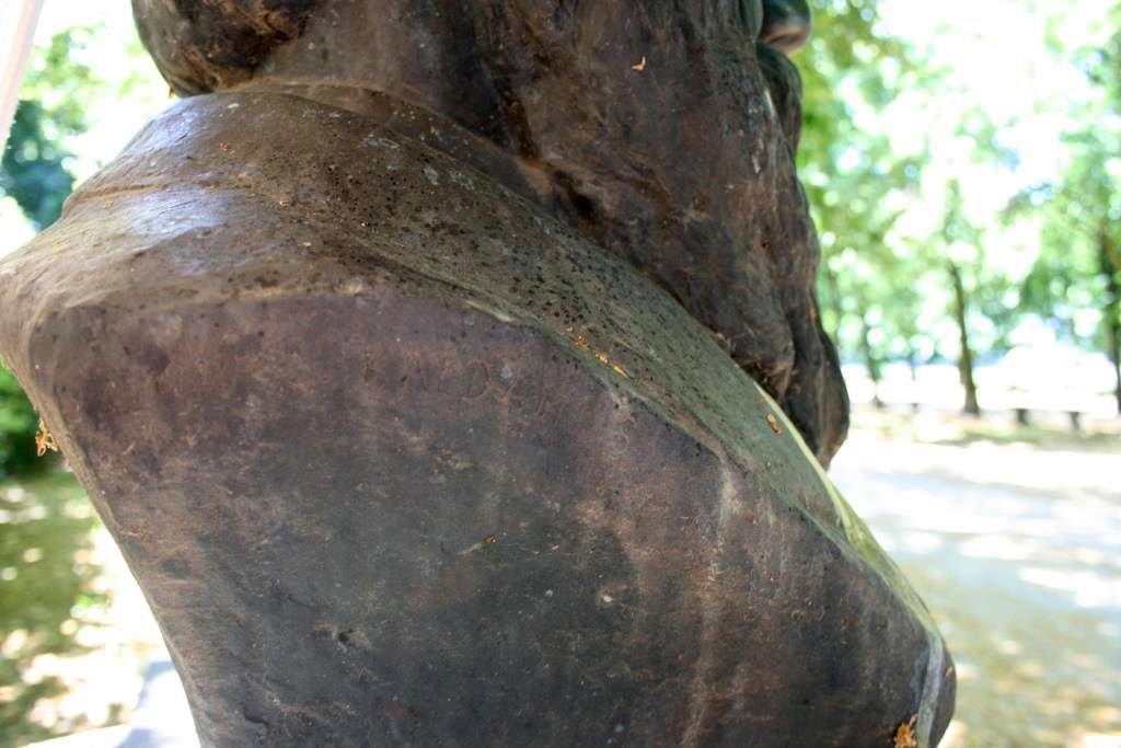 Auf einem Sandsteinpidestal sitzt die Porträtbüste des Naturforschers Charles Darwin auf, dem Namensgeber der Darwin’schen Evolutionstheorie und des sogenannten Darwinismus.