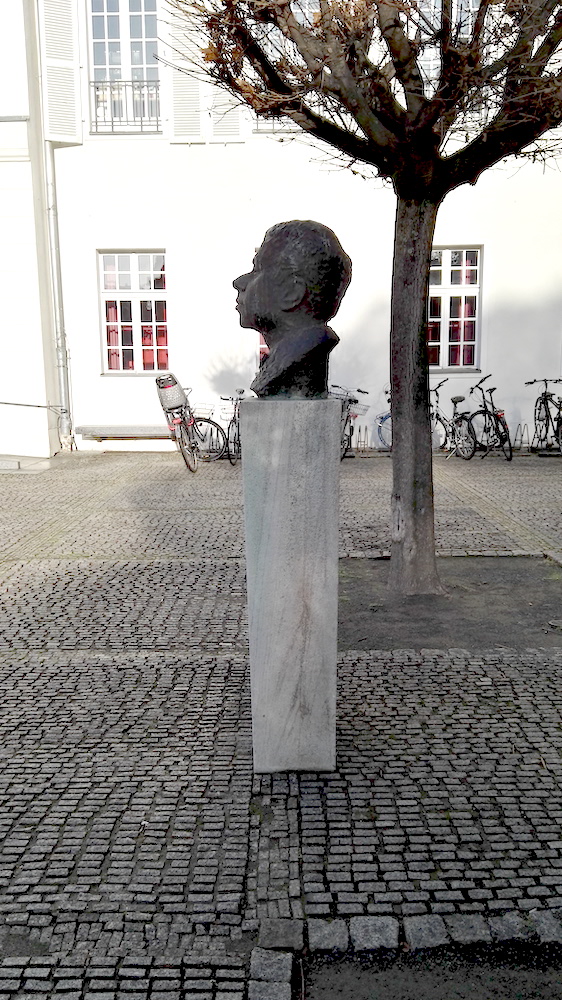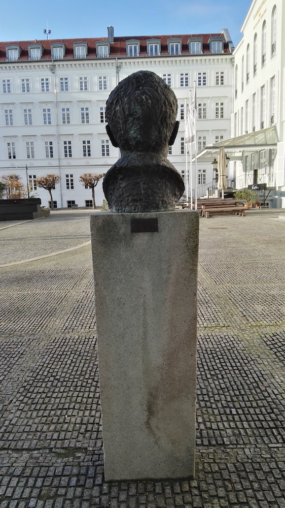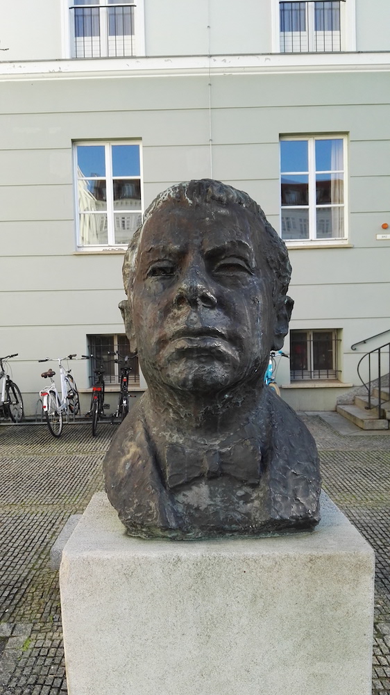 Auf einem rechteckigen Sockel aus Beton steht eine Porträtbüste, welche das Abbild von Max Reinhardt, dem österreichischen Theater- und Filmregisseur und ehemaligen Leiter des Deutschen Theater und der Berliner Volksbühne, zeigt. Auf der Front des Sockels ist vertieft die Inschrift (MAX / REINHARDT / 1873 / -/ 1943) zu lesen. Gekleidet in Anzug und Fliege, hat der Abgebildete sein Haupt leicht angehoben und richtet den konzentrierten Blick direkt nach vorne. Die Oberfläche der Bronze ist leicht bewegt. (Matthias Gegner)