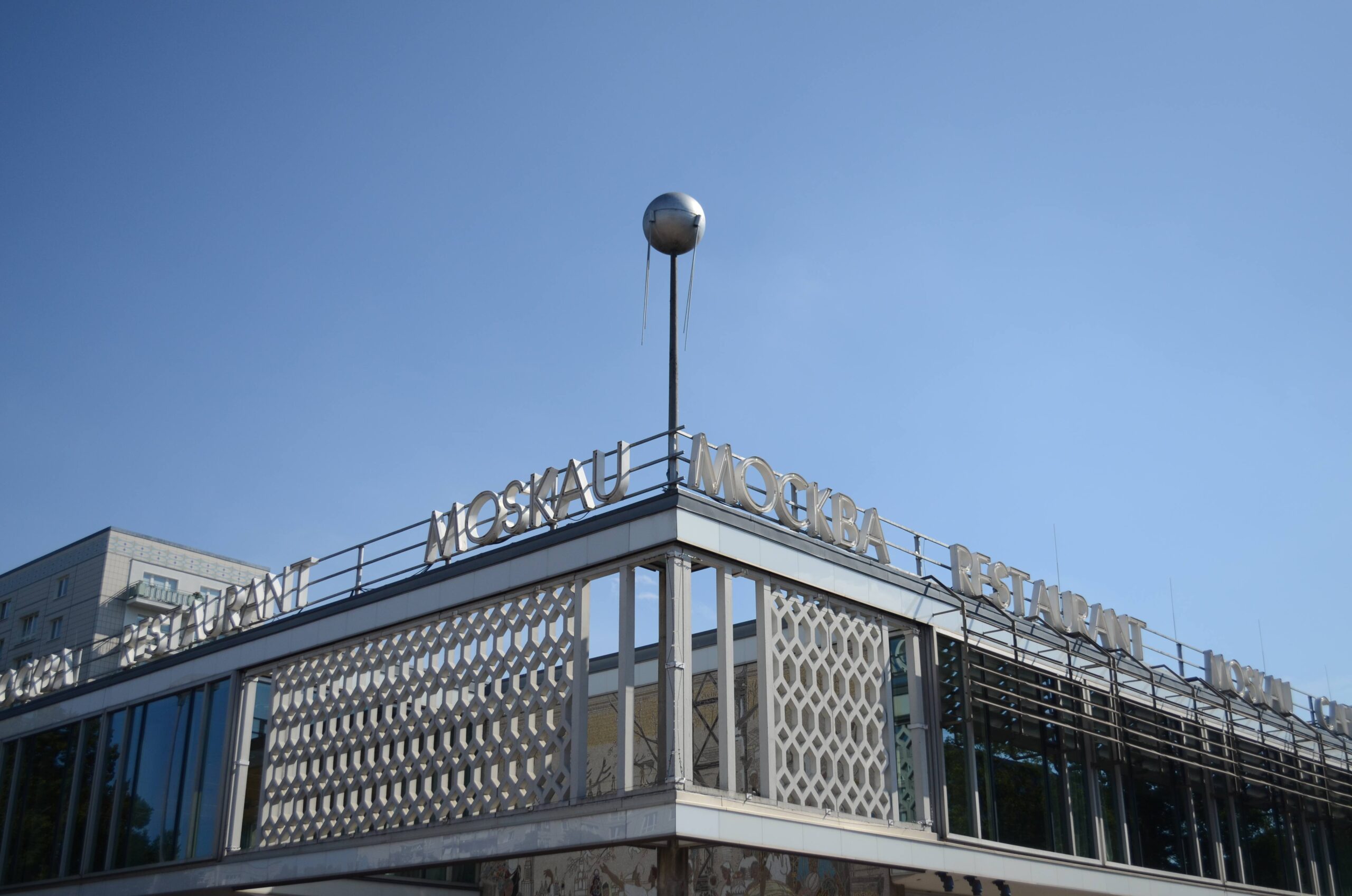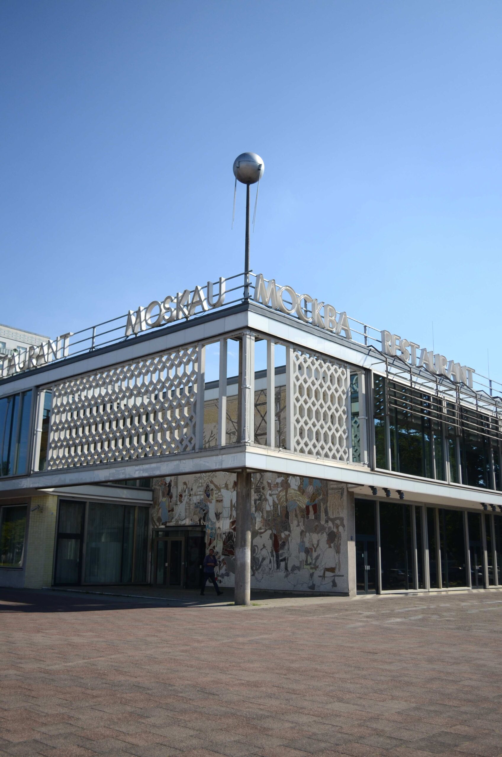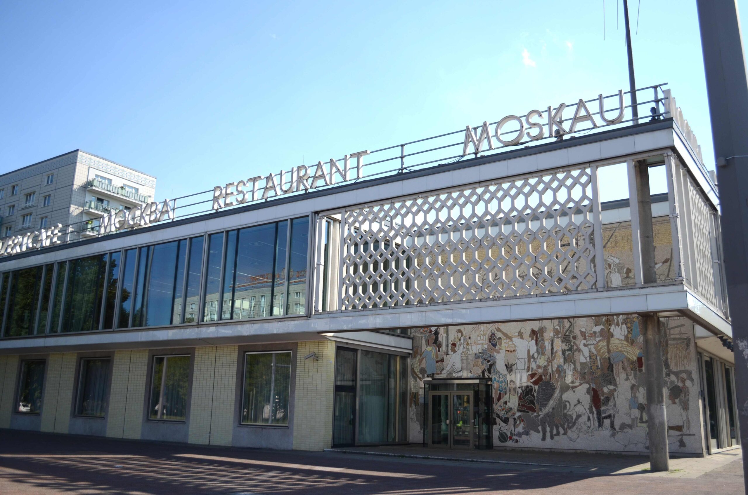 Der Architekt Josef Kaiser entwarf den zweigeschossigen Bau für das Caé Moskau 1959. Die umlaufende Leuchtreklame mit dem Namenszug beruht auf einem Entwurf des Grafikers Klaus Wittkugel (vgl. Denkmaldatenbank Berlin). “Die ehemalige Nationalitätengaststätte Restaurant Moskau, gegenüber dem Kino International [...], ist nach einem Gestaltungskonzept entwickelt, das auf Transparenz, Ornamentlosigkeit und der Durchdringung von Innen und Außen ausgerichtet war.” (Quelle: Denkmaldatenbank Berlin: https://denkmaldatenbank.berlin.de/daobj.php?obj_dok_nr=09011370).) “Die Gaststätte mit dem programmatischen Namen war einst die DDR-weit bekannte Adresse für russische Küche in der Hauptstadt. [...] Die ursprüngliche Planung sah einst ein sogenanntes gläsernes Labyrinth mit Rosengarten und Innenhof vor, in dem auch größere Gruppen Platz finden sollten. Doch eine interne Neuordnung räumte 1982 mit den großräumigen Zuschnitten auf: Anstelle weniger großzügiger Gasträume gab es nun mehrere kleine Bars, Salons und Cafés. Nach der Wende gab es keine Kundschaft mehr für diese Art komplexer sozialistischer Erlebnisgastronomie, so dass die Räume allmählich zu verfallen drohten.” (Quelle: Dubrau 2009, Band 2, S. 617) 2007 erwarb die Nicholas-Berggruen-Holding das Objekt und ließ es bis 2010 denkmalgerecht renovieren. Die Deutsche Stiftung Denkmalschutz zeichnete die Fassade mit dem Bundespreis für Handwerk in der Denkmalpflege aus.