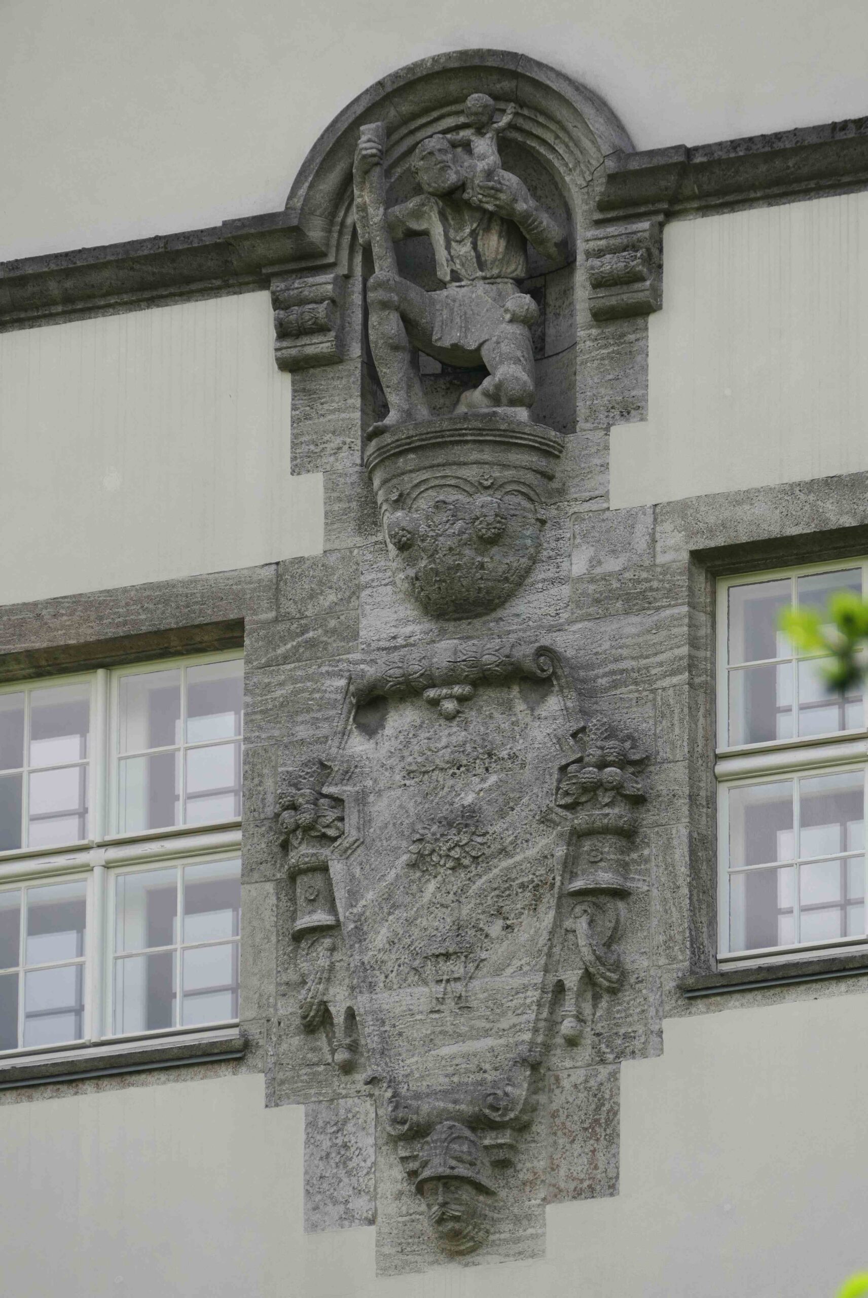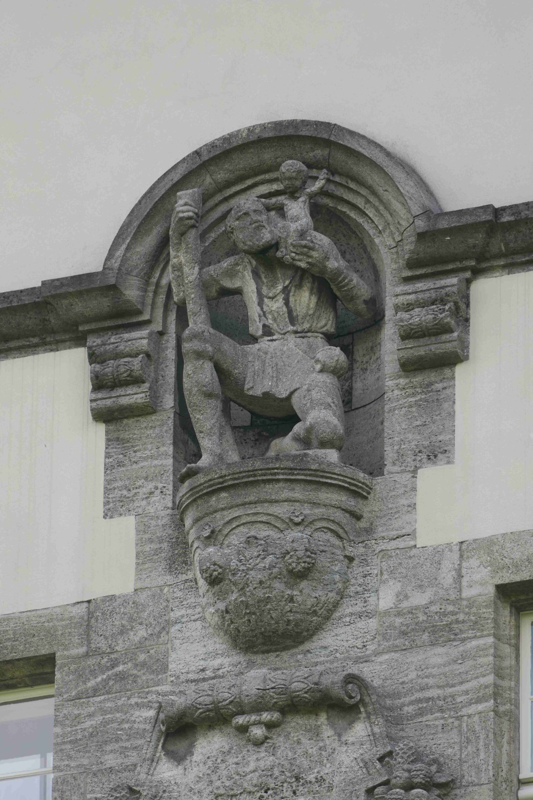 Der Bildhauer Josef Wackerle schuf die aus Muschelkalk bestehende Statue und das Wappen vermutlich um 1917. Laut einer zeitgenössischen Beschreibung soll „der Christophorus, der unter der Last des Christuskindes schreitet, die Schwere der Kriegszeit versinnbildlichen.“ (Nicola Vösgen).
