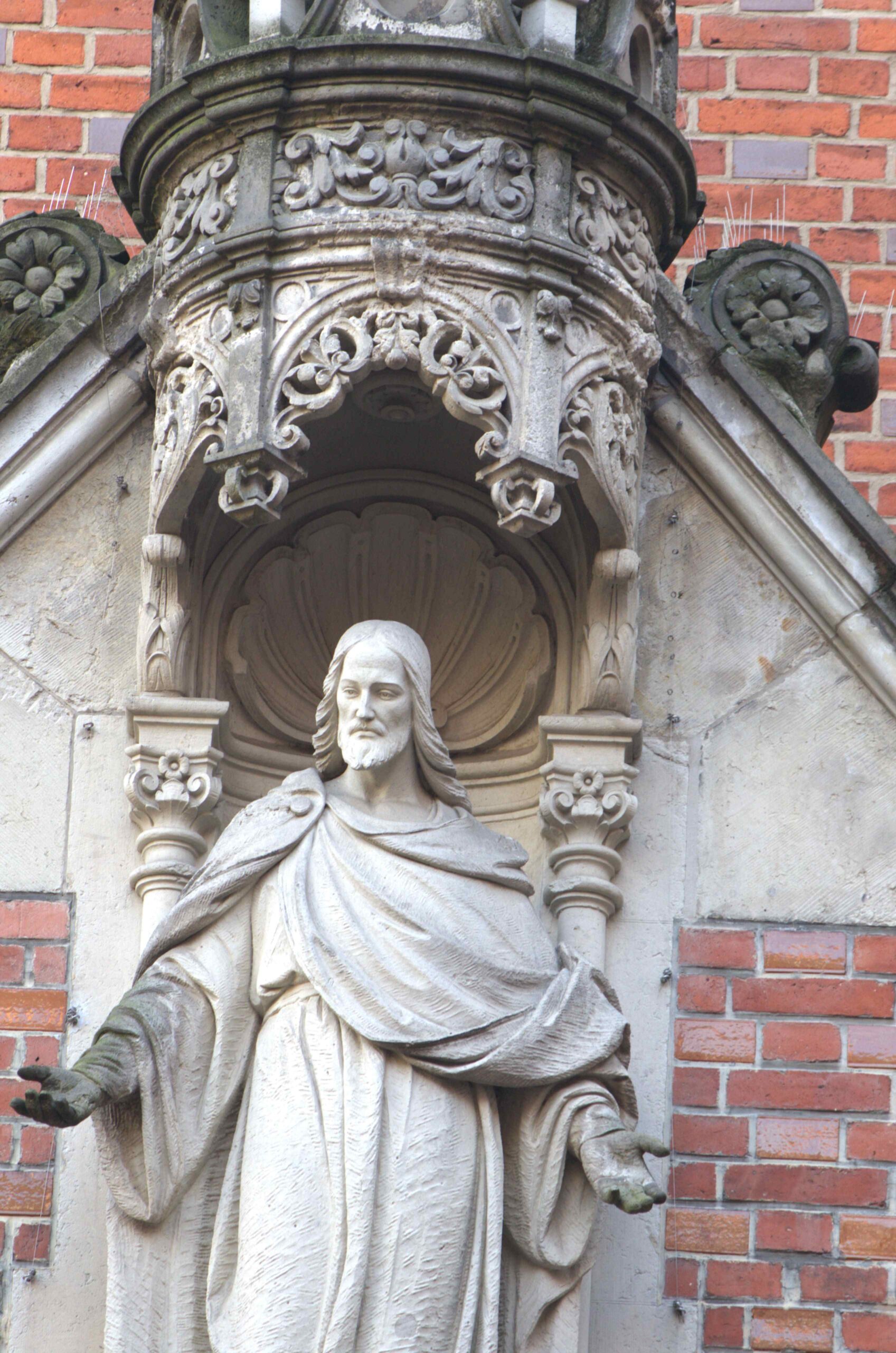 Der Bildhauer Heinrich Giesecke schuf das Modell für die Christusstatue um 1903/04. Die Ausführung in Sandstein erfolgte durch das Steinmetzgeschäft Phillip Holzmann. Das ca. halblebensgroße Modell des Christus befindet sich im Treppenhaus des ehemaligen Pfarr- und Gemeindehauses (Nicola Vösgen).
