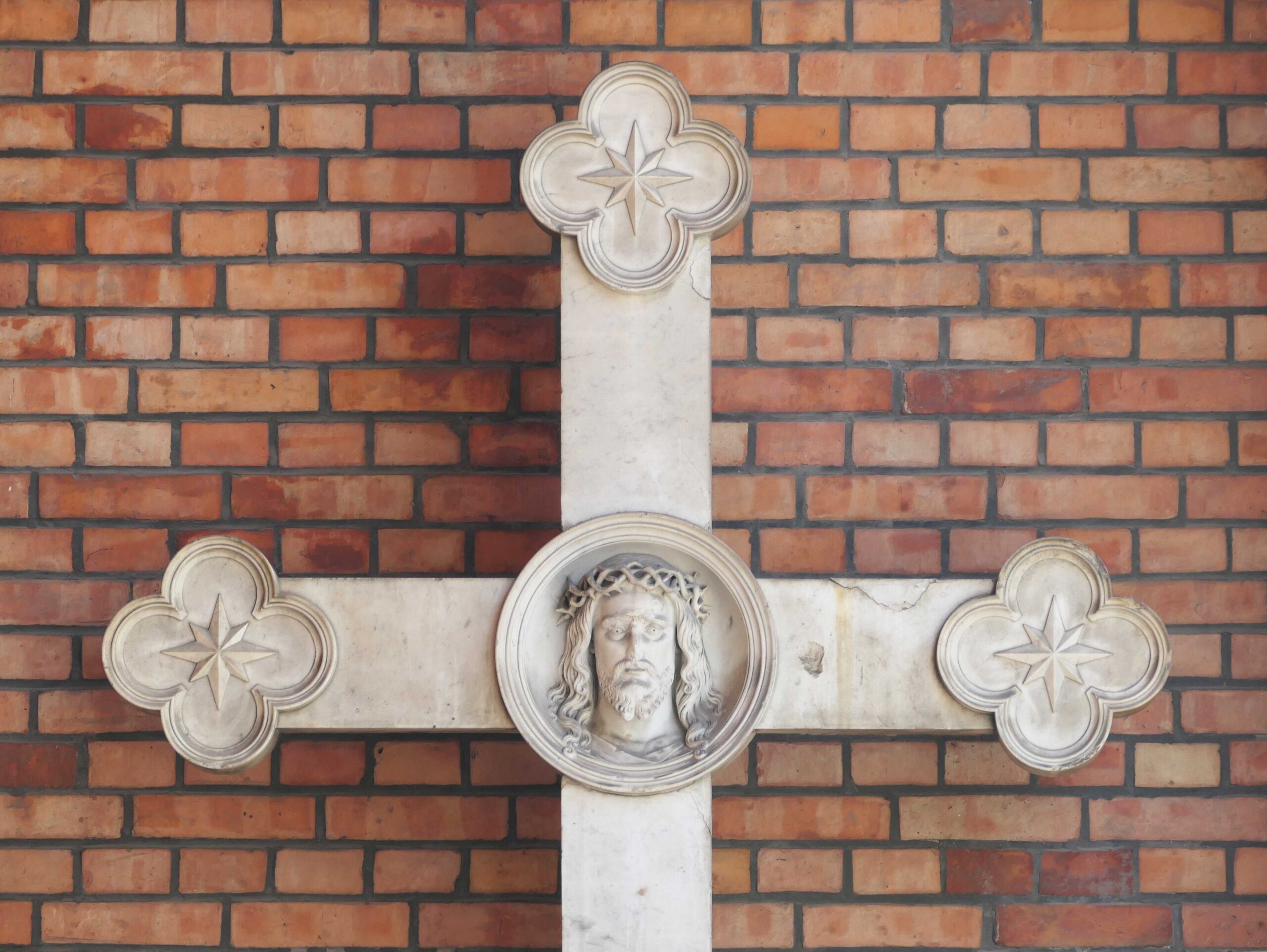 Ein ca. 10 Fuß (ca. 3 Meter) großes Kreuz steht an der östlichen Seitenwand der Vorhalle der St. Lukas-Kirche. Die Kreuzarme weisen Vierpassenden auf, im Schnittpunkt der beiden Kreuzarme ist ein Medaillon mit der Darstellung eines dornengekrönten Christuskopfes eingelassen (Nicola Vösgen).