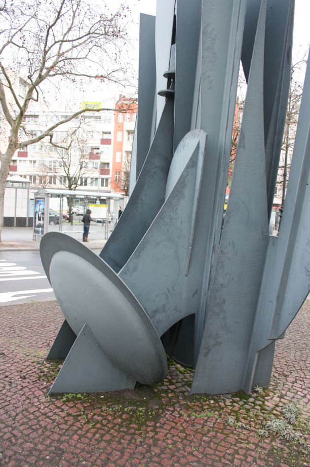 1980 wurde diese Plastik vom Berliner Senat aus Mitteln des Skulpturengartens am Funkturms unter dem Juryvorsitz Eberhard Roters erworben. Sie war vom Künstler zwar zunächst bei einer Ausstellung in der Hamburger Moorweide gezeigt worden, geschaffen hat er sie jedoch unter Bezugnahme auf das 1926-1928 nach Entwürfen von Erich Mendelsohn errichtete, ehemalige Universum-Kino, das um 1976-81 nach Plänen von Jürgen Sawade zur Schaubühne am Lehniner Platz umgebaut wurde und dessen Bau die charakteristische Wandscheibe zeigt, die sich in die zum Platz weisende, halbrunde Fassade des Gebäudes hineinschiebt. Die Aufstellung von Bernhard Heiligers Plastik "Auge der Nemesis" erfolgte 1981 vis a vis der Schaubühne direkt auf den Mittelstreifen des Kurfürstendamms. Die Arbeit ist das erste große Stahlobjekt des Euvres und markiert den Aufbruch in Heiligers letzte Werkphase. Eine große vertikale Scheibe, die den Boden nur an einem Punkt berührt, korrespondiert mit dem Halbrund des Theaterbaus. Dem Flächenrelief, das durch vorgesetzte Rippen strukturiert ist, setzte Heiliger eine Raumkugel als vollplastisches Element entgegen. (Marc Wellmann, Susanne Kähler)