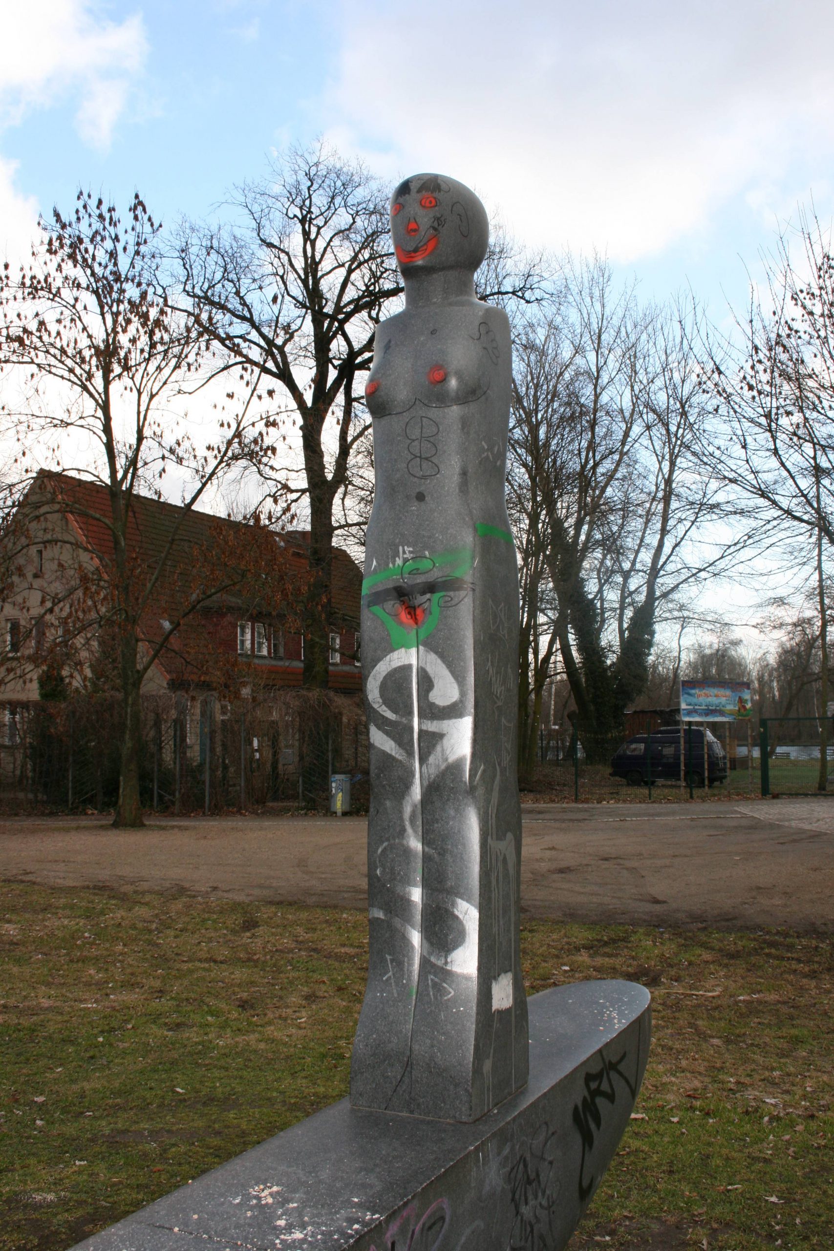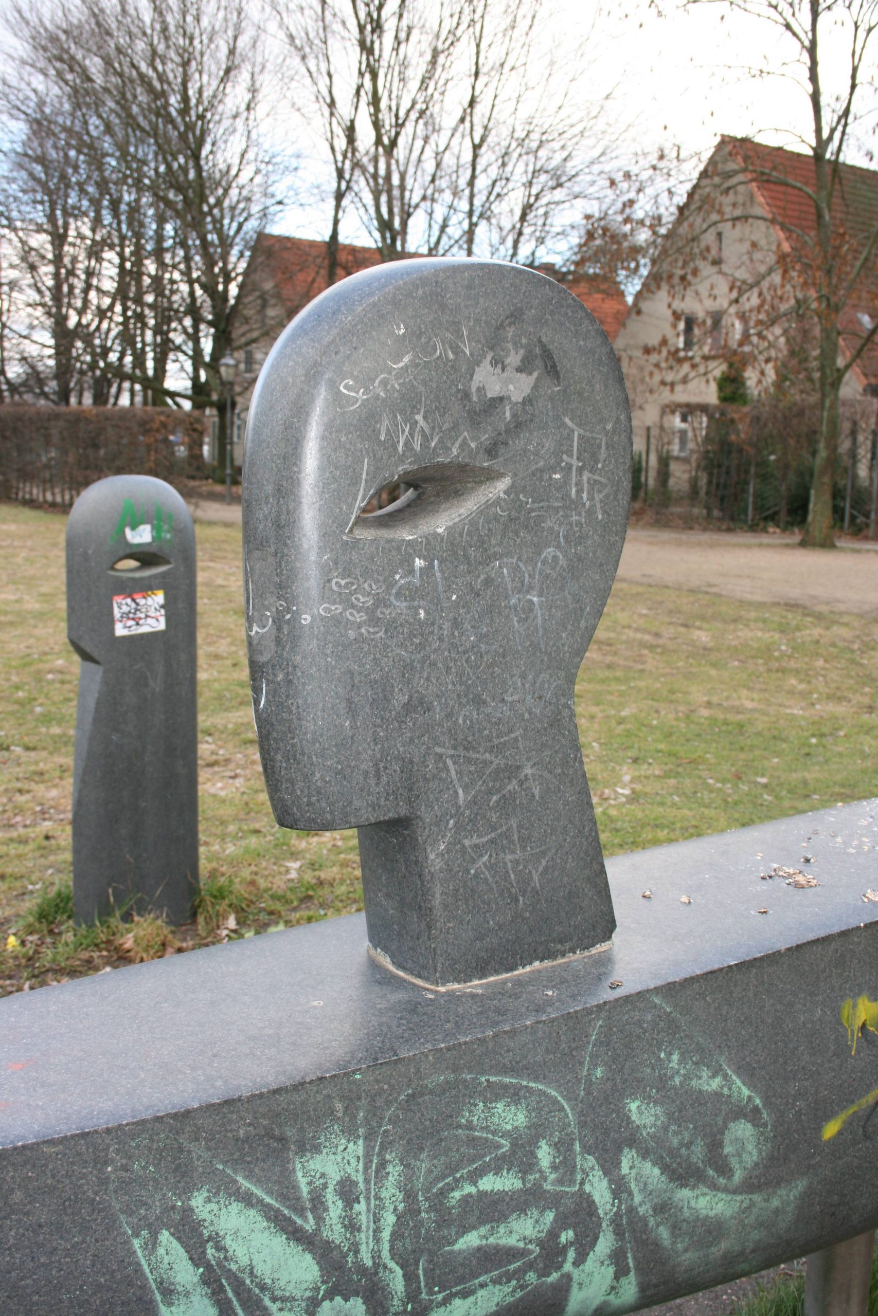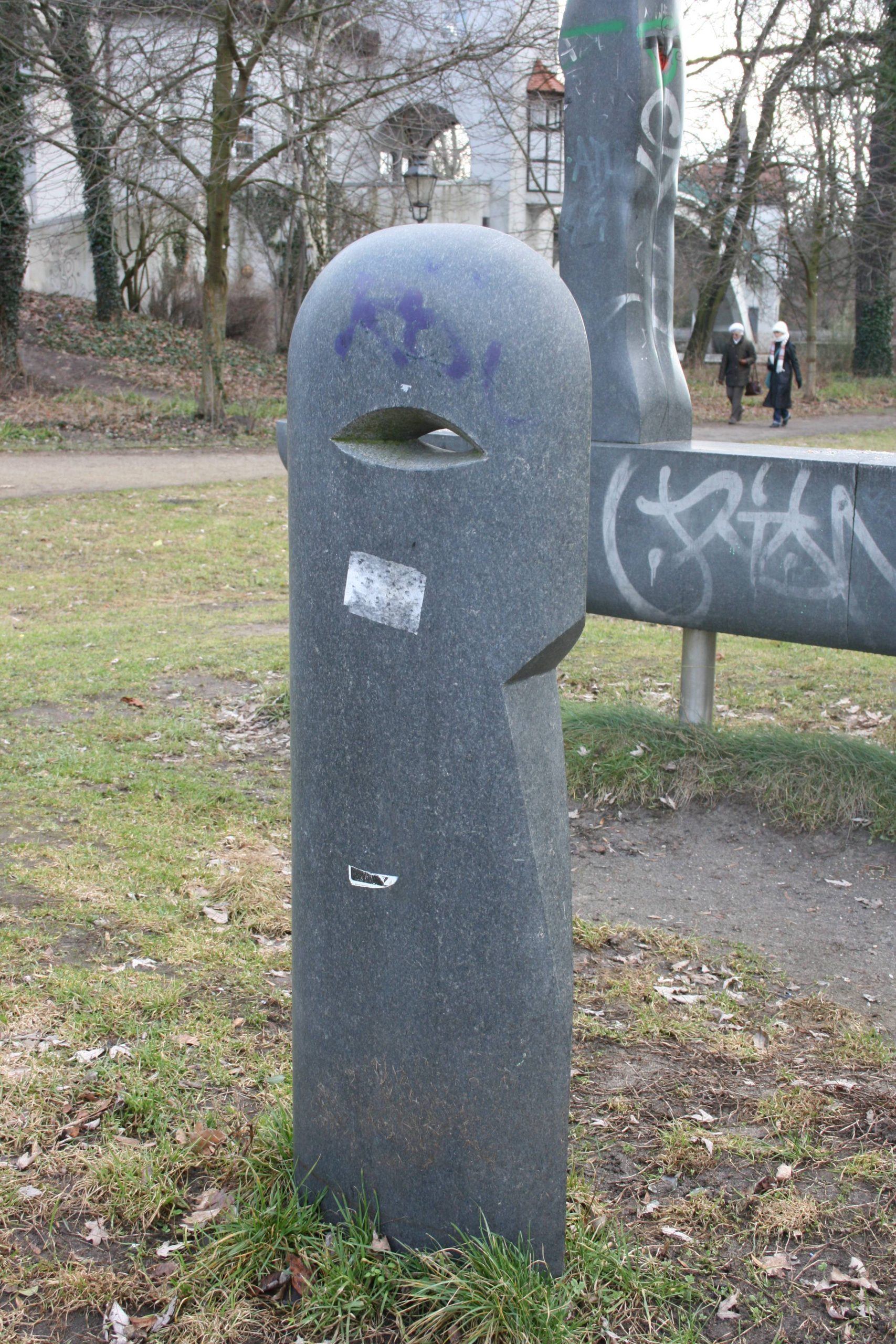 Dargestellt ist ein Boot mit einem (vermutlich rudernden) Mann und einer stehenden Frau. Dahinter taucht (wie aus dem Wasser) eine weitere Figur auf. Das Kunstwerk besteht aus zwei separat aufgestellten Teilen. Das größere Element ist über zwei Edelstahlrundfüßen aufgeständert und gibt in stark abstrahierender Form ein Boot wieder. Das Boot wurde aus fein poliertem Schiefer geschaffen. Aufgesetzt wurde rechts eine säulenhaft statisch aufgefasste, nach Norden blickende weibliche Figur aus dem gleichen Material in abstrahierender Formulierung. Ihr gegenüber wurde ein stark abstrahierter menschlicher Kopf mit Augenschlitz (in dessen Innerem der Stein nur grob bearbeitet ist) und Mundöffnung platziert, ebenfalls aus dem gleichen feinen graugrünen Material. Hinter dem Element in Bootgestalt steht separat ohne Sockel ein auf schlankem, nicht weiter gegliedertem Körper ein weiterer menschlicher Kopf mit Augenschlitz (das Innere analog zum „Boot-Kopf“ nur grob bearbeitet) und weit geöffnetem Mund (Jörg Kuhn, Susanne Kähler).