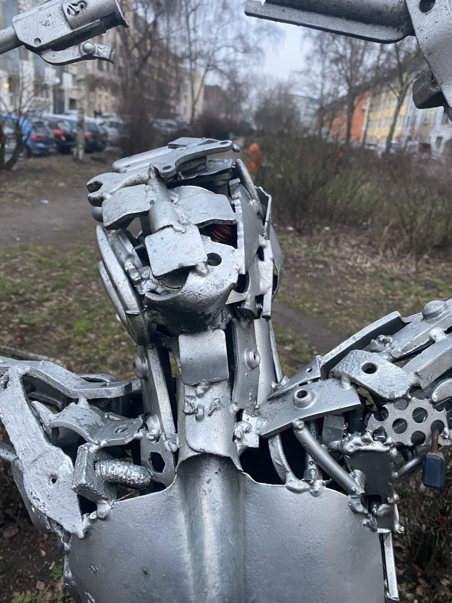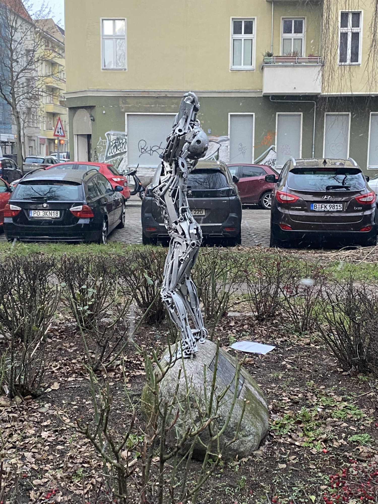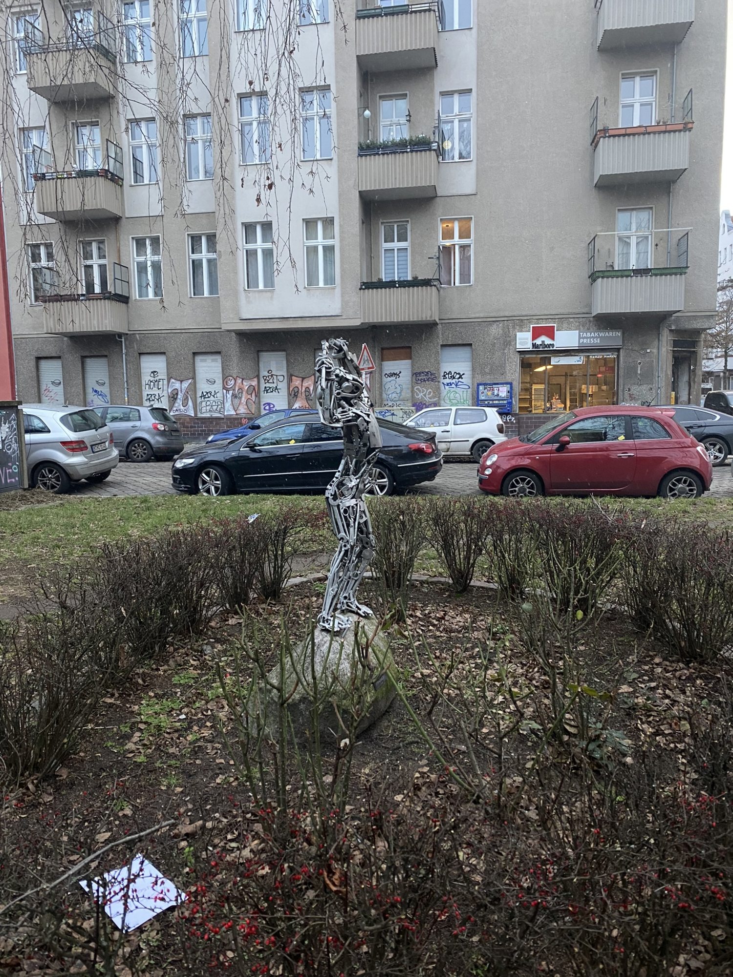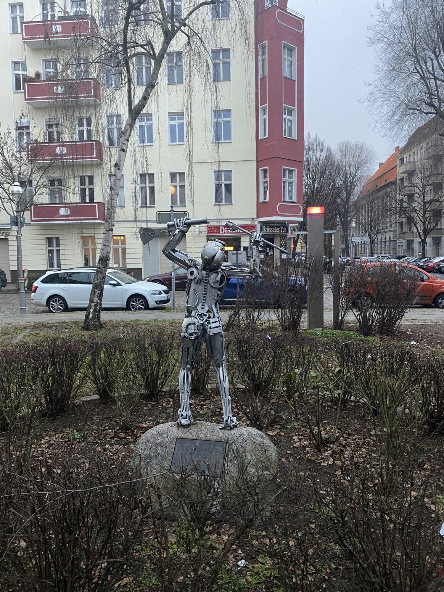 Aufgestellt wurde die Plastik am 1. Oktober 2005. Eine in den Stein eingelassene Gedenktafel weist auf den Ort, die Ernst-Friedrich-Promenade, sowie auf die Person Ernst Friedrich hin. Ernst Friedrich war Schriftsteller und Pazifist, sowie Gründer des weltweit ersten Anti-Kriegs-Museum, welches 1925 in der Brüsseler Straße gegründet wurde (vgl. Über uns – Anti Kriegs Museum: in: Anti-Kriegs-Museum, o. D., https://anti-kriegs-museum.de/ueber-uns/#1).