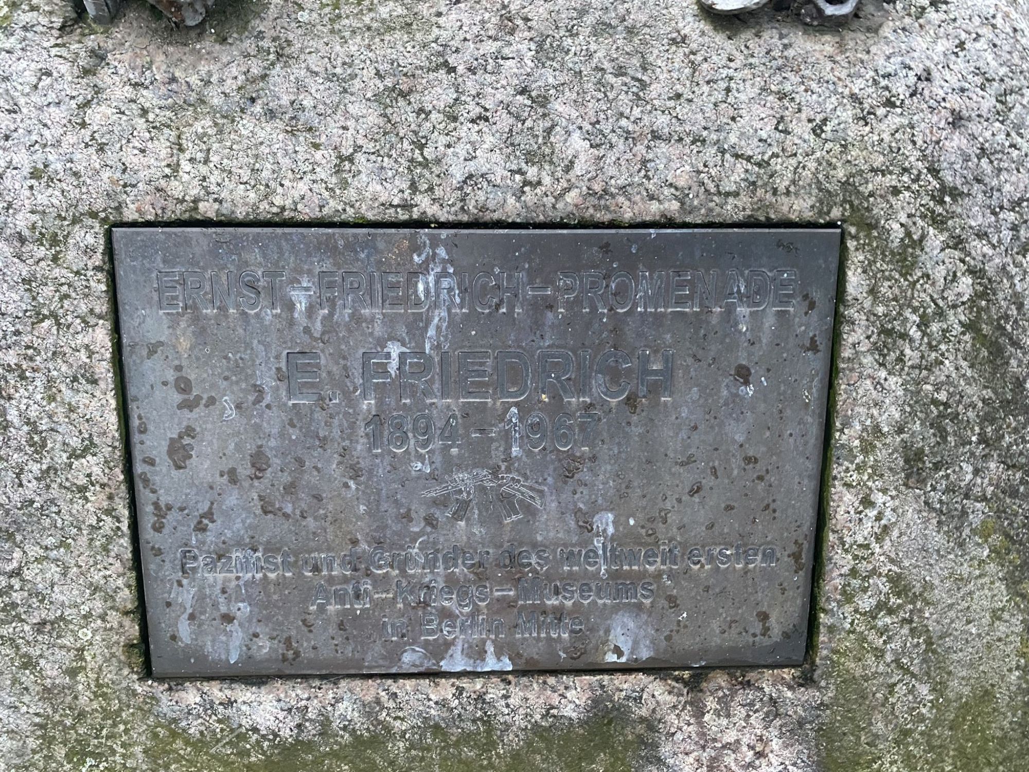 »ERNST-FRIEDRICH-PROMENADE / E. FRIEDRICH / 1894 -1967 / [Motiv des zerbrochenen Gewehrs mit zwei Händen] / Pazifist und Gründer des weltweit ersten / Anti-Kriegs-Museums / in Berlin Mitte«