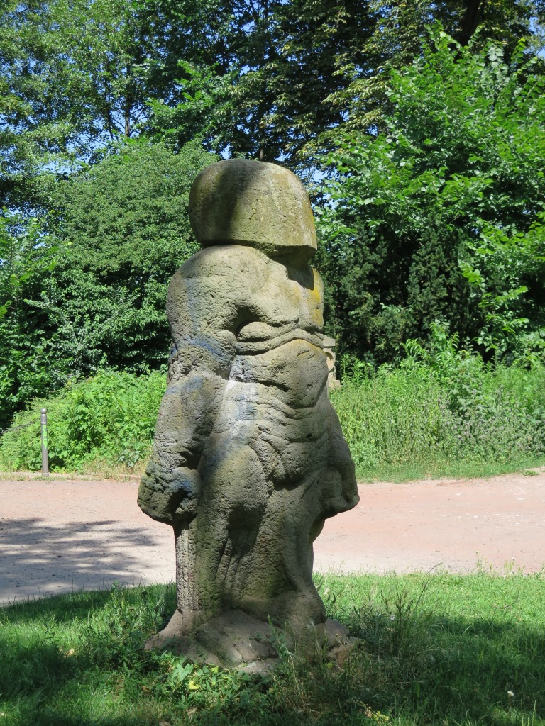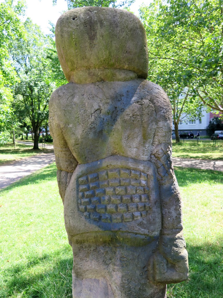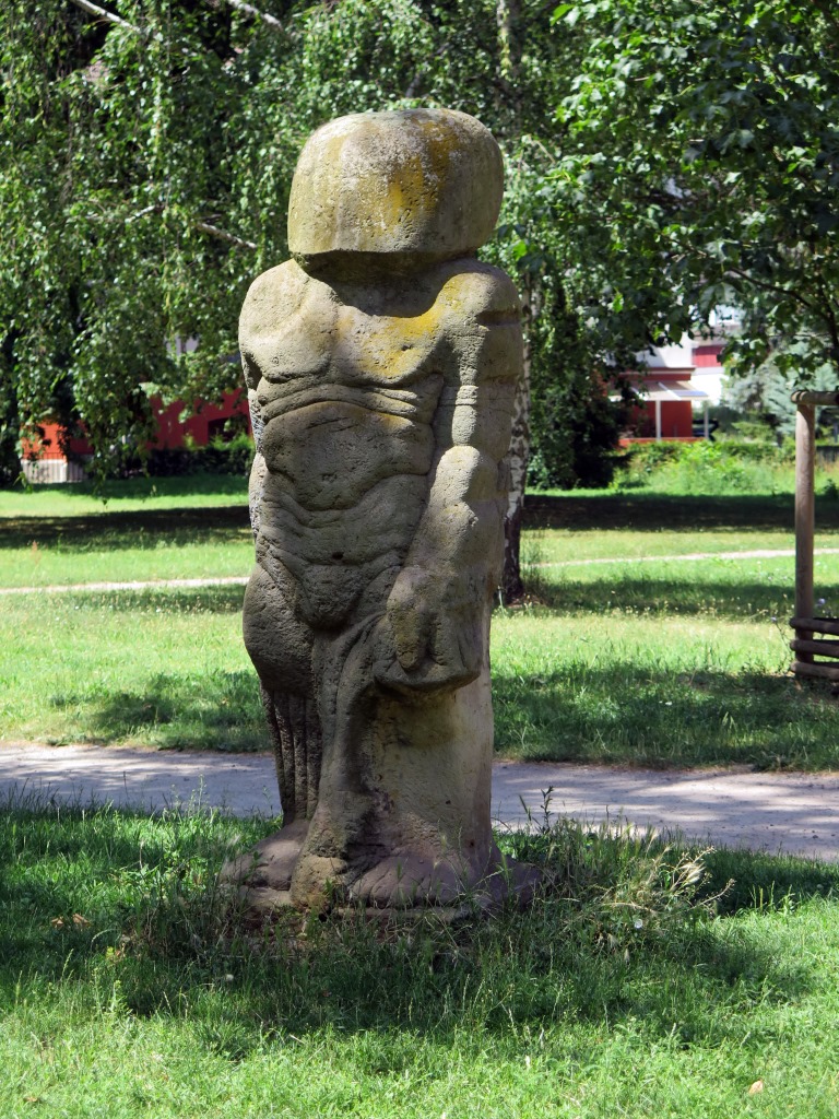 Zweiteilige Skulpturengruppe. Südlich des Fennpfuhlsees steht südlich der Wegekreuzung an der auch die „Impressionen“ von Claus-Lutz Gaedicke aufgestellt sind, die Zweiergruppe David und Goliath. Der weit überlebensgroße abgeschlagene Kopf des Goliath liegt seitlich, von seinem rechten Ohr abgestützt, auf der Rasenfläche. Die Augen sind noch halb geöffnet, der Mund bereits geschlossen. In einer Entfernung von ca. 3 Meter steht westlich davon der nur leicht überlebensgroße unbekleidete und barfüßige David, der gerade den Kampf gegen Goliath gewonnen hat. Die Arme hängen seitlich neben dem Körper, in der linken Hand hält er noch seine Schleuder. Das Gesicht ist von einem überdimensionalen glatten Helm verdeckt und wirkt dadurch völlig anonymisiert. Auf seinem Rücken befindet sich ein tastaturähnliches Gebilde. Aufgrund der blockhaften Gestaltung, der Gesichtslosigkeit und der technischen Beigabe wirkt die Figur eher wie eine Maschine, als ein Mensch. Eine Bildhauersignatur: BIEBL befindet sich an der Rückseite des Sockels mittig. Ein Metallschild rechts neben der Figur auf dem Fundament gibt Auskunft über Titel, Bildhauer, Material und Entstehungsjahr: DAVID / Rolf Biebl – DDR / Sandstein 1987. Die Bildhauersignatur von Clemens Gröszer befindet sich hinter dem linken Ohr des Goliath: CG 87, wobei das „G“ seitenverkehrt gemeißelt ist. Ein Metallschild neben der Figur auf dem Fundament gibt Auskunft über Titel, Bildhauer, Material und Entstehungsjahr: GOLIATH / Clemens Gröszer – DDR / Sandstein 1987 (Nicola Vösgen).