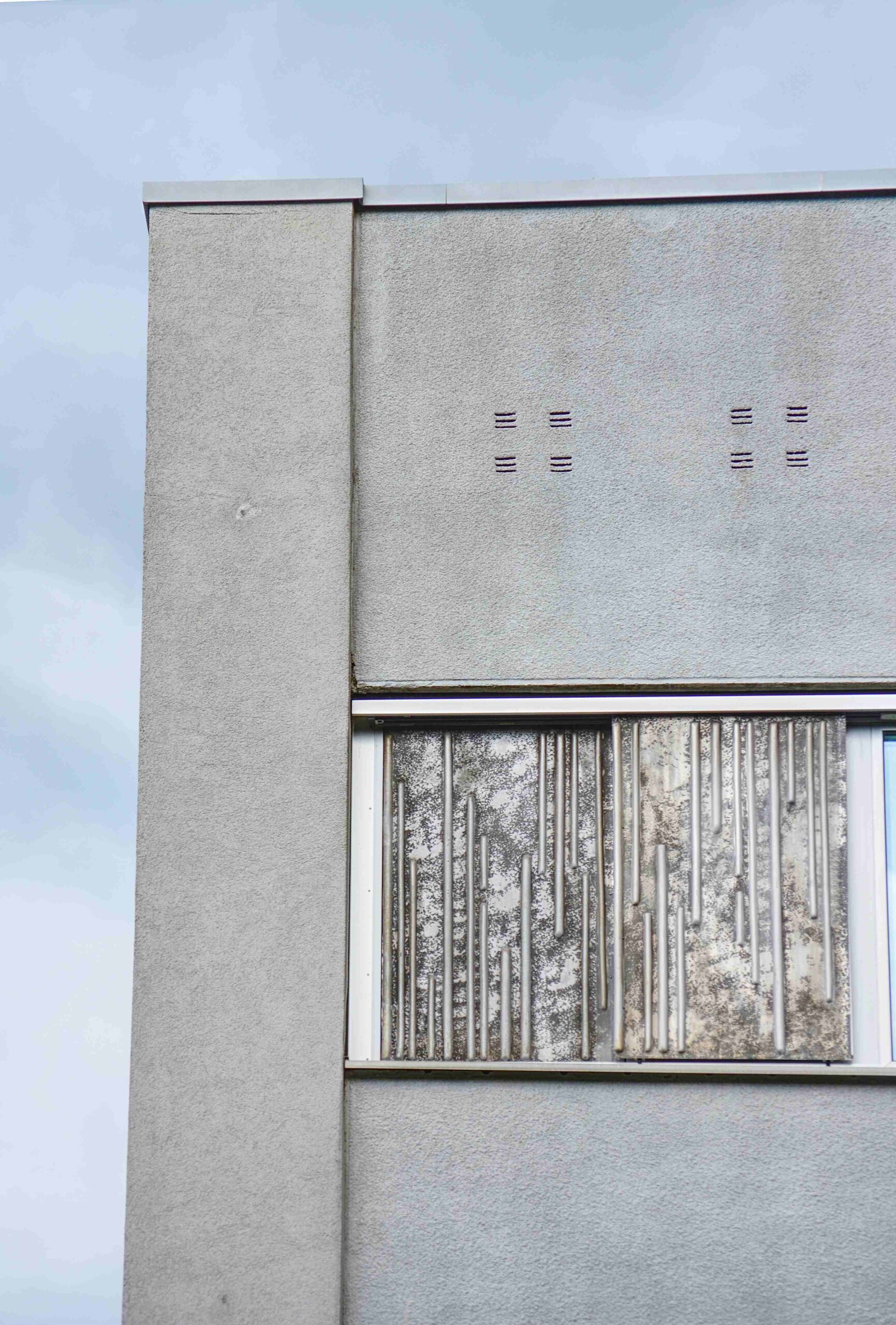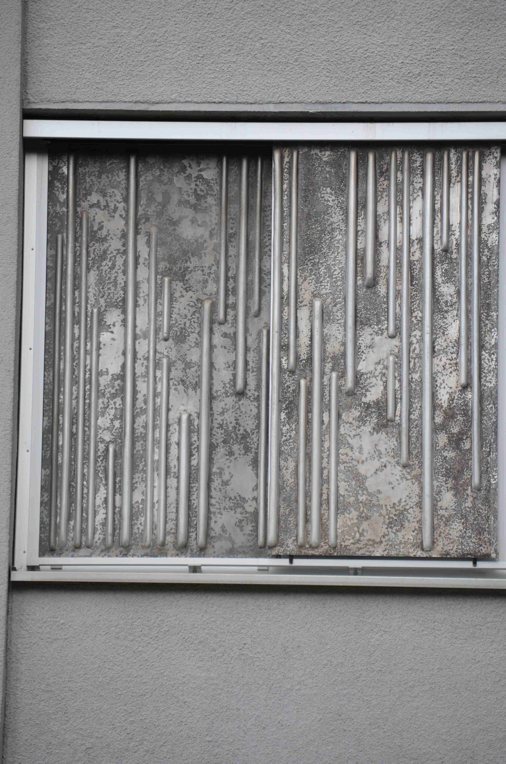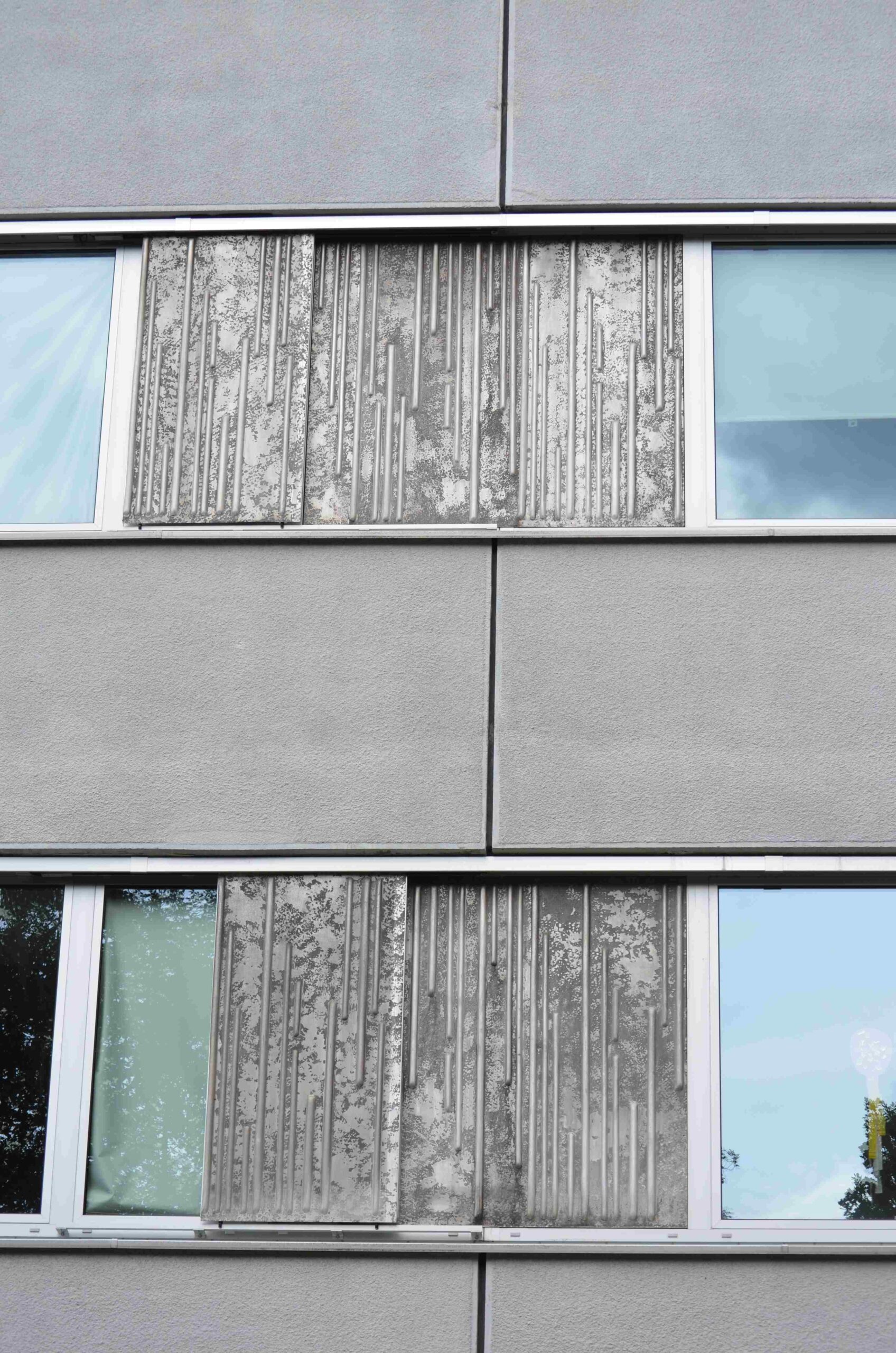Dekorative Metallgestaltungen, welche als Verblendpaneele dienen. Die Platten sind mit erhabenen vertikal verlaufenden Linien dekoriert. Die Anordnung der Linien variiert dabei (Pauline Ahrens).