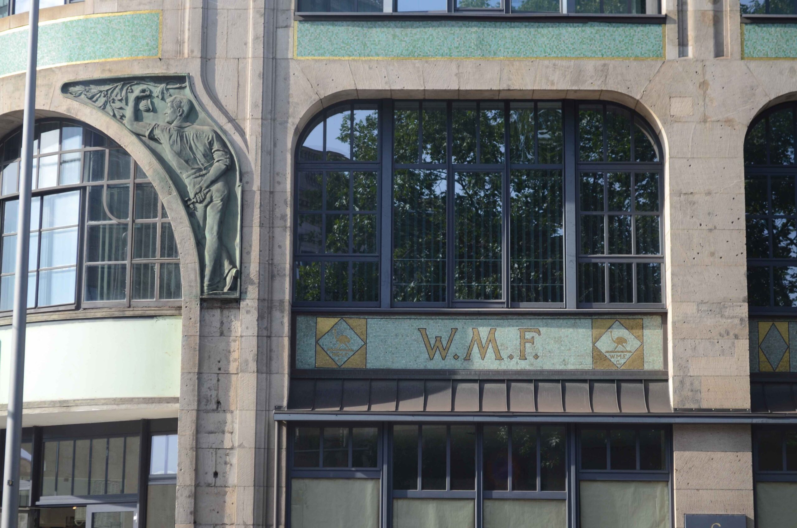 Die Gestaltung des umlaufenden Schmuckbandes mit goldenem Details und Namenszug der Firma wurde 1904 bei der Errichtung und Gestaltung des Geschäftshauses der Württembergischen Metallwarenfabrik in der Leipziger Straße, nach einem Entwurf von Eisenlohr & Weigle, in die Fassade eingearbeitet. WMF verwendete seit ca. 1903 eine Punze mit Strauß (sog. Straußenmarke), weshalb das Tier vermutlich auch als Dekor gewählt wurde.