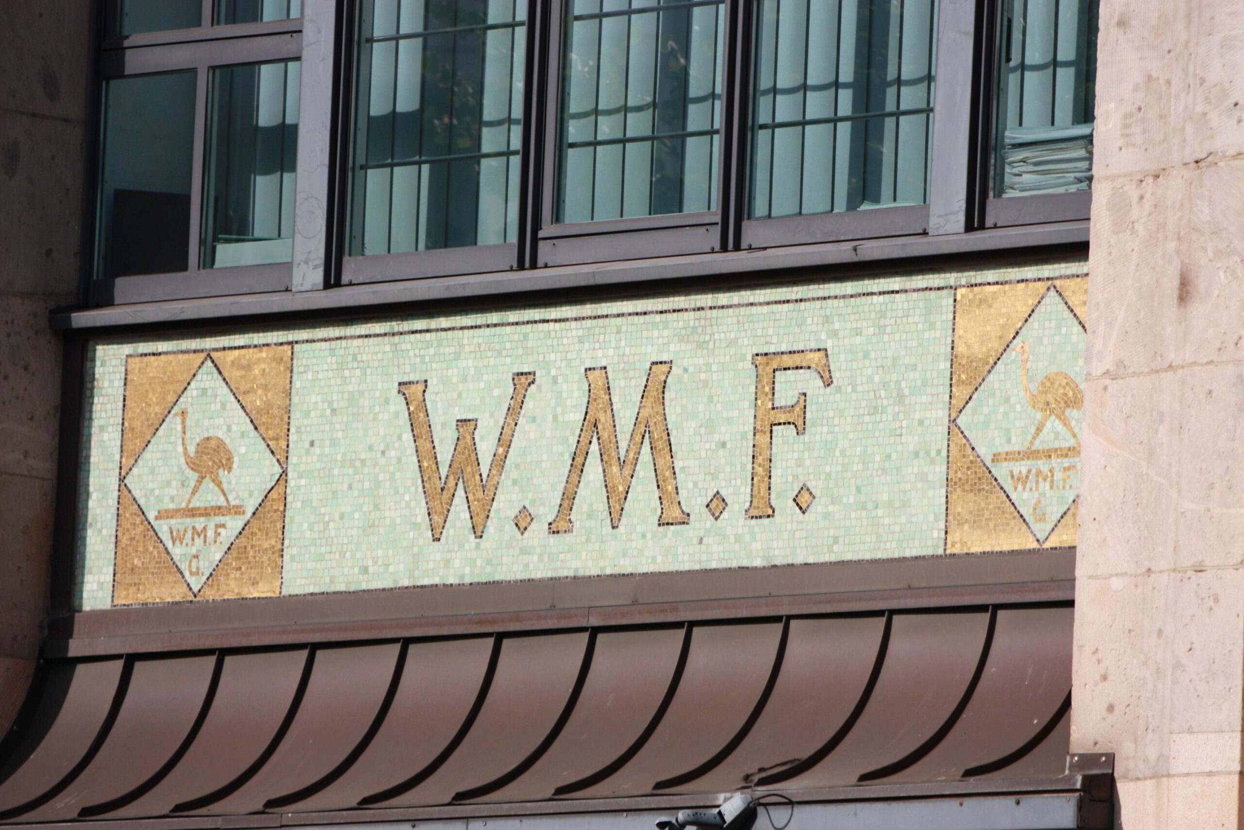 Die Gestaltung des umlaufenden Schmuckbandes mit goldenem Details und Namenszug der Firma wurde 1904 bei der Errichtung und Gestaltung des Geschäftshauses der Württembergischen Metallwarenfabrik in der Leipziger Straße, nach einem Entwurf von Eisenlohr & Weigle, in die Fassade eingearbeitet. WMF verwendete seit ca. 1903 eine Punze mit Strauß (sog. Straußenmarke), weshalb das Tier vermutlich auch als Dekor gewählt wurde.
