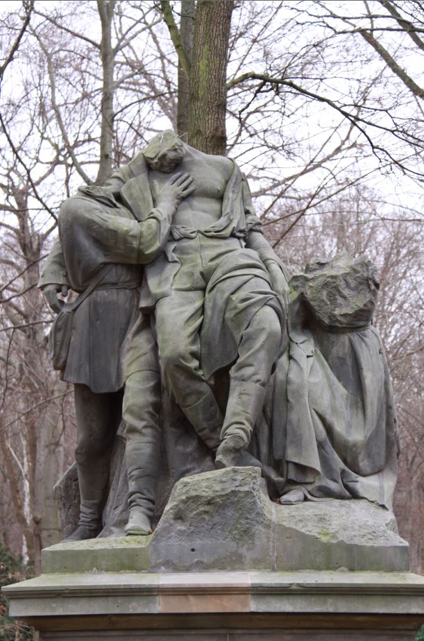 Dreifigurengruppe auf rechteckigem, vielfach profiliertem Sockel. Dem Thema der Gruppe entsprechend ist die mittlere Figur, der verwundete Soldat, durch ihr Volumen und die herausgehobene Stellung besonders betont. Der verwundete Soldat ist halb sitzend gegen einen Felsblock gelehnt, den linken Fuß hält er auf einem Felsblock abgestützt. Das Hemd ist über der Brust geöffnet, der (heute weitgehend verlorene) Kopf ist nach links gesunken. Ein Kriegskamerad steht links der Mittelfigur. Sein rechter Arm ist dem Verwundeten stützend in den Rücken gelegt. Der linke Arm ist zur Brust des Verwundeten hin leicht angewinkelt nach oben geführt. Die linke Hand liegt auf der Brust der Mittelfigur auf. Rechts der Hauptfigur kniet eine weibliche Figur im langen Gewand, dessen Falten sich dem Kniemotiv entsprechend in malerischen Falten staucht. Die Figur, vermutlich eine Krankenschwester, ist dem Verwundeten in teilnehmender und pflegerisch unterstützender Sorge zugewandt. Leider fehlen allen drei Figuren die Köpfe und auch weitere Fehlstellen beinträchtigen die Wirkung der Gruppe (Jörg Kuhn).