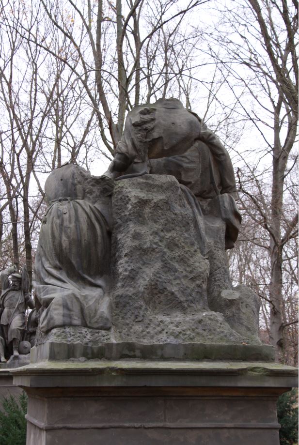 Dreifigurengruppe auf rechteckigem, vielfach profiliertem Sockel. Dem Thema der Gruppe entsprechend ist die mittlere Figur, der verwundete Soldat, durch ihr Volumen und die herausgehobene Stellung besonders betont. Der verwundete Soldat ist halb sitzend gegen einen Felsblock gelehnt, den linken Fuß hält er auf einem Felsblock abgestützt. Das Hemd ist über der Brust geöffnet, der (heute weitgehend verlorene) Kopf ist nach links gesunken. Ein Kriegskamerad steht links der Mittelfigur. Sein rechter Arm ist dem Verwundeten stützend in den Rücken gelegt. Der linke Arm ist zur Brust des Verwundeten hin leicht angewinkelt nach oben geführt. Die linke Hand liegt auf der Brust der Mittelfigur auf. Rechts der Hauptfigur kniet eine weibliche Figur im langen Gewand, dessen Falten sich dem Kniemotiv entsprechend in malerischen Falten staucht. Die Figur, vermutlich eine Krankenschwester, ist dem Verwundeten in teilnehmender und pflegerisch unterstützender Sorge zugewandt. Leider fehlen allen drei Figuren die Köpfe und auch weitere Fehlstellen beinträchtigen die Wirkung der Gruppe (Jörg Kuhn).