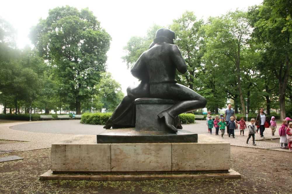 Auf der Nordseite des großen innen gelegenen Parkrondells des 1903 nach Achim von Arnim benannten Platzes ruht auf einem mächtigen rechteckigen und zweistufigen Sockel aus poliertem Travertin die rechteckige Plinthe einer monumentalen zweifigurigen Bronzeplastik. Die Gruppe zeigt ein auf einem Hocker sitzendes menschliches Paar in verschränkter Anordnung. Die Figuren haben jede ein ausgestrecktes und ein angezogenes oder angewinkeltes Bein. Die geglättete, teilweise summarische Formulierung erhöht neben der dunklen Patinierung der Bronze die Monumentalität der Plastik. Dargestellt sind in sparsam angedeuteter zeitgenössischer Kleidung und Haartracht das Dichterpaar Bettina und Achim von Arnim. An der Plinthenkante rechts sind erhaben in Schreibschrift die Signaturen von Bettine Arnim und Achim von Arnim zu lesen. Auf der rechten Seite des Sitzhockers ist erhaben eine mitgegossene runde Plakette zu sehen (Jörg Kuhn, Susanne Kähler).