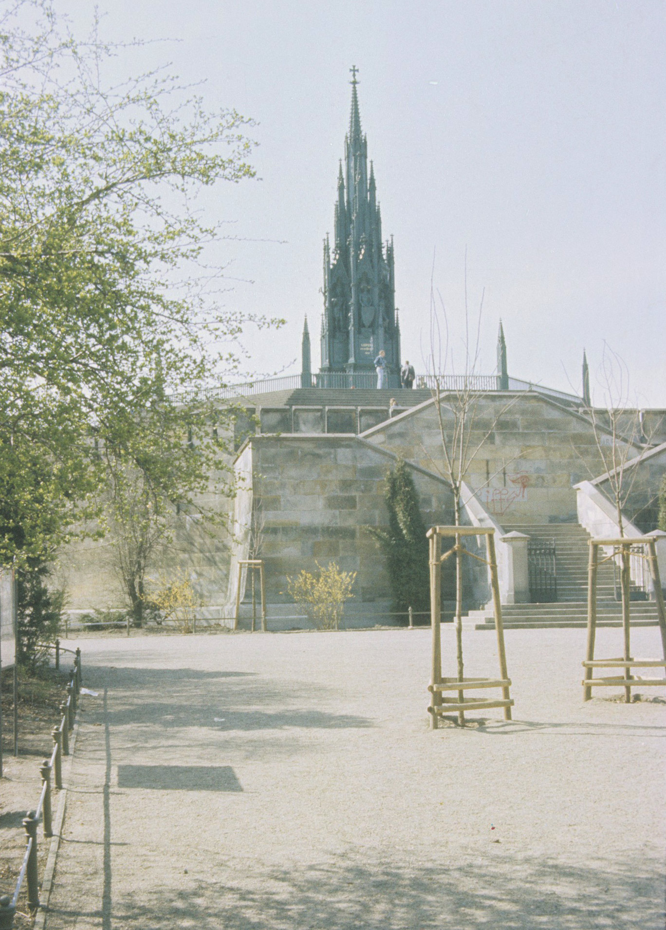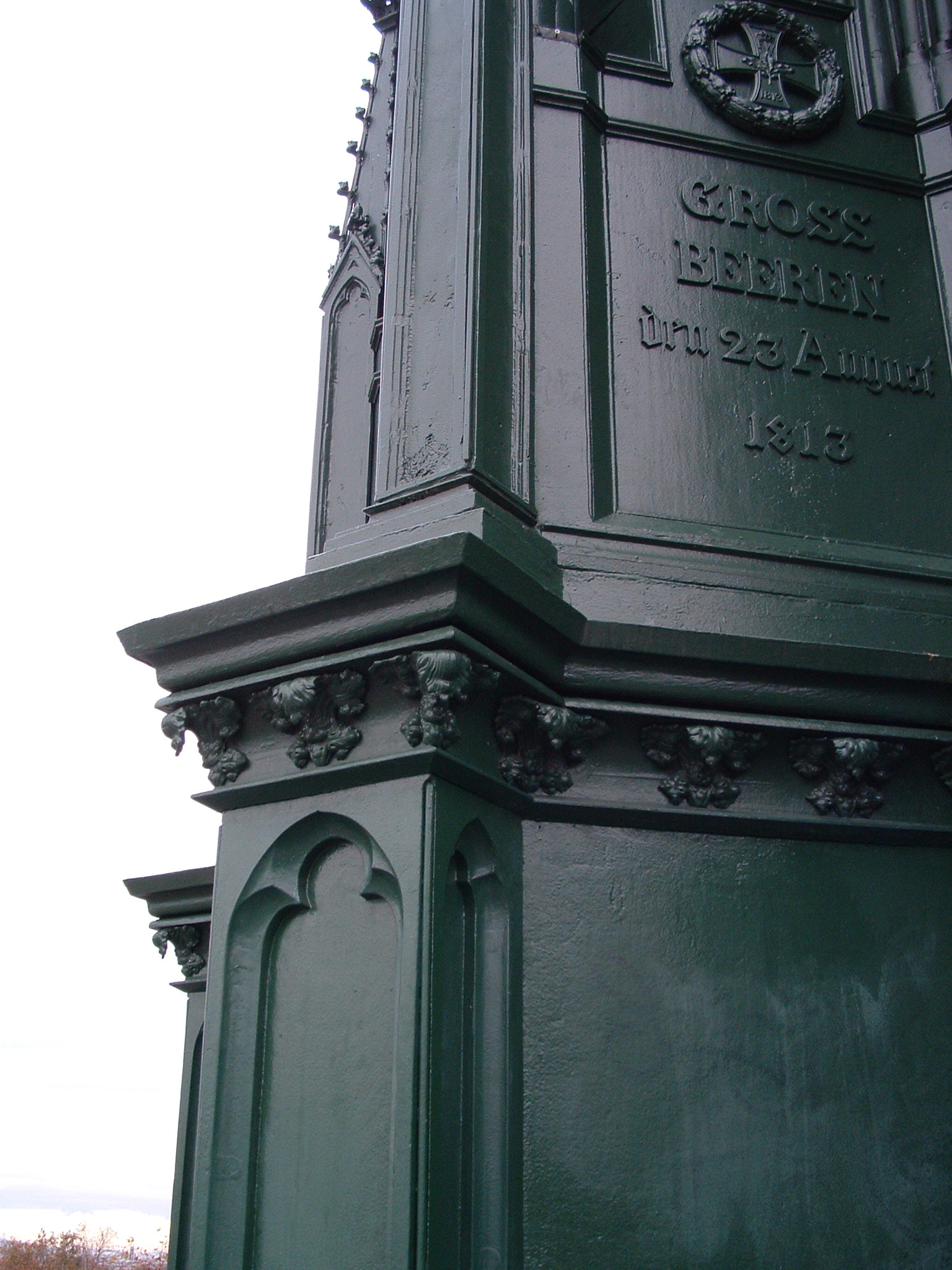 Das Kreuzbergdenkmal, gusseisernes Nationaldenkmal zum Gedenken an die Freiheitskriege von 1813 bis 1815, ein Werk des Architekten Karl Friedrich Schinkel, steht auf dem höchsten Punkt des Kreuzberges, des vormaligen Tempelhofer Berges, auf einem festungsartigen polygonalen Unterbau. Das grün gefasste Monument mit seiner detailreichen gotisierenden Architektur bestehend aus Maßwerkelementen, Fialen und Krabbenverzierung hat die Form eines Turmhelms über einem kreuzförmigen zwölfseitigen Grundriss. Die Spitze wird durch das Eiserne Kreuz bekrönt. In zwölf spitzbogige Nischen stehen Standbilder eingestellt, zwölf geflügelte Genien, die die wichtigsten Schlachten der Befreiungskriege personifizieren und gleichzeitig Porträtähnlichkeit mit Mitgliedern der Hohenzollernfamilie oder Generälen der Befreiungskriege in antikischer Gewandung oder in Rüstung aufweisen. Die Sockel der Genien werden jeweils durch das Eiserne Kreuz im Lorbeerkranz verziert, darunter nennt jeweils eine erhabene Inschrift den Ort der Schlacht und das Datum. Die Inschriften an den vier Kopfseiten des Denkmals, die vier wichtigsten Schlachten bezeichnend, wurden (auf Geheiß des Königs) durch eine goldene Fassung betont, es handelt sich um Groß-Görschen an der Ostseite, um Leipzig im Norden, um Paris im Westen und Belle Alliance (Waterloo) im Süden.