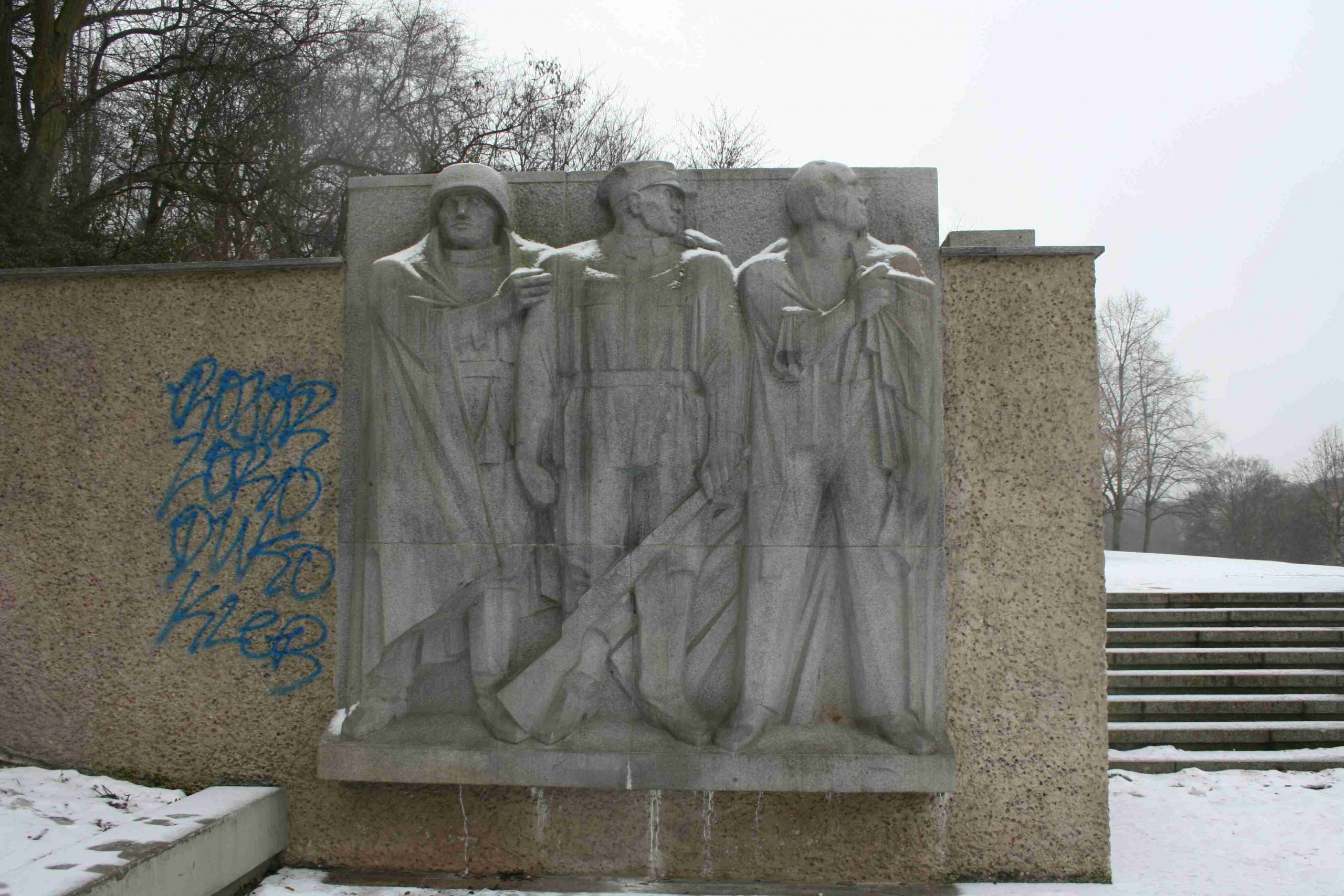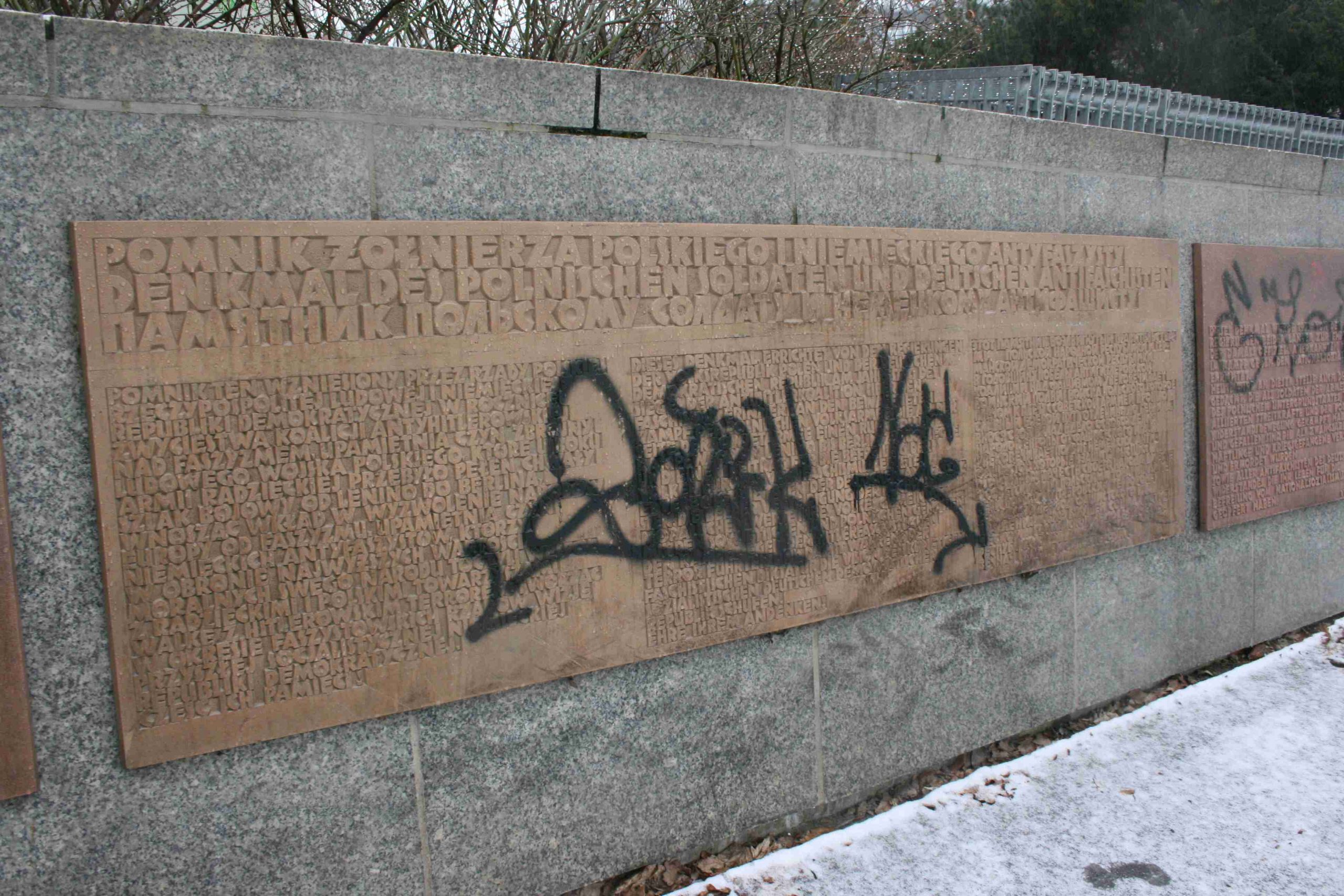 »DENKMAL DES POLNISCHEN SOLDATEN UND DEUTSCHEN ANTIFASCHISTEN / DIESES DENKMAL ERRICHTET VON DEN REGIERUNGEN / DER VOLKSREPUBLIK POLEN UND DER DEUTSCHEN / DEMOKRATISCHEN REPUBLIK AM JAHRESTAG DES / SIEGES DER ANTIHITLERKOALITION UEBER DEN / FASCHISMUS ERINNERT AN DEN BEWAFFNETEN KAMPF DER POLNISCHEN VOLKSARMEE, DIE AN DER / SEITE DER SOWJETARMEE EINEN RUHMVOLLEN / KAMPFWEG VON LENINO BIS BERLIN ZURÜCKLEGTE / UND EINEN BEITRAG FÜR DIE BEFREIUNG DER / VOELKER EUROPAS VOM FASCHISMUS LEITETE / ES VEREWIGT DIE TATEN DER DEUTSCHEN ANTIFASCHI- / STEN DIE BEI DER VERTEIDIGUNG DER HÖCHSTEN / DEMOKRATISCHEN WERTE IHRES VOLKES GEMEINSAM / MIT DEN SOWJETISCHEN UND POLNISCHEN GENOSSEN / DEN KAMPF GEGEN DEN HITLERFASCHISTISCHEN / TERROR FÜHRTEN UND DAMIT WÄHREND DER / FASCHISTISCHEN DIKTATUR DIE VISION DER KÜNFTIGEN / SOZIALISTISCHEN DEUTSCHEN DEMOKRATISCHEN/REPUBLIK SCHUFEN. / EHRE IHREM ANDENKEN! / (diese Inschrift an gleichem Ort in russischer und polnischer Sprache)«