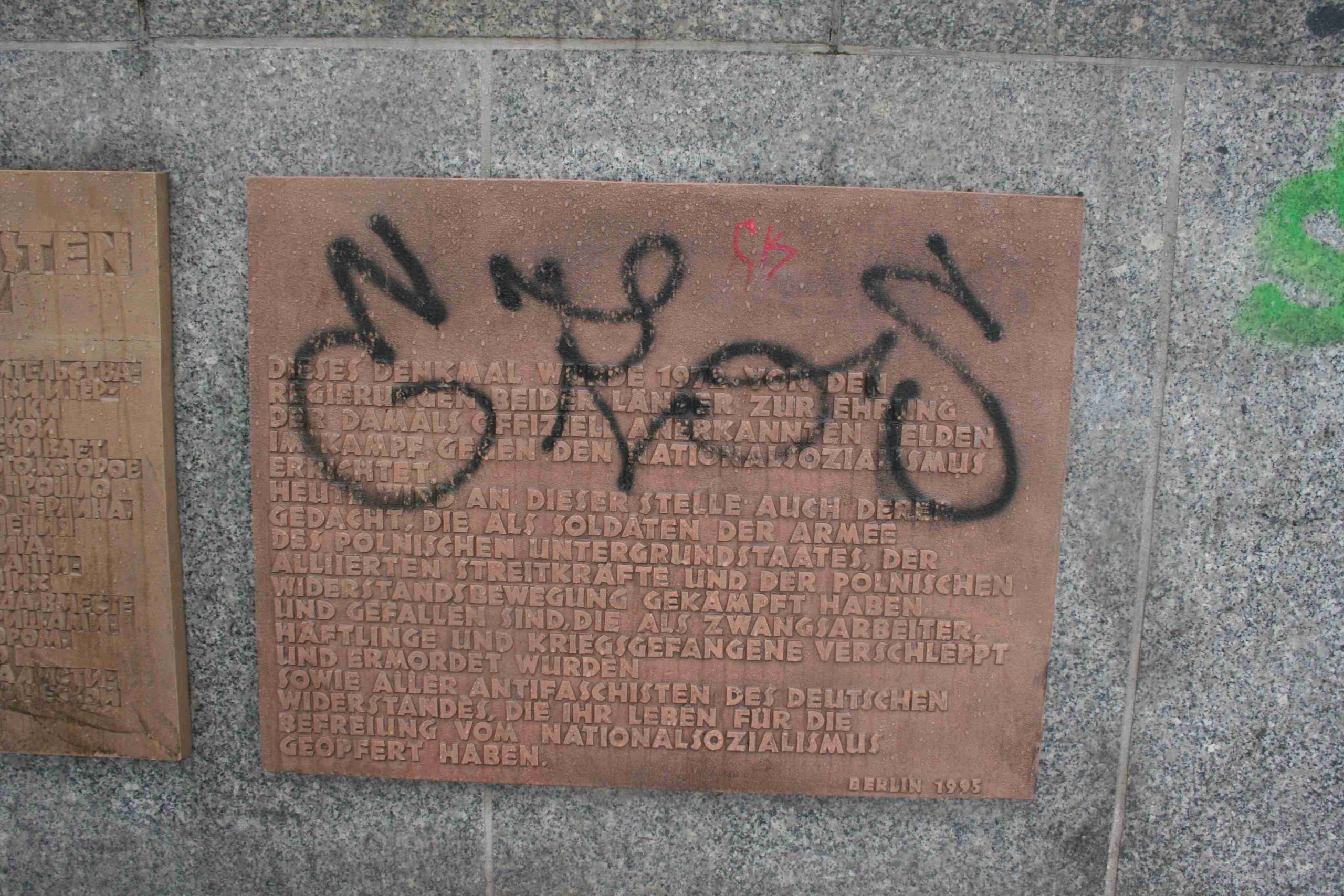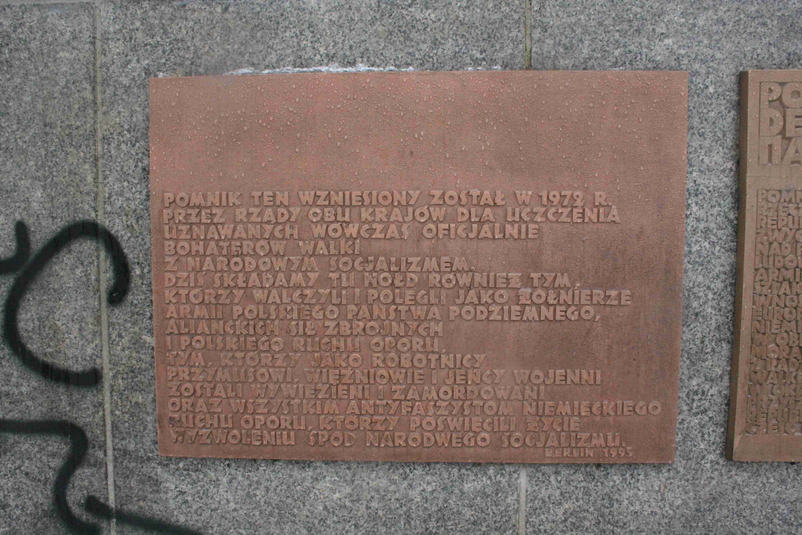»DIESES DENKMAL WURDE 1972 VON DEN / REGIERUNGEN BEIDER LÄNDER ZUR EHRUNG / DER DAMALS OFFIZIELL ANERKANNTEN HELDEN / IM KAMPF GEGEN DEN NATIONALSOZIALISMUS ERRICHTET. / HEUTE WIRD AN DIESER STELLE AUCH DERER / GEDACHT, DIE ALS SOLDATEN DER ARMEE / DES POLNISCHEN UNTERGRUNDSTAATES, DER ALLIIERTEN STREITKRÄFTE UND DER POLNISCHEN / WIDERSTANDSBEWEGUNG GEKÄMPFT HABEN / UND GEFALLEN SIND, UND ALS ZWANGSARBEITER, / HÄFTLINGE UND KRIEGSGEFANGENE VERSCHLEPPT / UND ERMORDET WURDEN / SOWIE ALLER ANTIFASCHISTEN DES DEUTSCHEN / WIDERSTANDES, DIE IHR LEBEN FÜR DIE / BEFREIUNG VOM NATIONALSOZIALISMUS / GEOPFERT HABEN. BERLIN 1995«