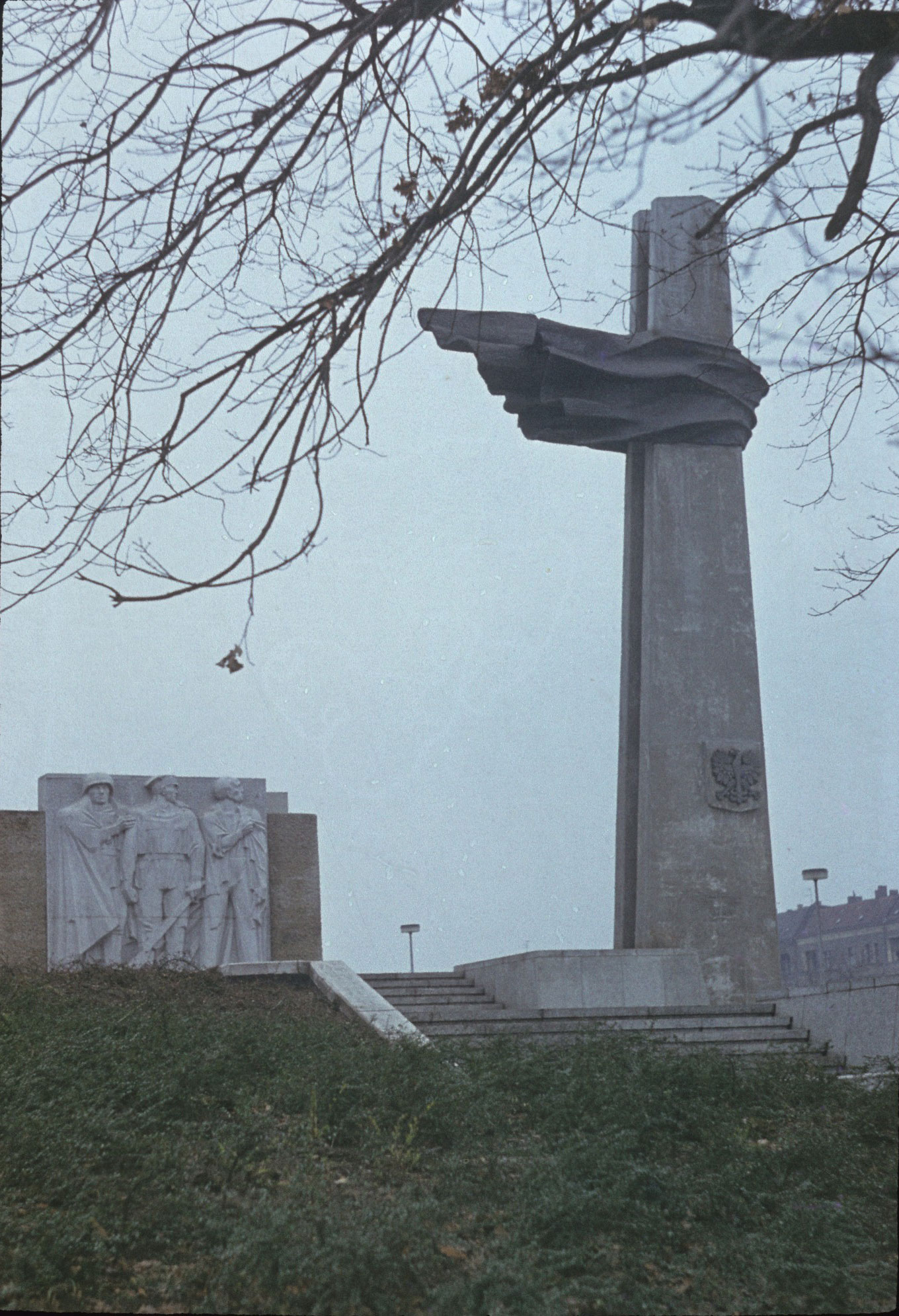 Dominantes Element der Anlage ist eine an auf einer erhöhten Terrasse aufgestellte hohen Stele, gefertigt als ein zweiteiliger grau gefasster Betonturm an dessen oberem Ende ein bronzenes wehendes Fahnentuch angebracht wurde. An den Seiten der Stele befinden sich die applizierten bronzenen Staatswappen der Volksrepublik Polen (Adler) auf der einen Seite und der DDR (Kranz mit Hammer und Sichel) auf der anderen Seite. Hinter der Stele wurde eine Betonstützmauer errichtet. An der Längsseite ist in Granit in monumentalen erhabenen Lettern eine Inschrift in deutscher und polnischer Sprache angebracht. Im rechten Winkel dazu ist ein weiterer Teil der Stützmauer errichtet worden, der mit grobem Waschbeton verkleidet wurde. Darin eingelassen ist ein Relief mit der Darstellung dreier Soldaten, dargestellt als die Repräsentanten der sowjetisch-polnisch-deutschen Kampfgemeinschaft (ein polnischer, ein deutscher und ein sowjetischer Antifaschist). Auf einer in die untere Terrasse eingeschobenen weiteren Terrasse in der mittleren Denkmalsebene steht ein rechteckiger Sockel aus Granit, darauf wurde ein rundes zweistufiges Bronzeobjekt mit strahlenförmiger Oberfläche platziert. Der Deckel ist abzuschrauben, hier kann eine ewige Flamme platziert werden. An der untersten nach Osten weisenden mit Granitplatten verkleideten Stützmauer sind drei Schrifttafeln aus rötlichem Kunststein mit erhabener Schrift angebracht. Die mittlere (zur ursprünglichen Gestaltung des Denkmals gehörend) trägt in polnischer, deutscher und russischer Sprache eine Inschrift (Susanne Kähler, Jörg Kuhn).