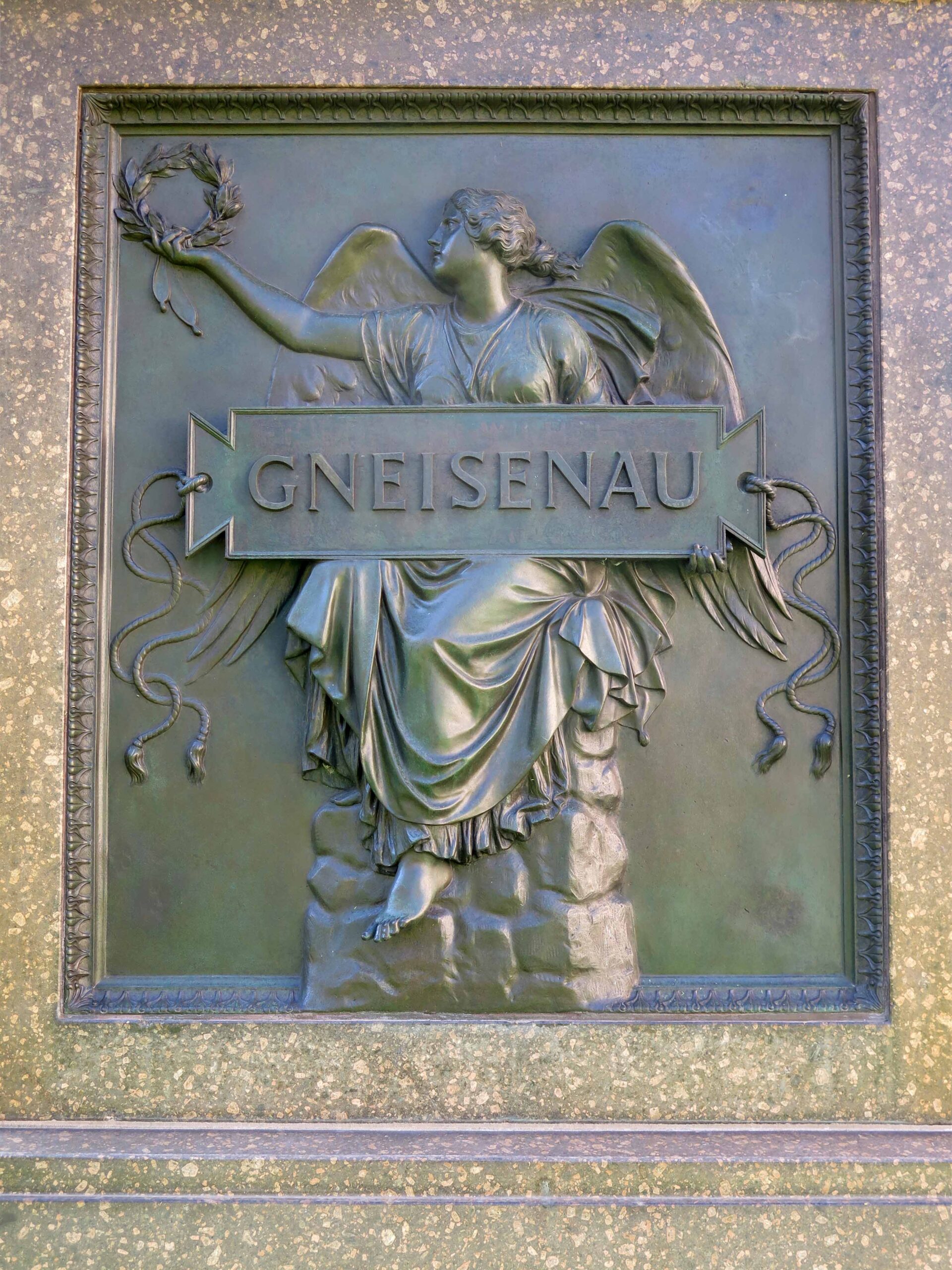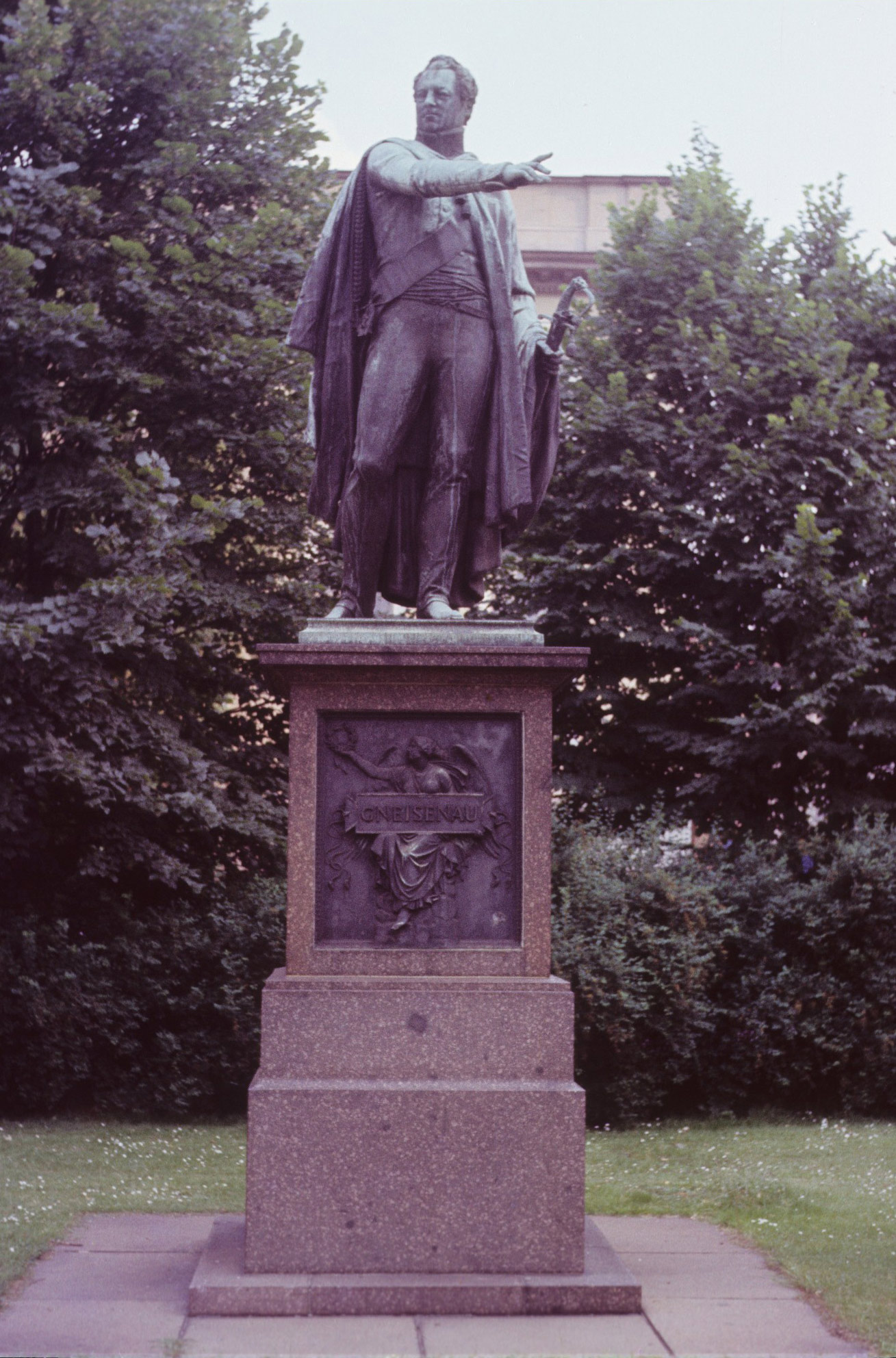 Bronzenes Standbild des Heeresreformers Feldmarschall August Wilhelm Anton Graf Neithardt von Gneisenau (1760-1831) auf dreizonigem Granitsockel mit zwei eingelassenen Bronzereliefs, errichtet über quadratischem Grundriss; Gneisenau ist in zeitgenössischer Uniform mit Umhangmantel dargestellt. Mit der rechten Hand weist er erklärend nach vorn, in der Linken trägt er seinen Säbel. Der Kopf ist schräg nach rechts gewendet. Das Relief am Sockel vorne zeigt eine sitzende Viktoria mit Tabula und Lorbeerkranz. Das rückseitige Relief zeigt das Wappen Gneisenaus mit heraldischer Zierrahmung (Jörg Kuhn).