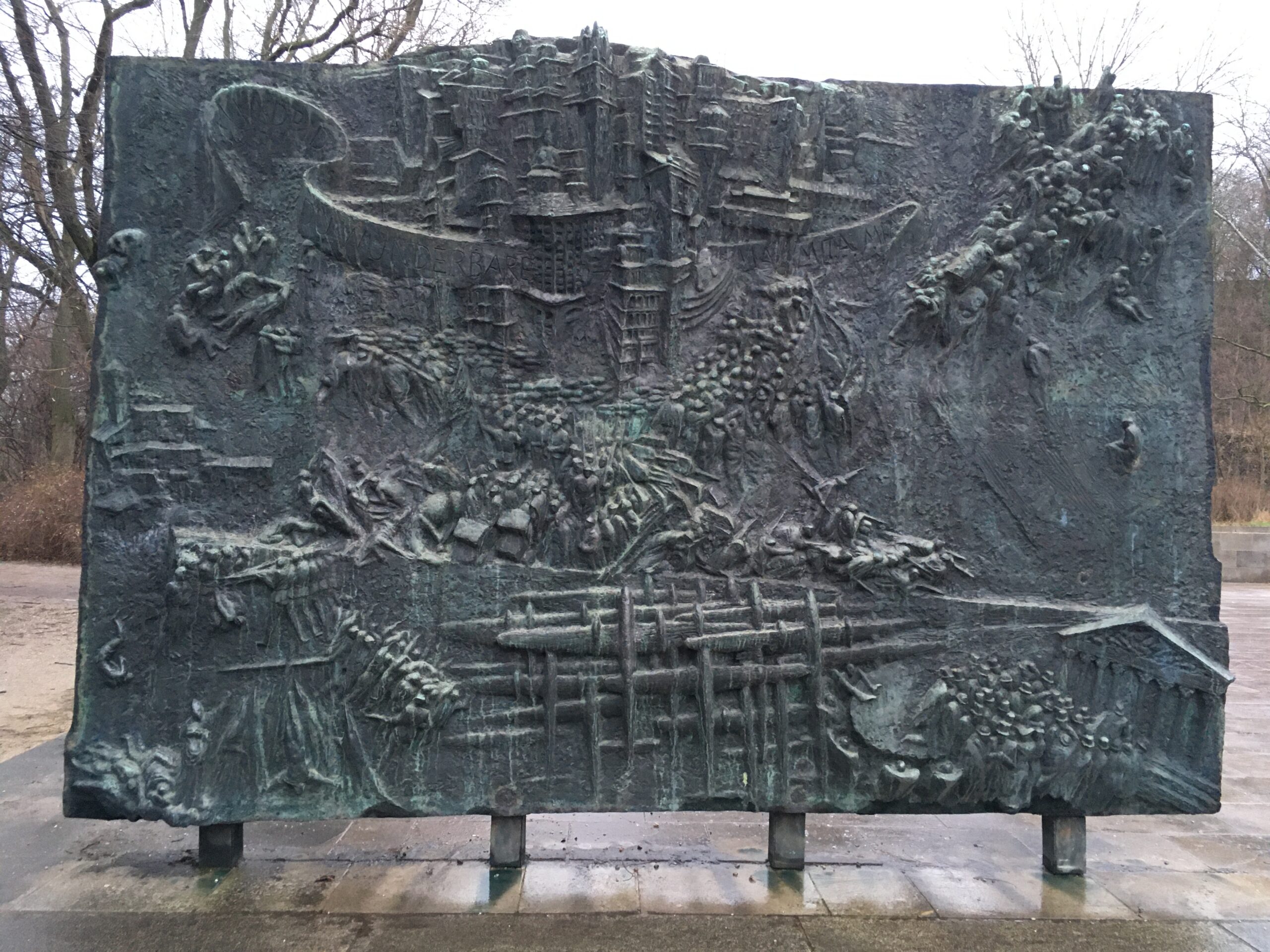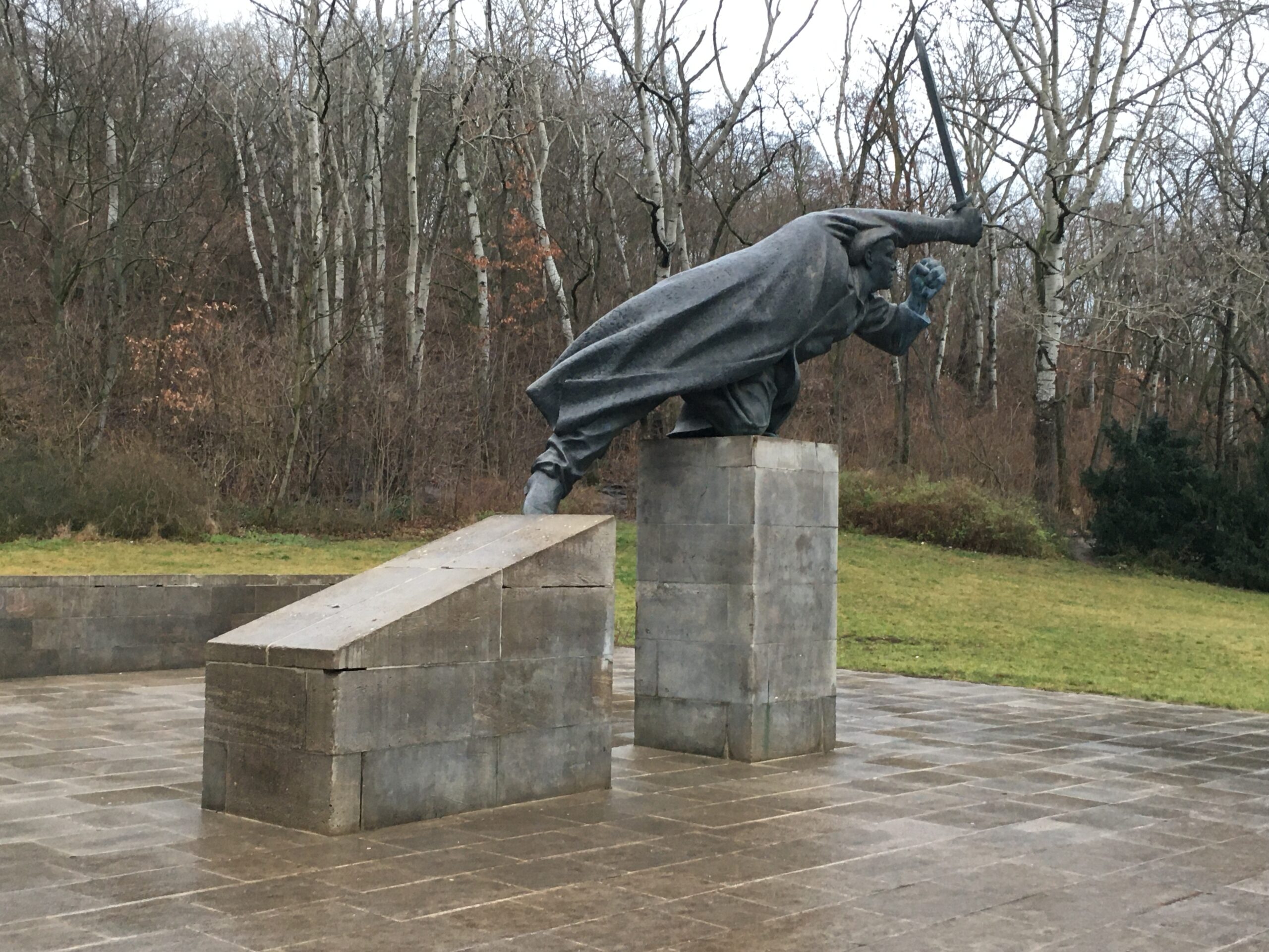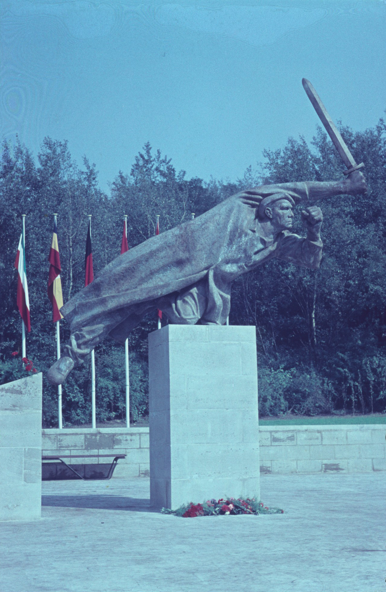 Entstanden im Auftrag des Komitees der Spanienkämpfer der Vereinigung der Verfolgten des Naziregimes. Grundsteinlegung der Anlage Mitte Mai 1966 anlässlich des 30. Jahrestages des Beginns des Spanischen Bürgerkrieges (1936-39), in dem ausländische Brigaden auf Seiten der Republik kämpften. Die DDR leitete ihre militärische Tradition sowie ihre historische Legitimation von der Beteiligung deutscher Kommunisten und Sozialisten an den Internationalen Brigaden ab. Die Inschrift auf der Bronzetafel, die bis zur Entfernung nach 1993 in der Mitte der auf die Stufen der Treppe lag: "Ruhm und Ehre den dreitausend / deutschen Antifaschisten, / gefallen 1936-1939 im Freiheitskampf / des spanischen Volkes. / Sie kämpften in den Reihen der / glorreichen Internationalen Brigaden / gegen den spanischen, deutschen / und italienischen Faschismus, / für die Befreiung unserer Heimat / vom faschistischen Joch. / Ihr Kampf, beseelt von den großen Ideen / des proletarischen Internationalismus / und wahren Patriotismus, / bleibt unvergängliches Vorbild / der Jugend unseres sozialistischen Vaterlandes." Cremers "anachronistische", mit einem Schwert bewaffnete Figur solle, so der Künstler, "die Bereitschaft beim Betrachter" wecken, selbst zu kämpfen, nicht ihm Kampf vorzuführen." (Zitiert nach Schmidt 1972, S. 71) (Marc Wellmann). Stefanie Endlich (2007) weist darauf hin, dass die Figur zudem die Züge des Schauspielers und ehemaligen Spanienkämpfers Ernst Busch (1900-1980) trägt. Vielfach wurde in der Literatur auch auf die Verwandtschaft der Figur mit Arbeiten Ernst Barlachs hingewiesen, insbesondere mit Barlachs „Der Rächer“, der 1914 kurz nach Kriegsbeginn entstanden war und der in seiner Dynamik und der diagonalen Komposition Ähnlichkeiten zur Figur Cremers aufweist. Ernst Barlach galt neben Käthe Kollwitz in der frühen DDR-Zeit als künstlerische Leitfigur, eine Rolle, die nach der 1951 in der „Formalismus-Debatte“ von der SED-Regierung formulierten Vorgabe in der Bildhauerkunst unterbunden werden sollte. Die Akademie der Künste versuchte sich gegen diese Vorgabe zu wehren. Das Denkmal in Friedrichshain wurde am 07. September 1968 eingeweiht, anwesend waren das Diplomatische Korps, 300 ehemalige deutsche Spanienkämpfer sowie Interbrigadisten aus 15 europäischen Ländern. Die Zahl der Kundgebungs-Teilnehmer wird mit 12.000 angegeben. Im Erläuterungsbericht der Bauakte (Vgl. Denkmaltopografie, 1996) wurde die unmittelbare Lage an der Straße damit begründet, dass „unmittelbare Kontakte zu den Menschen im angrenzenden neuen Wohngebiet“ herzustellen waren. In den Jahren nach der Aufstellung wurden größere Aufmärsche hier veranstaltetet, z. B. von Veteranen und von Schülern. Es fanden Eröffnungen und Abschlussfeiern von Jugendsportwettkämpfen hier statt, denn den jungen Sportlern sollte ein „direktes Vorbild körperlichen Einsatzes“ vor Augen gestellt werden (Erläuterungsbericht der Bauakte). 1992 wurde ein Sprengstoffanschlag auf das Monument verübt, gefolgt von einer Wiederherstellung. Die Inschriftentafel vor dem Spanierkämpfer ist nach 1993 ausgetauscht worden. Die von der Senatsverwaltung für kulturelle Angelegenheiten eingesetzte „Kommission zum Umgang mit den politischen Denkmälern der Nachkriegszeit im ehemaligen Ost-Berlin“ bewertete 1993 die Arbeit Cremers und die Ergänzungen Krepps sowie die Schrifttafel als „qualitätvolle Arbeit“, die „das historische Geschehen weniger heroisiert als vielmehr in seiner ganzen Tragik vermittelt“. Ein ähnlich bemerkenswertes Denkmal für Spanienkämpfer gäbe es nicht. Allerdings läge die ursprüngliche Tafelinschrift, die die Spanienkämpfer als „ (…) Vorbild der Jugend unseres sozialistischen Vaterlandes“ verklärt, im Bereich der Geschichtsfälschung. Es wird auch verschwiegen, dass zahlreiche Kommunisten vom NKWD als so genannte „Trotzkisten“ umgebracht worden sind. Die Empfehlung der Kommission sah die Erhaltung des Denkmals wegen seines künstlerischen und historischen Ranges vor, die Texttafel sei entweder zu entfernen oder durch einen kommentierenden Hinweis zu ergänzen (Susanne Kähler).