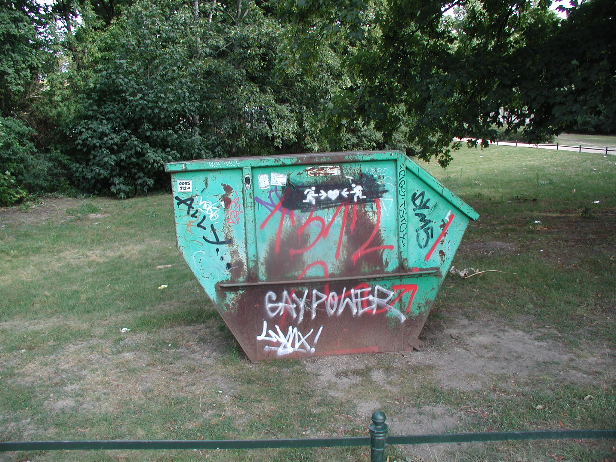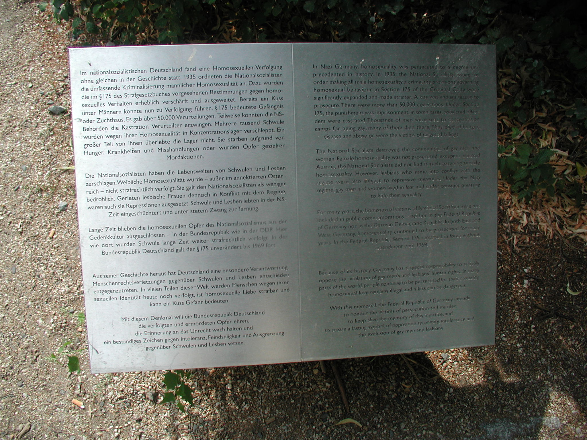 Denkmalbeschluss 2003; Einweihung am 27. Mai 2008. Film im Inneren nach verschiedenen Probephasen und Diskussionen vor einiger Zeit neu gestaltet bzw. zusammen gestellt. Während zu Beginn im wechselnden Turnus ein sich küssendes Männer-Paar und ein sich küssendes Frauen-Paar zu sehen waren, sind jetzt zwei gleichgeschlechtliche Männer- und Frauen-Paare vor Fotos aus dem historischen und gegenwärtigen Leben von Homosexuellen in Dauerschleife kurzhintereinanderweg zu sehen. Das Denkmal war schon häufiger von Vandalismus betroffen, wobei die Glasscheibe schon zerstört und stabiler ersetzt wurde, aber auch Schmierereien vorkamen, zuletzt im Juni 2019.